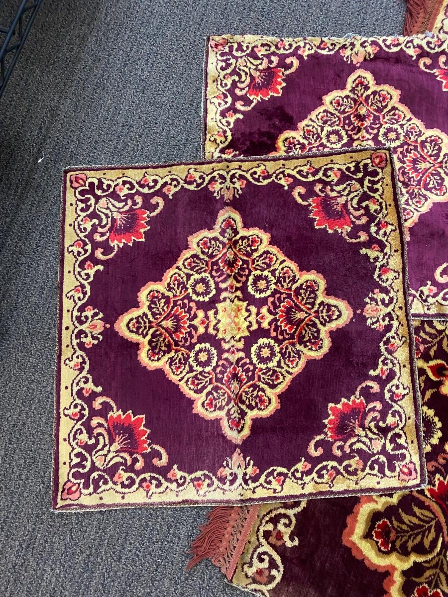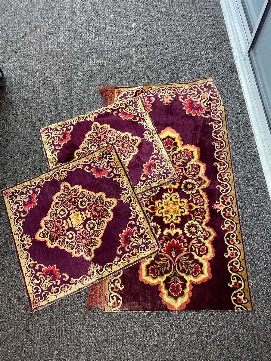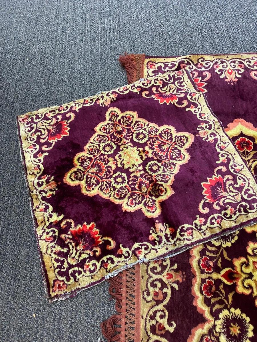 Vintage Velvet Flocked Medallion Print Table Runner Squares. May have been made from a larger piece. Some discolor from age. The rectangular piece is fringed on one edge and cut off center.