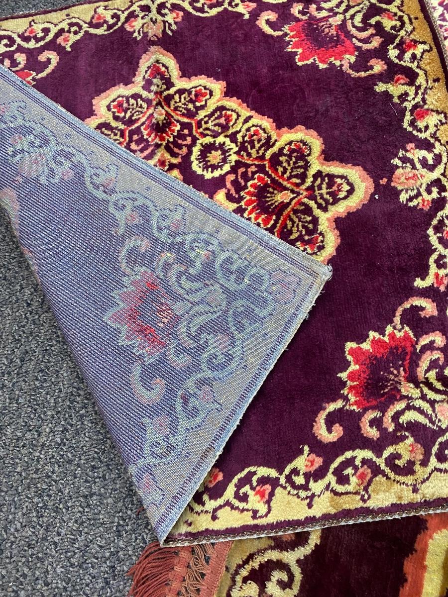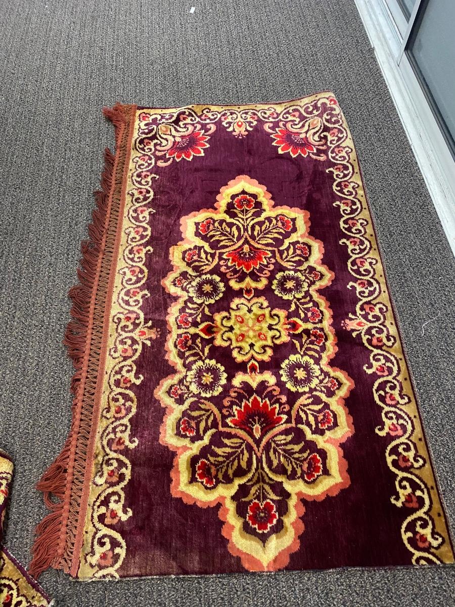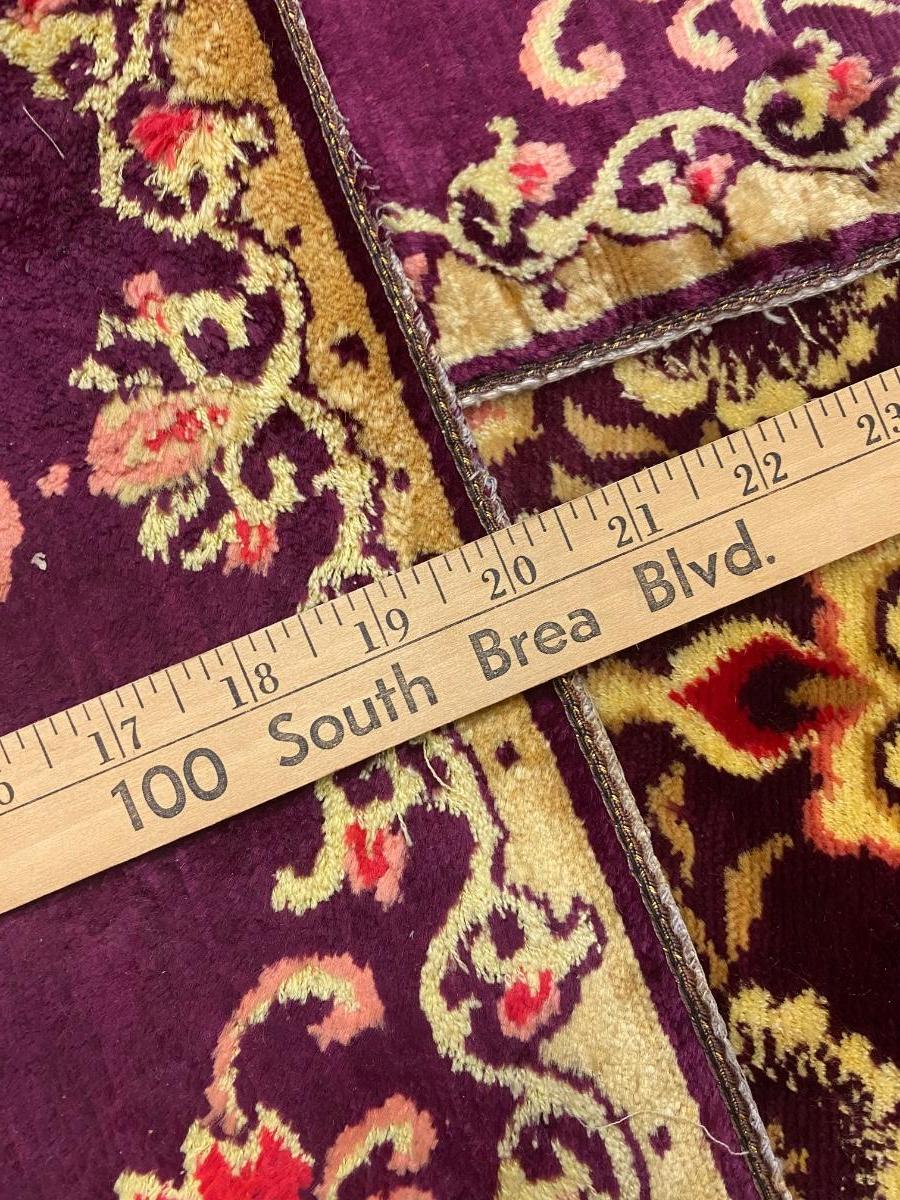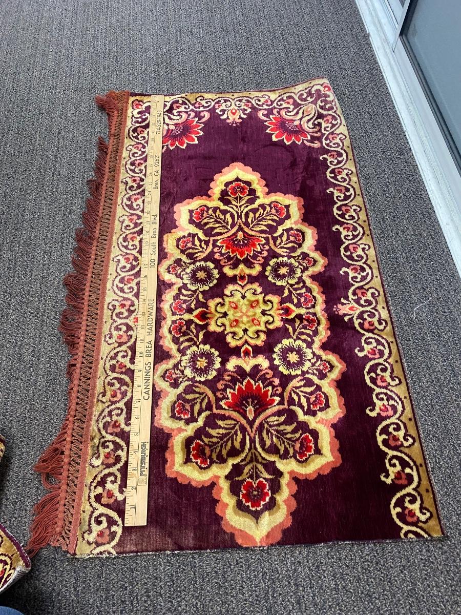 Vintage Velvet Flocked Medallion Print Table Runner Squares. May have been made from a larger piece. Some discolor from age. The rectangular piece is fringed on one edge and cut off center.