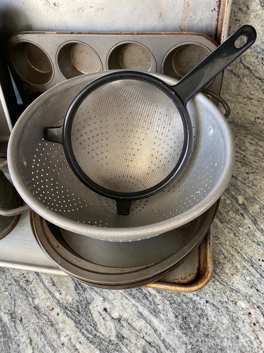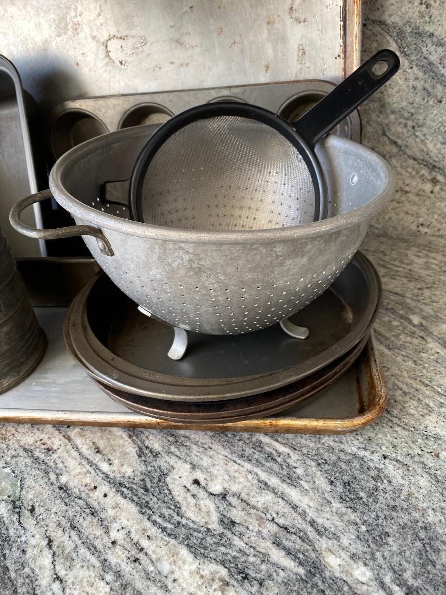 Mixed Lot of Metal Bakeware Cookie Sheets Cake Pans Sifter Strainers. In used condition.