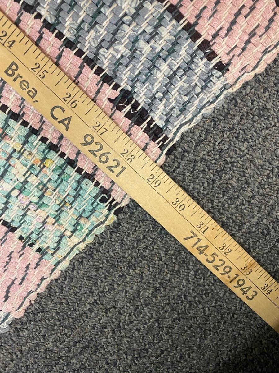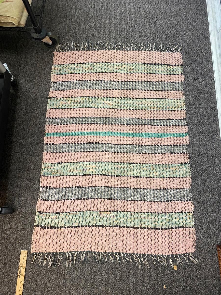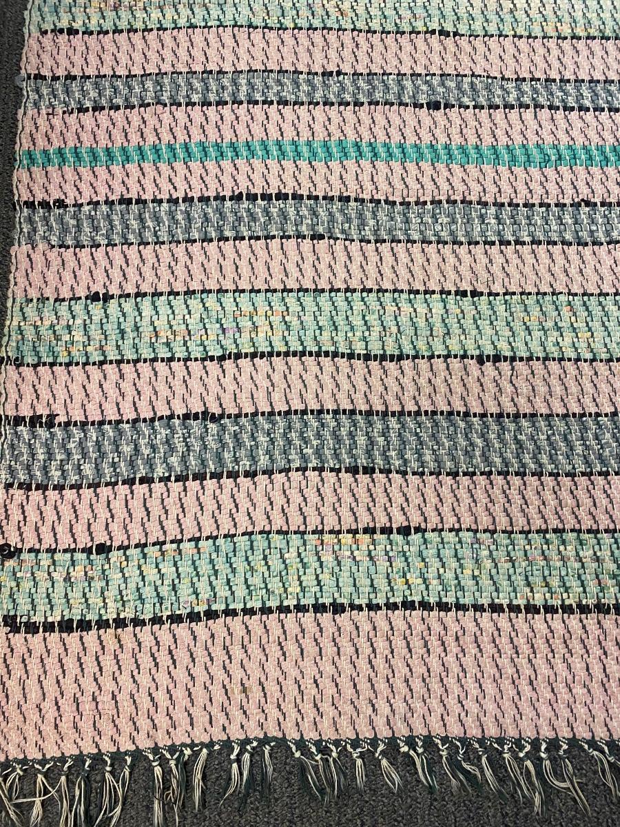 Vintage Pink and Teal Green Fringed Edge Throw Rug Mat. In good used condition.