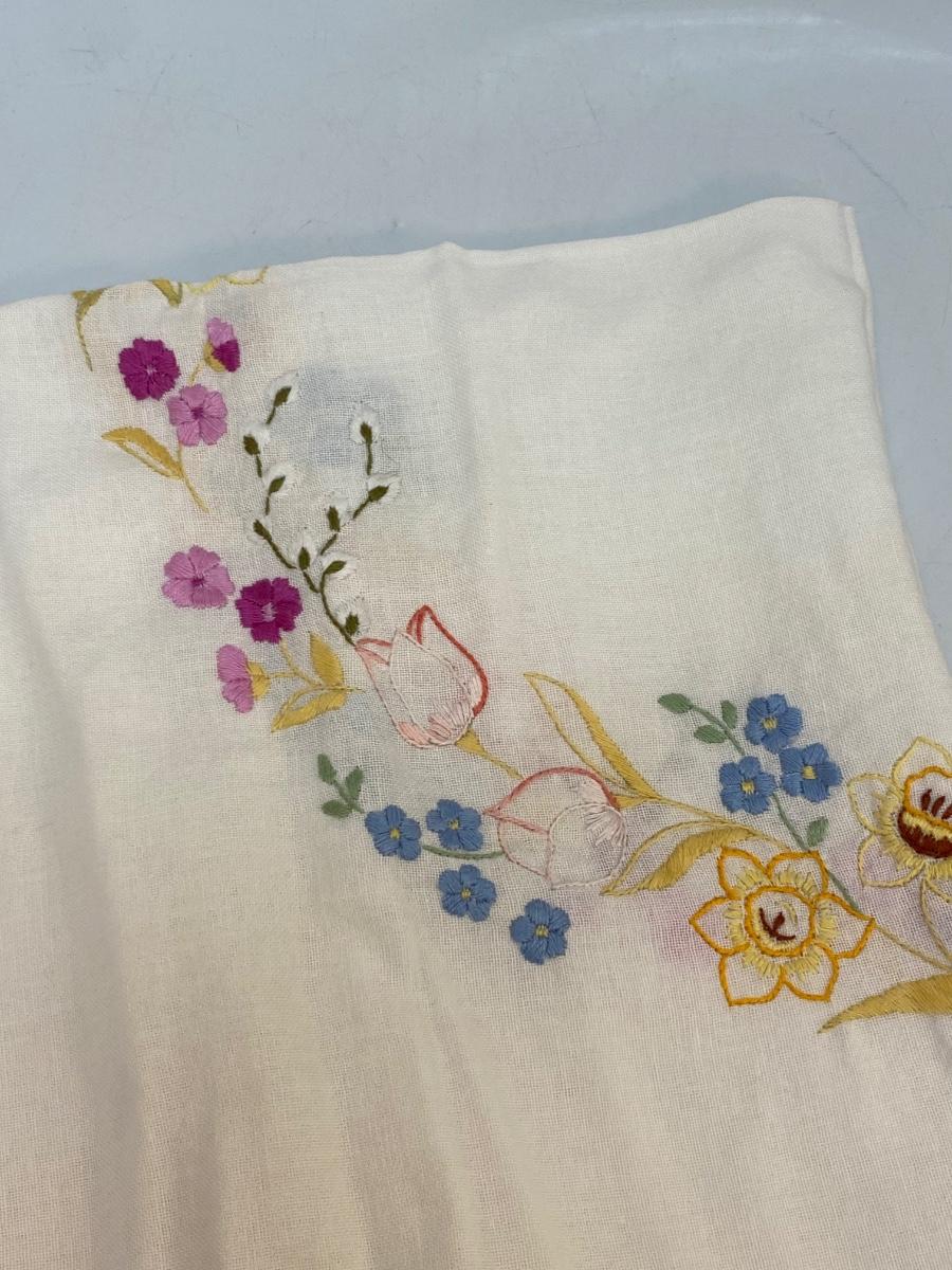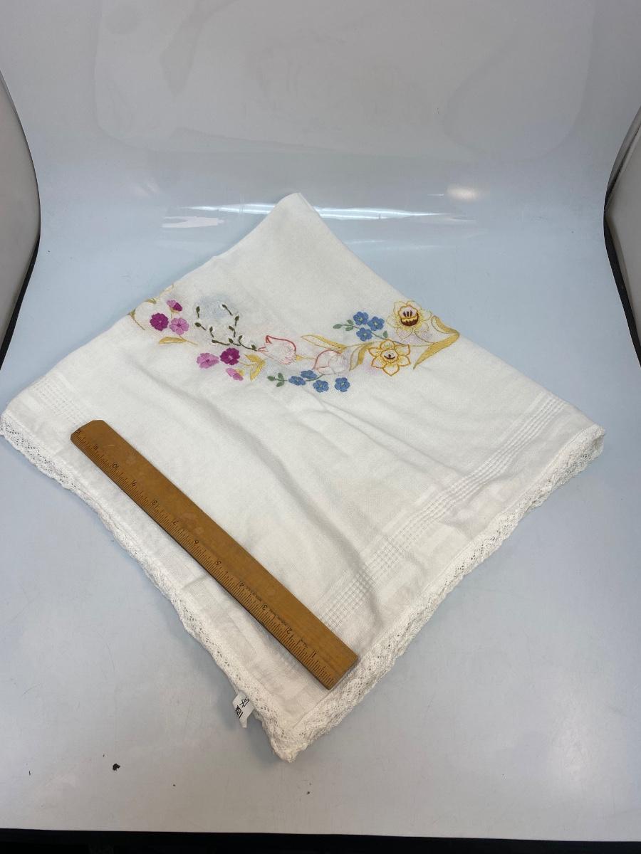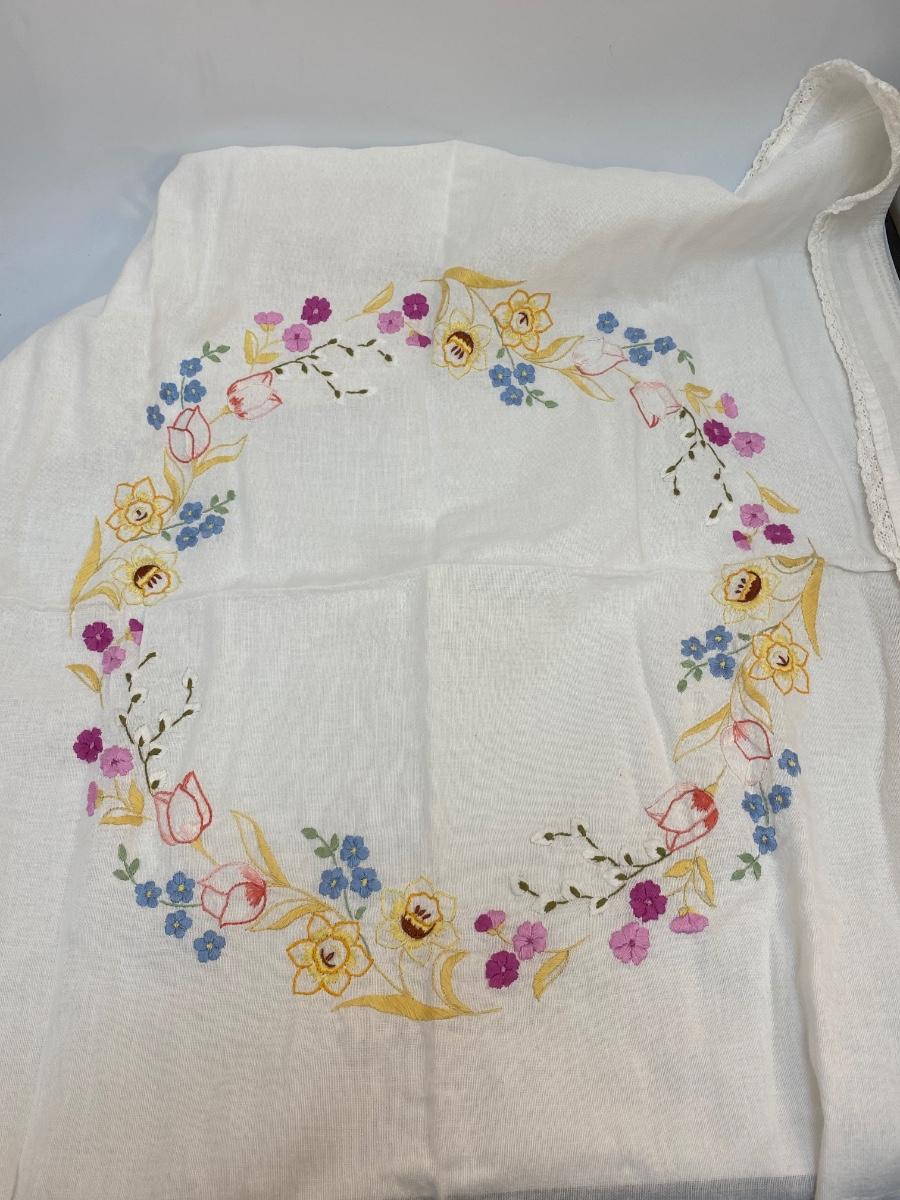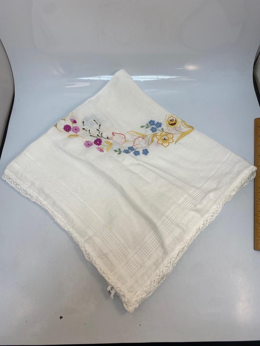 Vintage Floral Wreath Embroidered White Small Square Tablecloth Linen. About 30" square. In good condition, no noticeable spots or stains.
