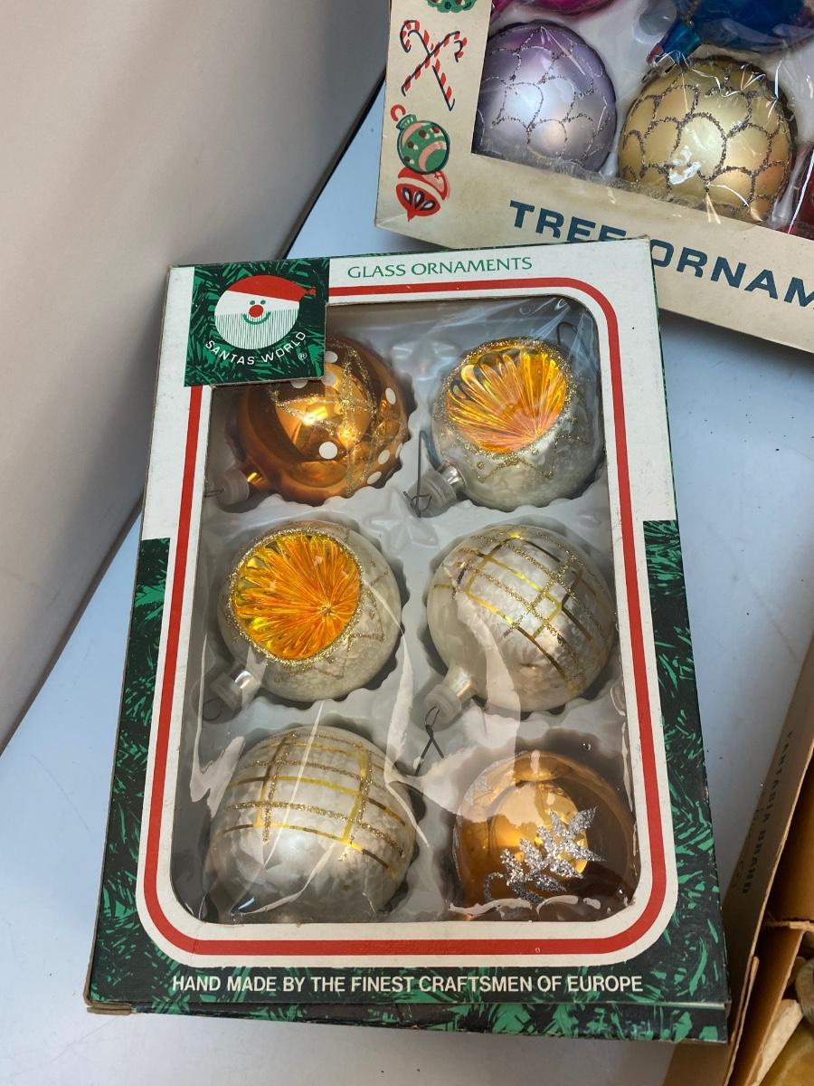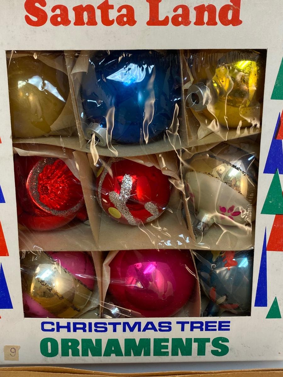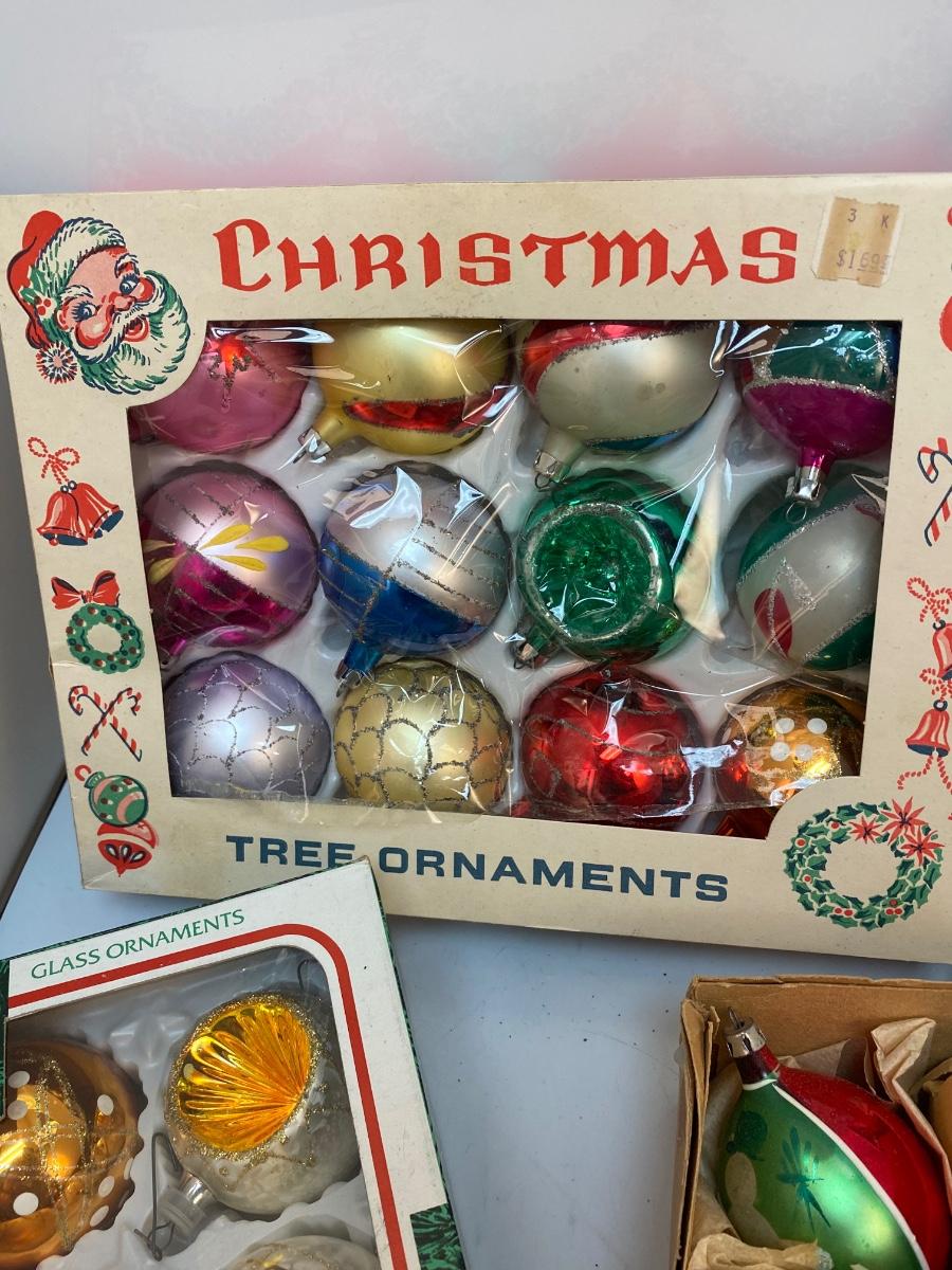 Mixed Style Lot of Vintage Glass Christmas Tree Holiday Ornaments Santa Land Shiny Brite. In good vintage condition.