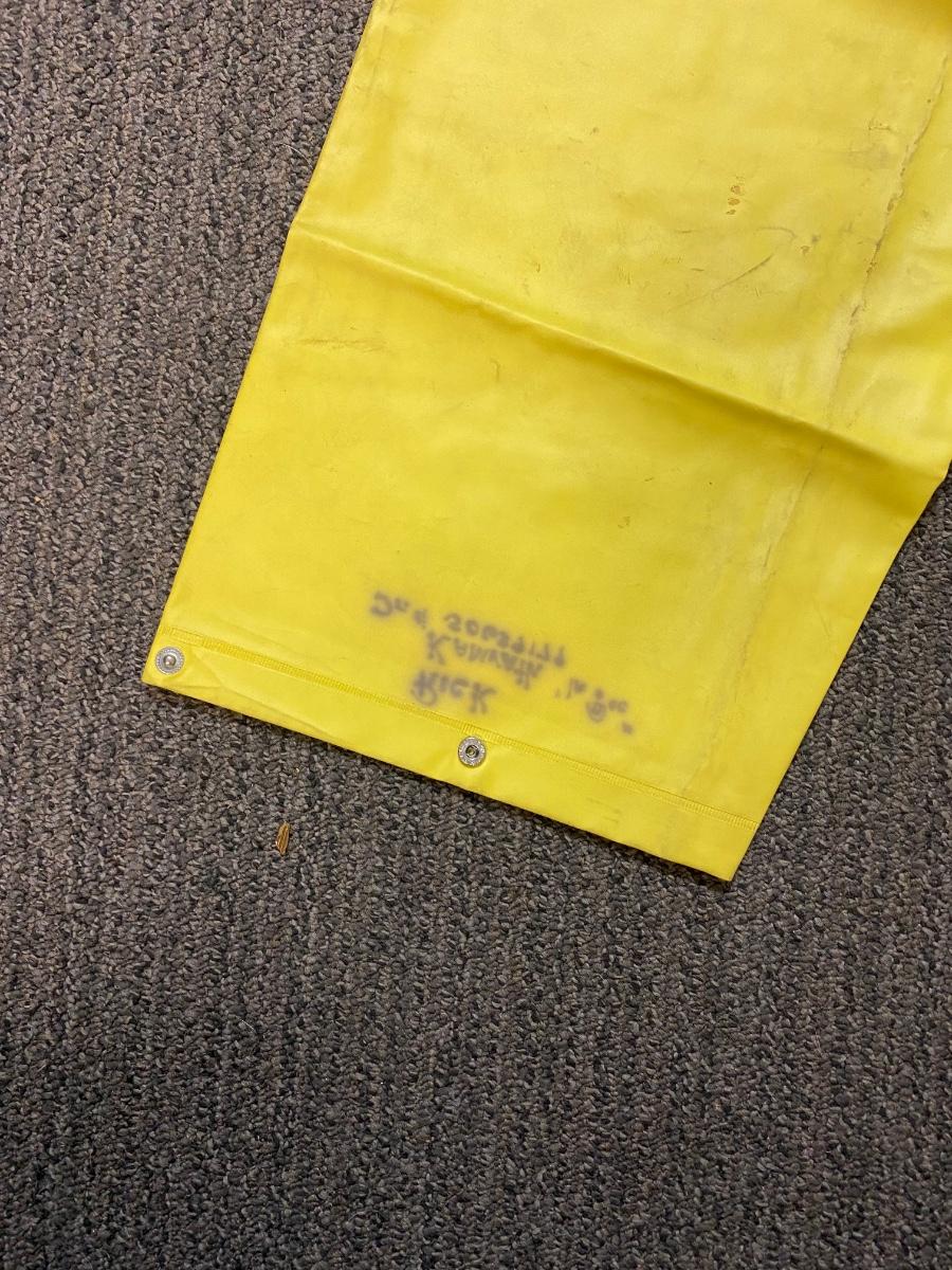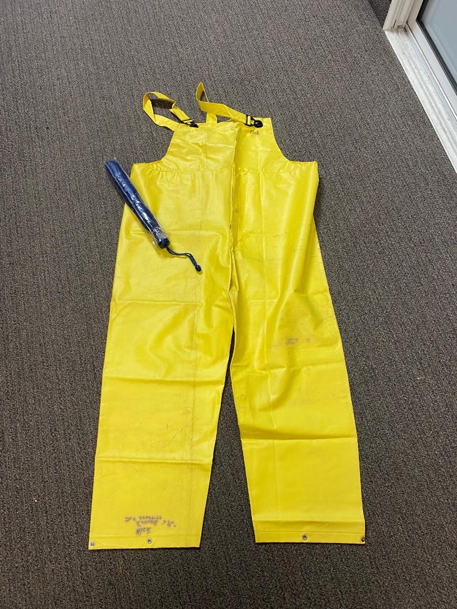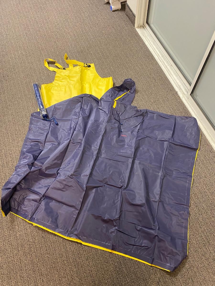Yellow Rain Slicker Overalls Poncho with Hood Umbrella Included. No size tags but the overalls look like a large/maybe XL.