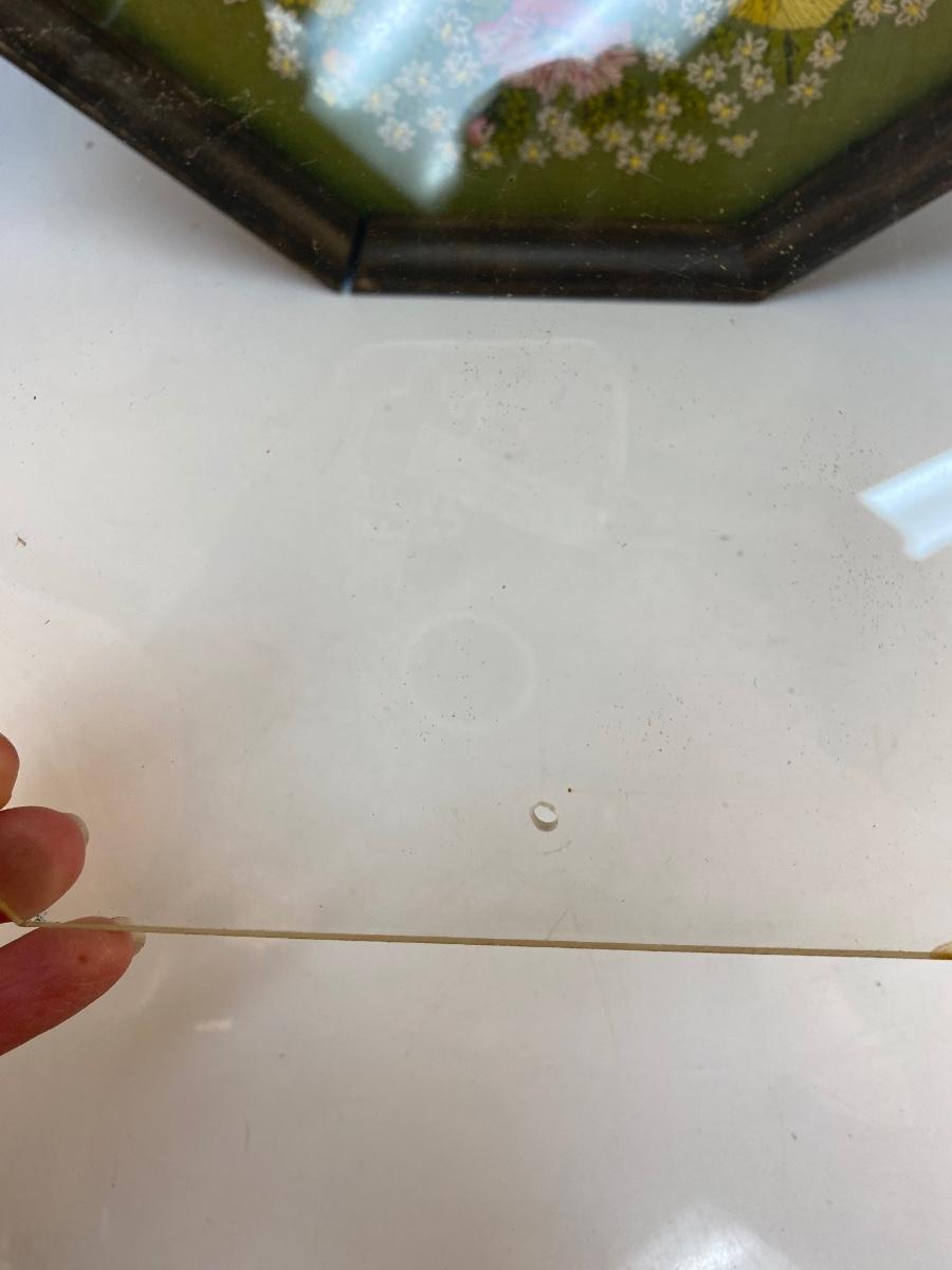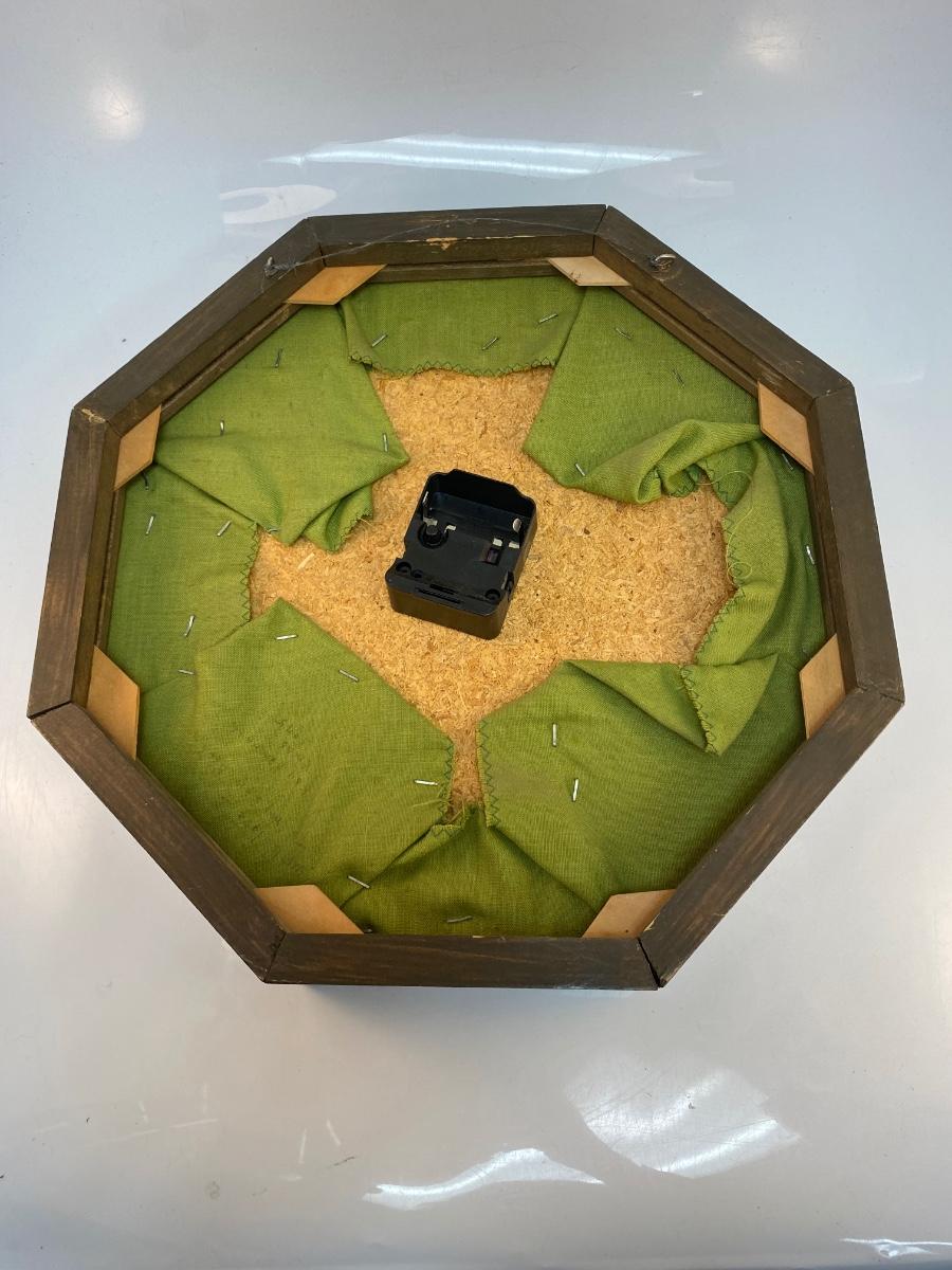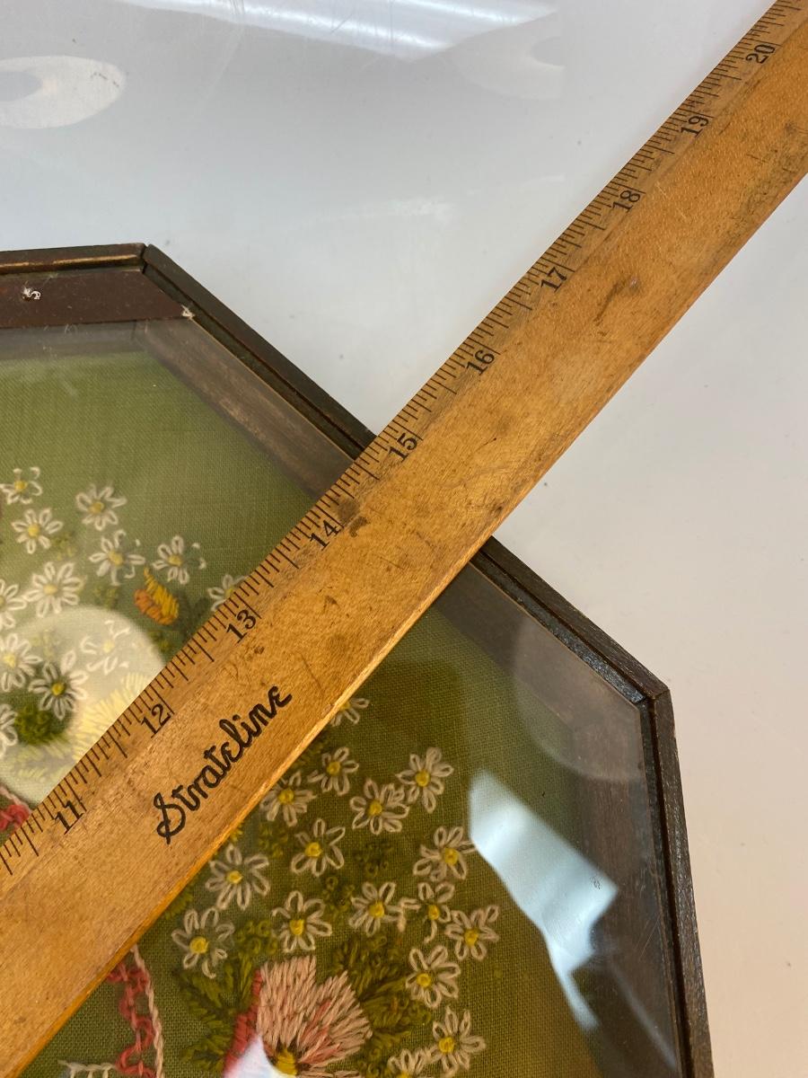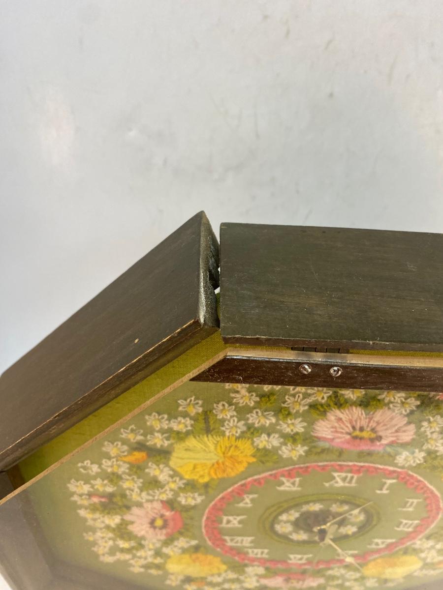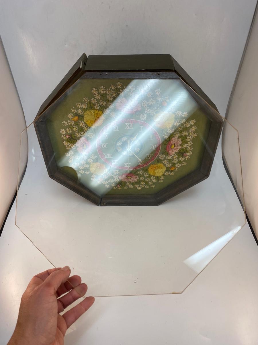 Vintage Hand Made Needlepoint Cross Stitch Floral Clock in Wooden Octagon Frame. Nicely hand stitched floral clock face. Has a plexiglass cover and wooden frame. Frame does need to be glued back into place on a couple joints. Battery operated, untested but battery terminal is clean. Handwritten note on back is faint, this was a gift from mother to son in 1975.