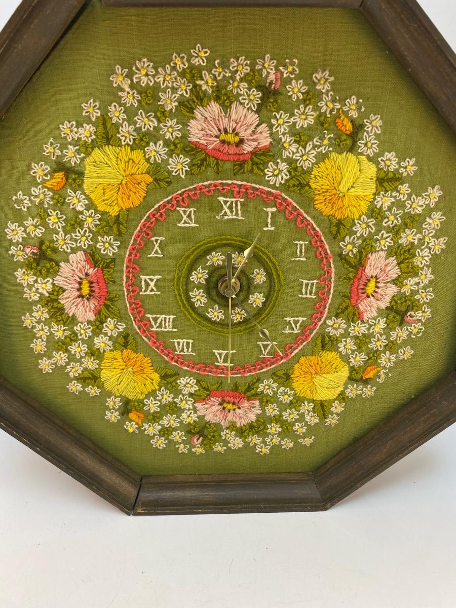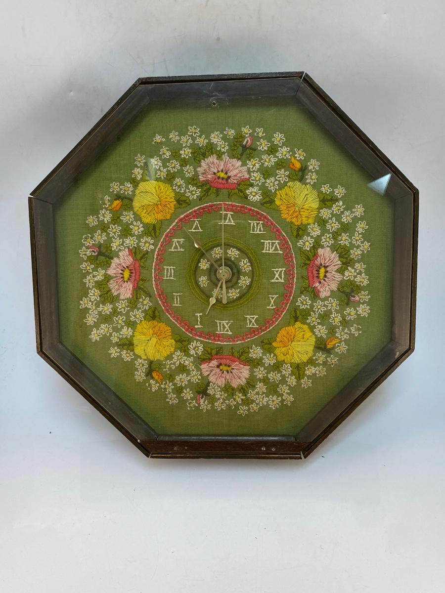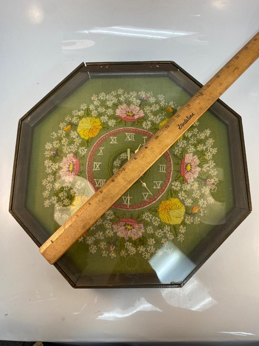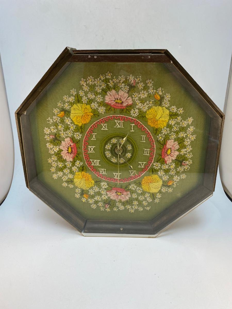 Vintage Hand Made Needlepoint Cross Stitch Floral Clock in Wooden Octagon Frame