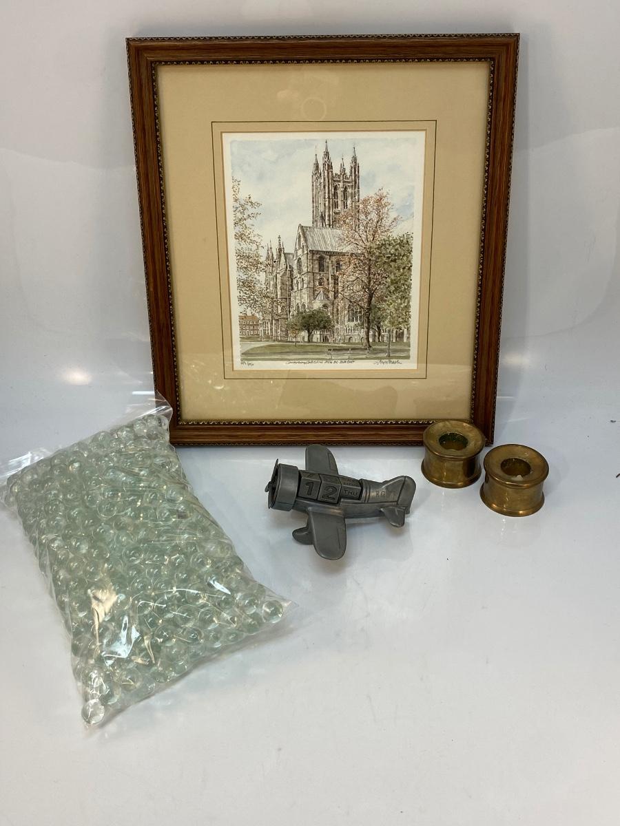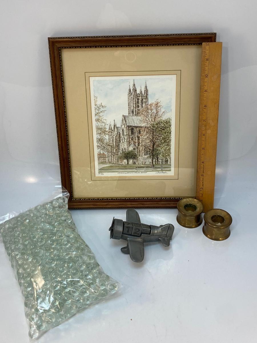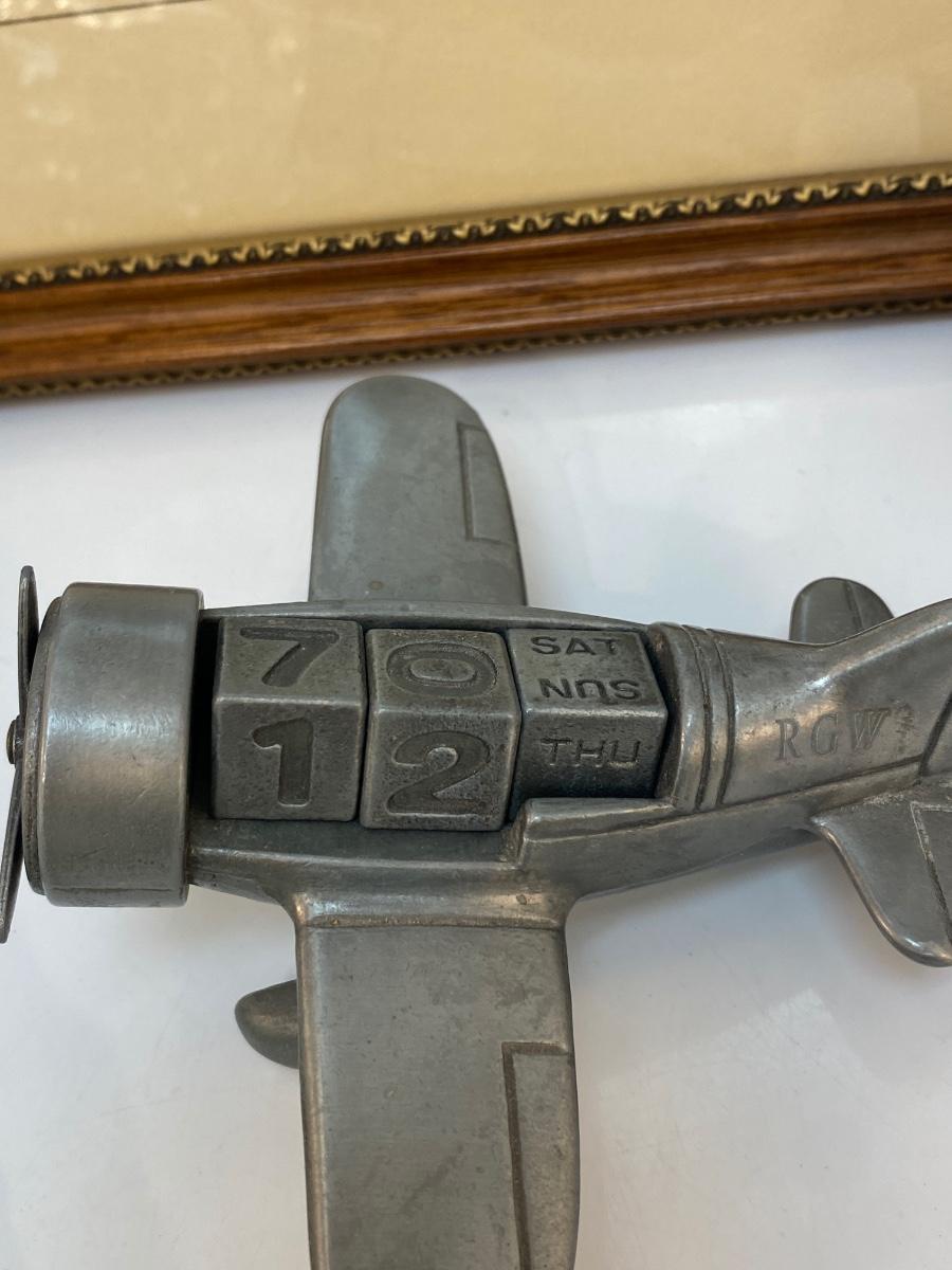 Mixed Lot of Home Decor Wall Art Brass Pewter. Everything in good condition. The airplane is a calendar, with day of week and date. Art is numbered and signed.