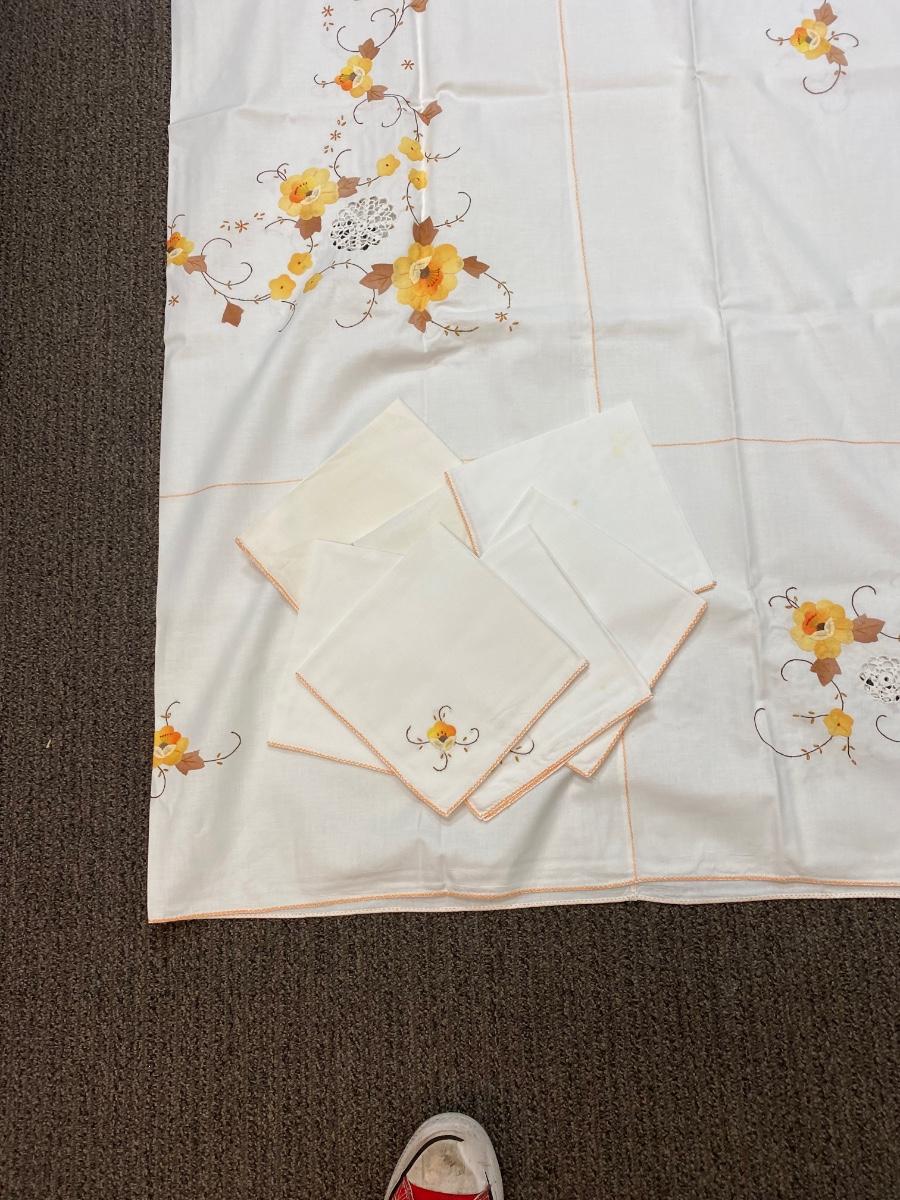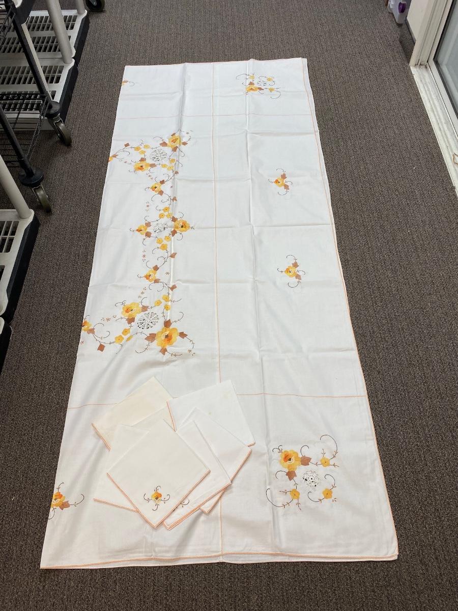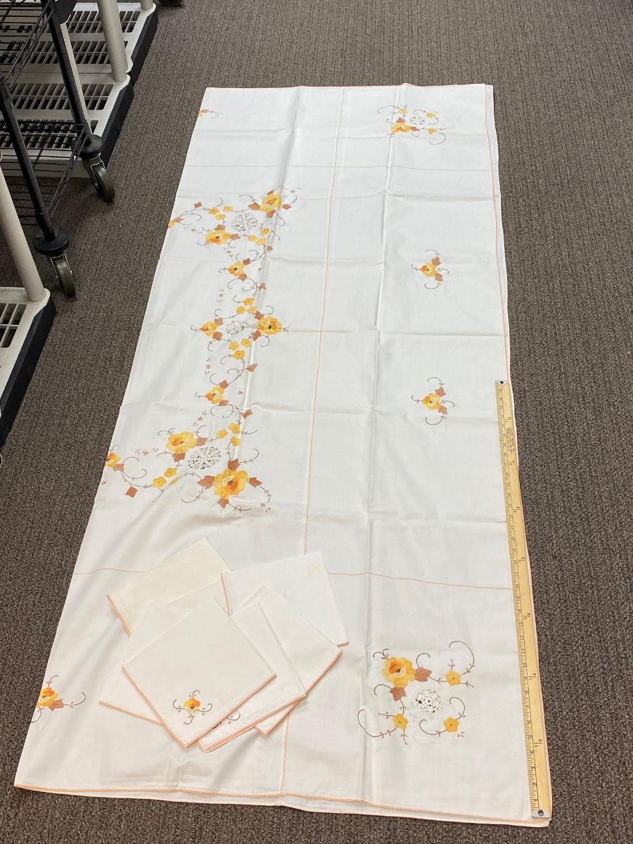 Vintage White Cotton Tablecloth with Orange Floral Applique & Matching Dinner Napkins. In good condition. A couple napkins have spots from use and there may be light discoloration, no major stains on tablecloth. About 6x8 size.