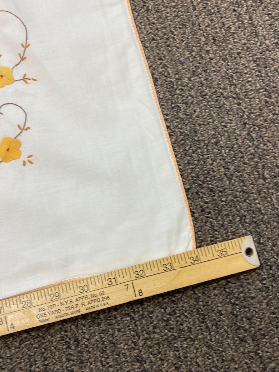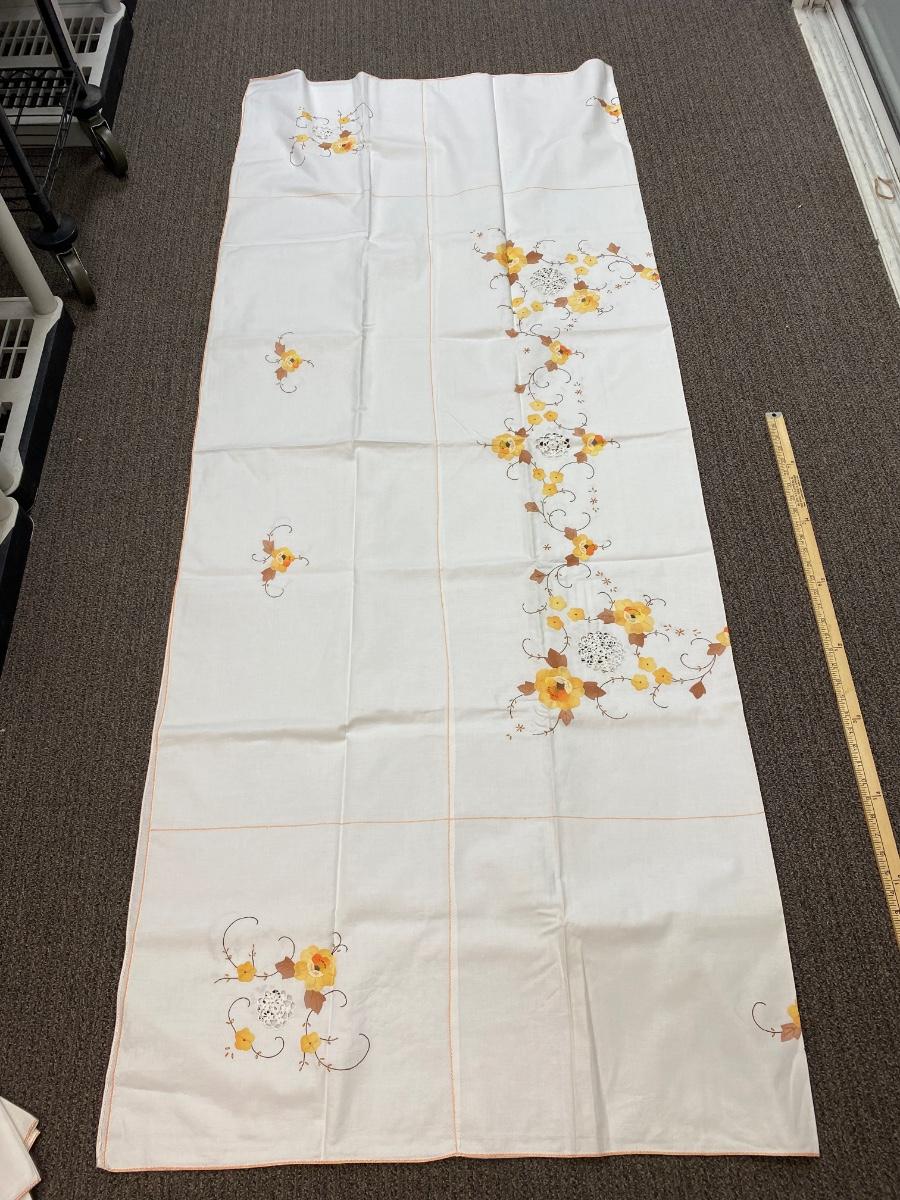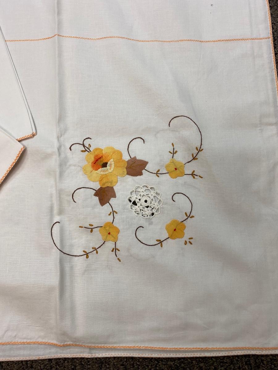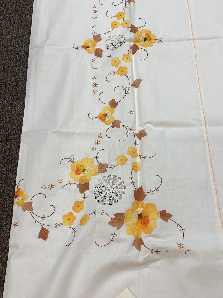 Vintage White Cotton Tablecloth with Orange Floral Applique & Matching Dinner Napkins. In good condition. A couple napkins have spots from use and there may be light discoloration, no major stains on tablecloth. About 6x8 size.