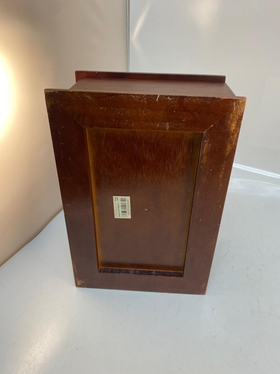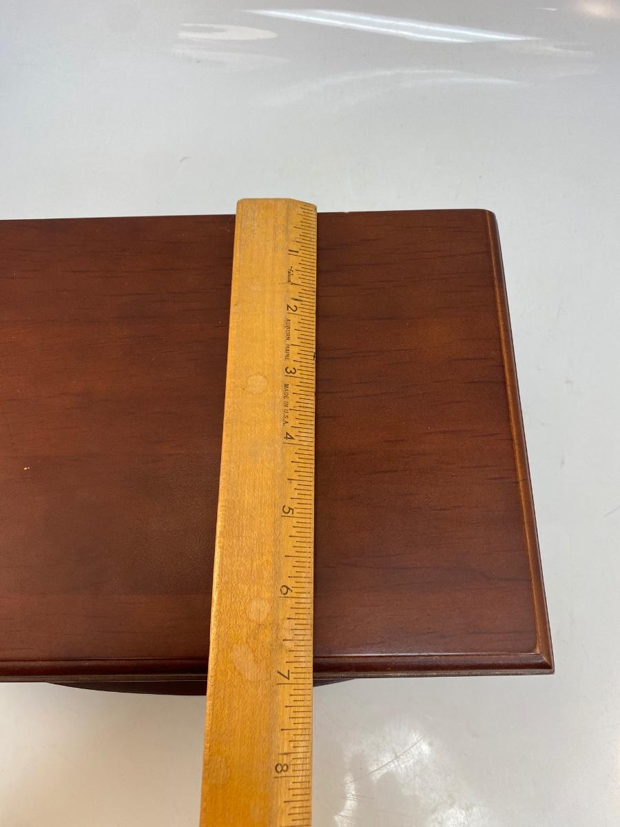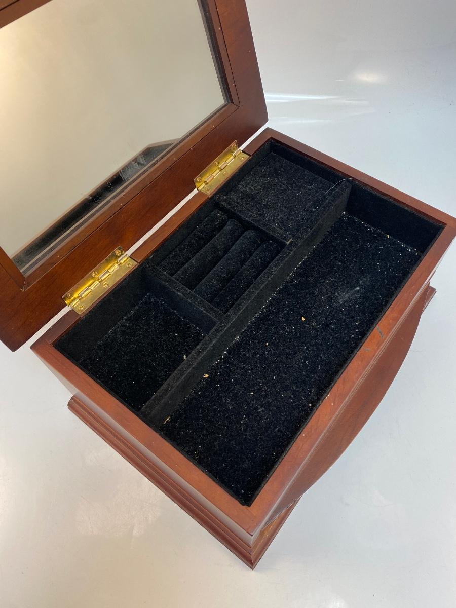 Wood Jewelry Trinket Box Mirrored Lid Bottom Drawer. In good used condition. Some minor signs of use. About 7"x10" size.