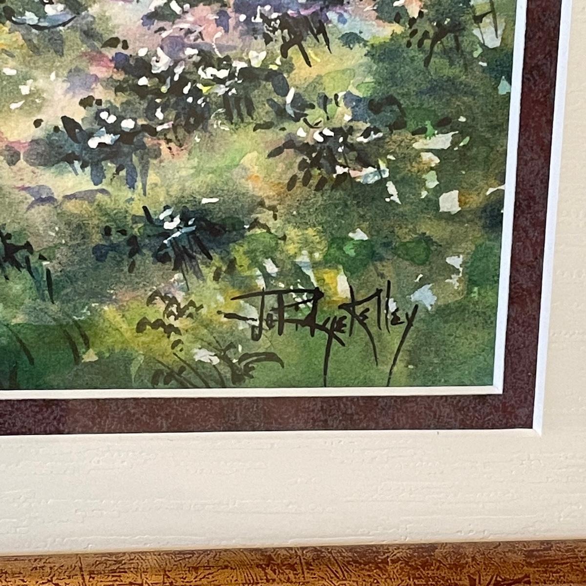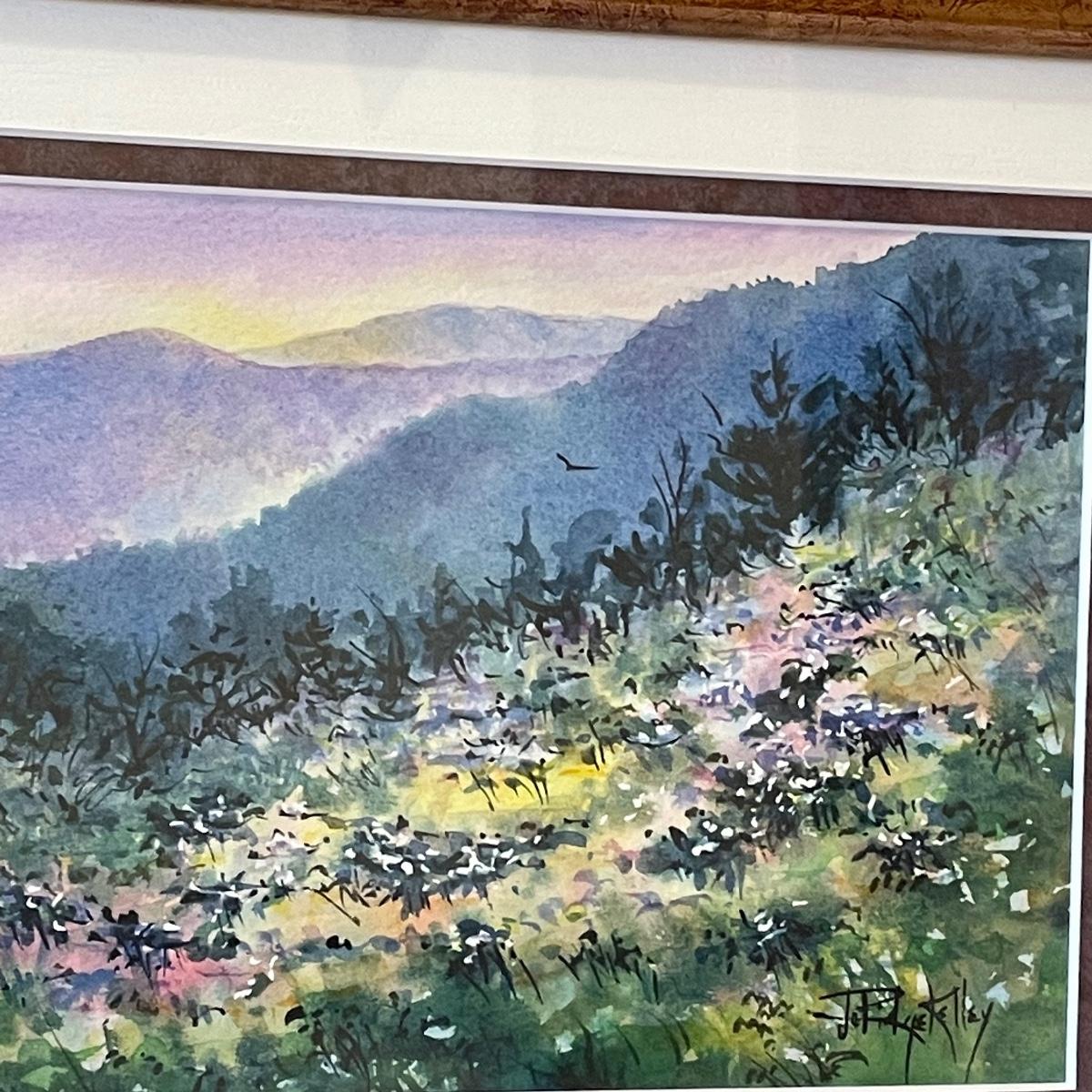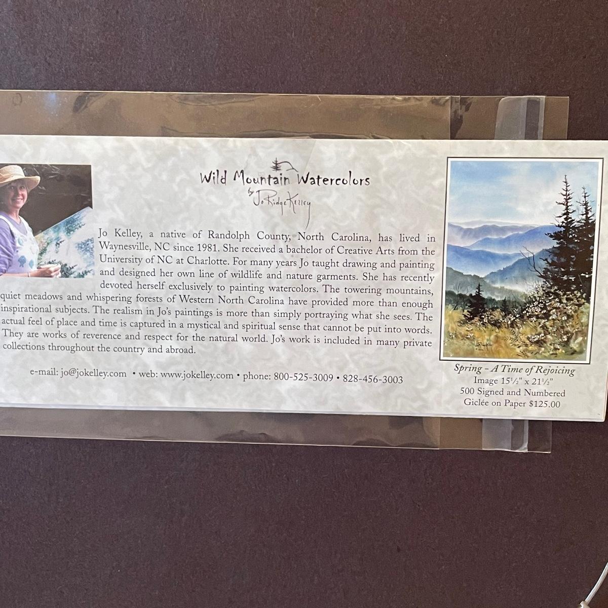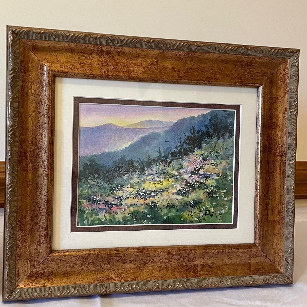 This stunning mountain scene watercolor print is by Waynesville artist Jo Ridge Kelly. Its matted and mounted in a gilded frame with signature.