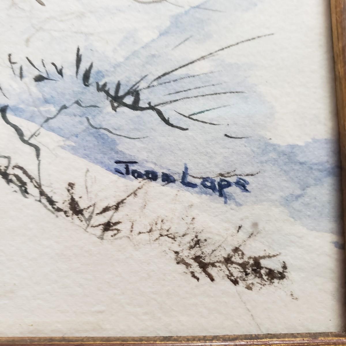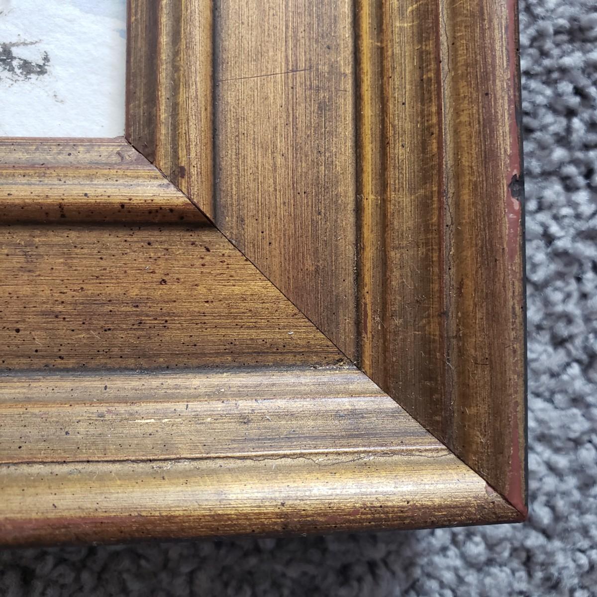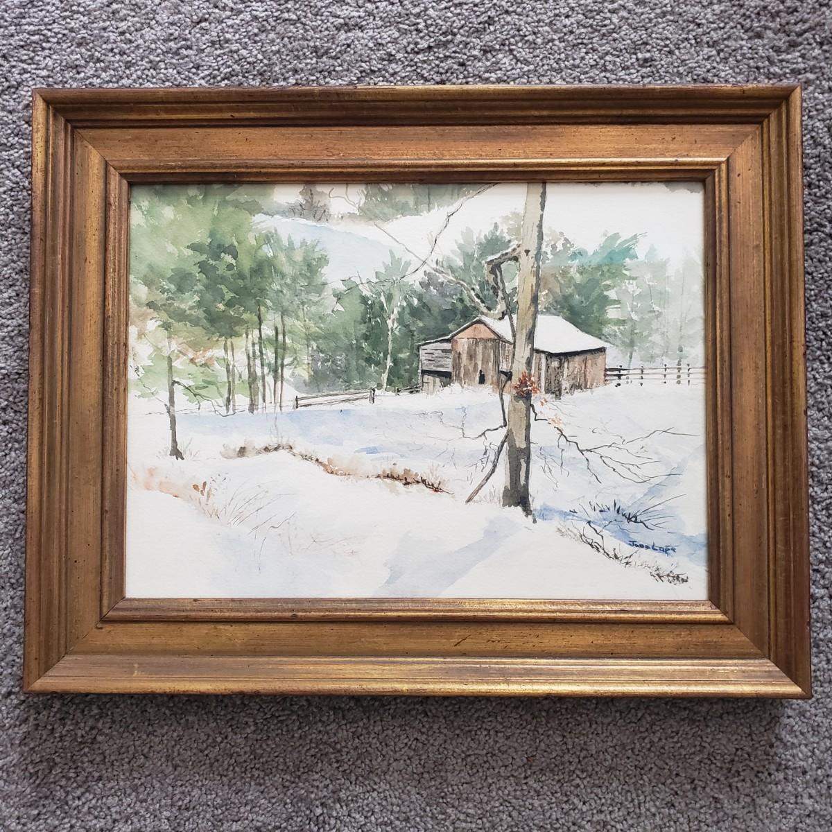 This watercolor by local Weaverville artist, Joan Lape is titled "Papa's Barn". The wooden frame in gold measures 18" x 14". The piece was framed in glass by TruVue museum glass, see picture.