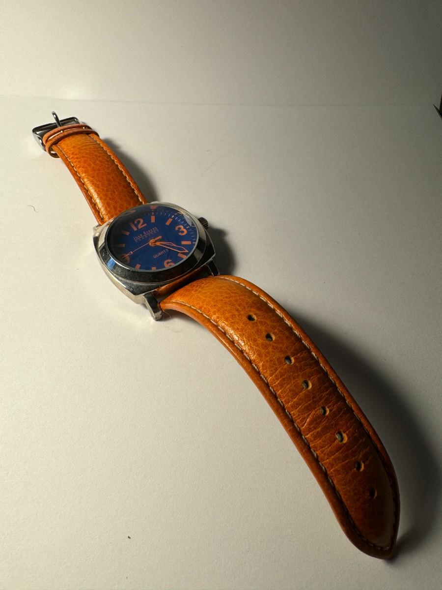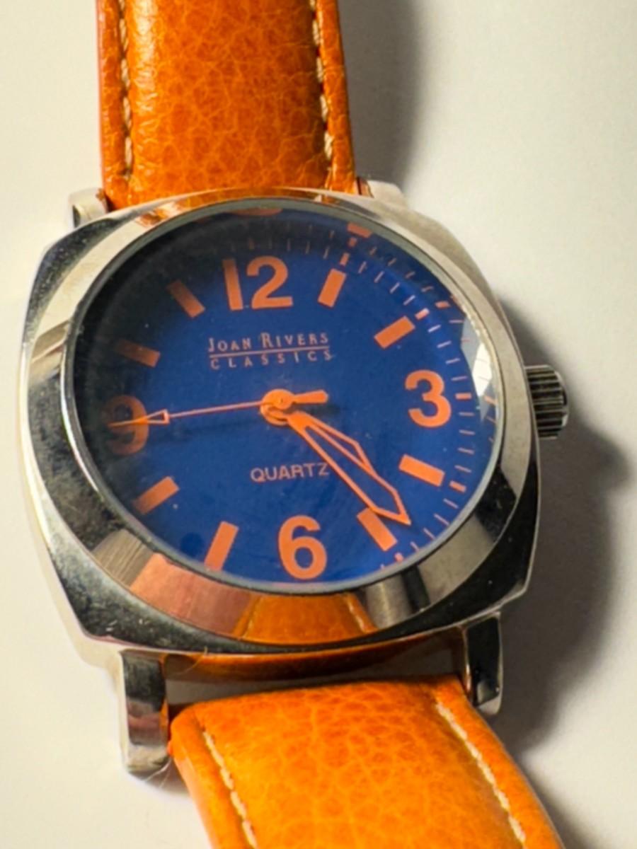 A Joan Rivers Classics Women's Watch with an orange leather band and a blue dial. It is described as a colorful wrist watch with orange band and numbers and a bright blue face. The watch is water resistant and has a leather band. The watch's dial has orange numerals, and the words "Joan Rivers Classics" and "Quartz" are displayed. The square-shaped case is silver-toned