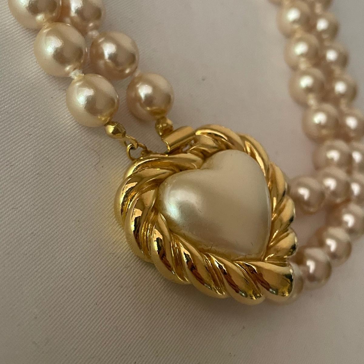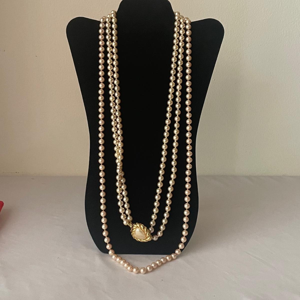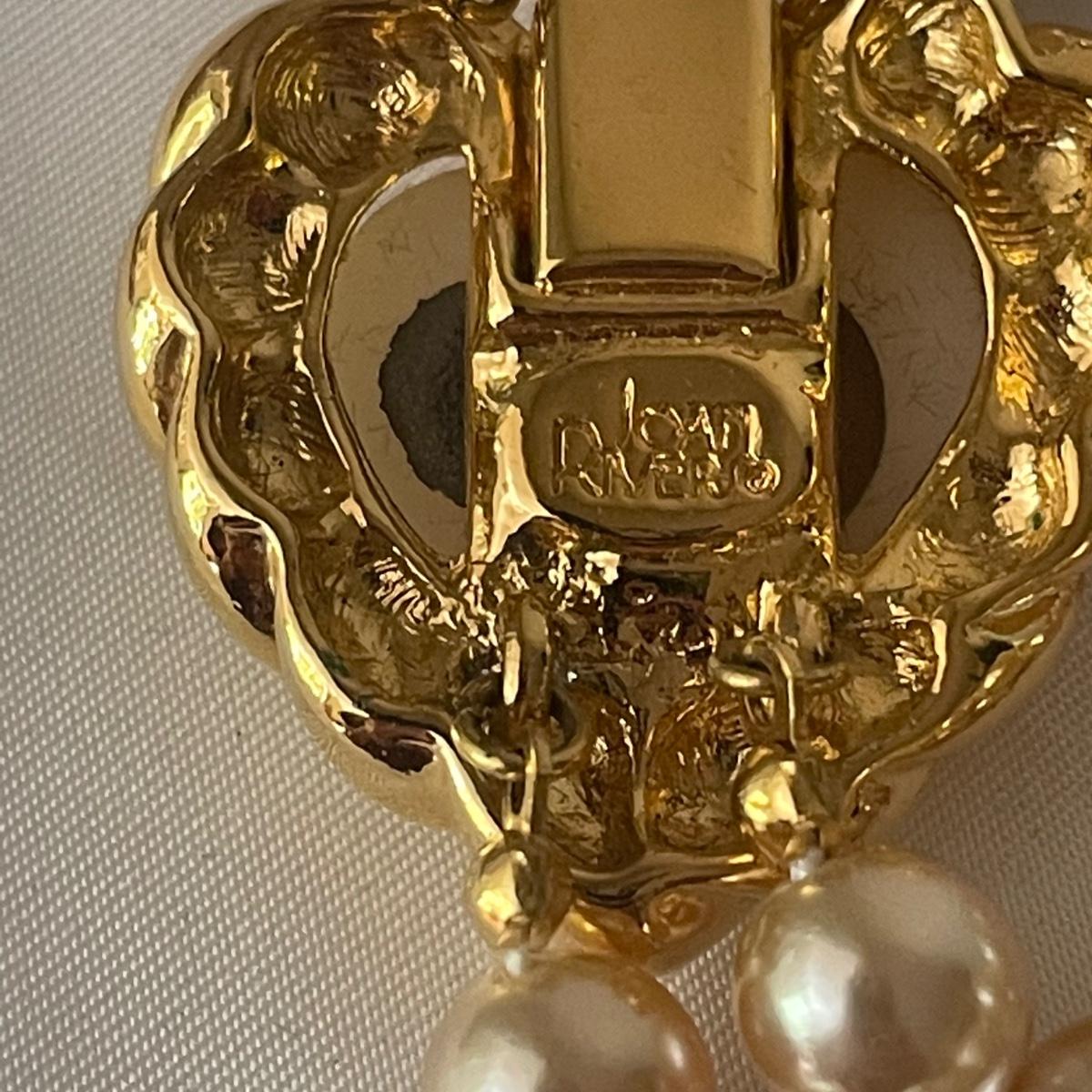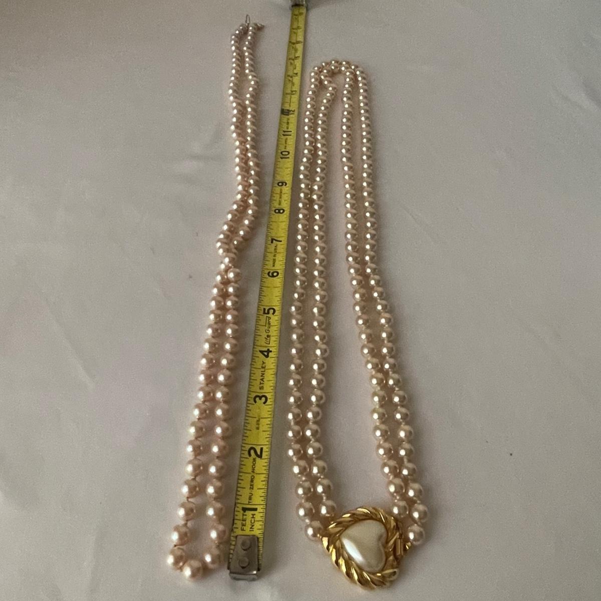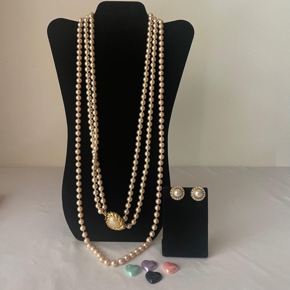 The double strand Pearl necklace is made by Joan Rivers and comes with a black velvet pouch; this necklace has a heart shaped Pearl pendant. Also included is another long Pearl necklace, a pair of clip-on Pearl earrings and 4 pearlescent hearts that have copper backs; we are unsure of their purpose as they have no attachments. No marks were found on the metal of any items and it appears that all pearls are faux. See images for measurements. A second smaller black velvet pouch and a red jewelry storage bag are included.