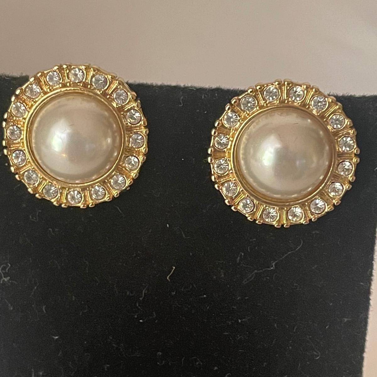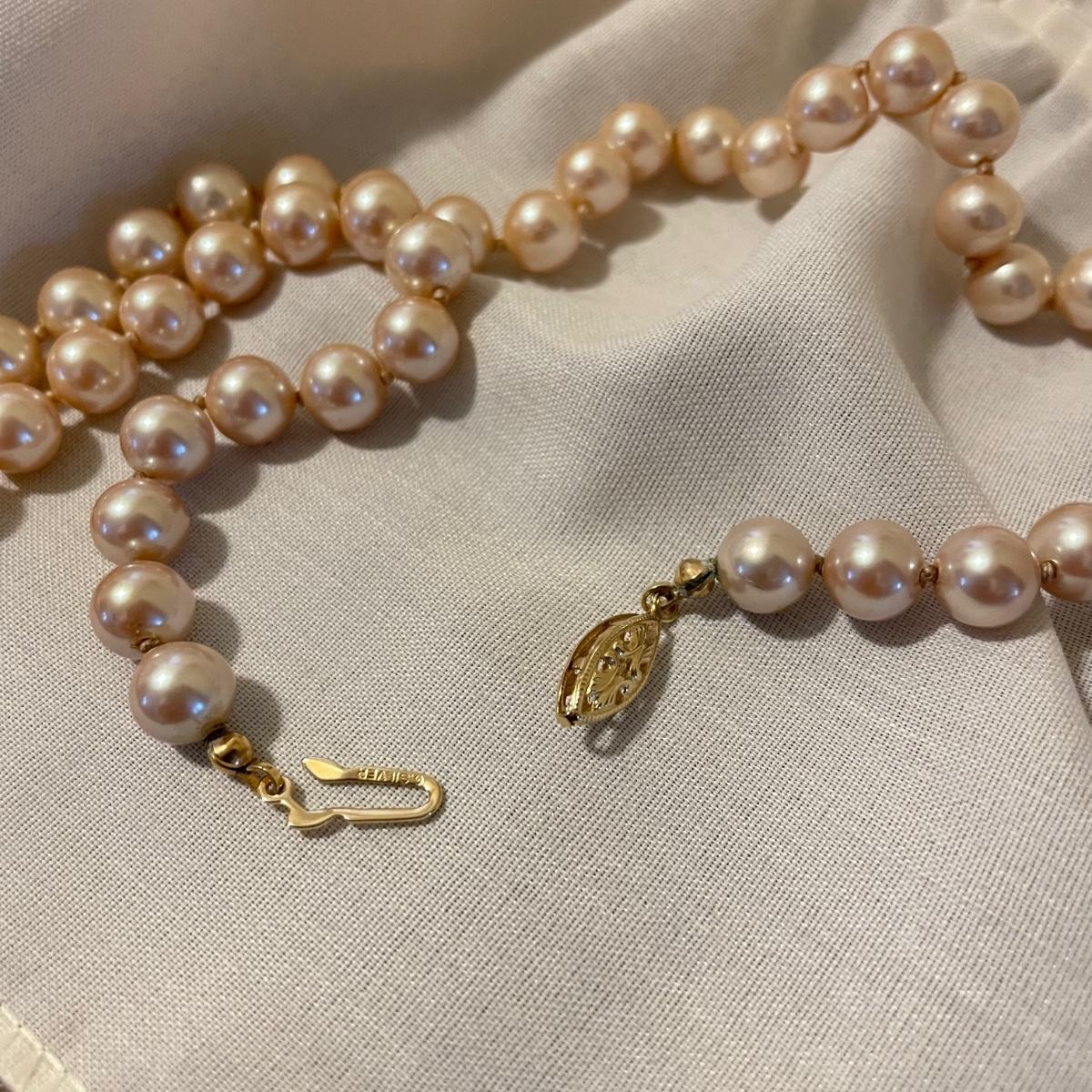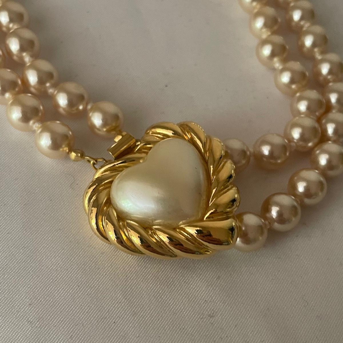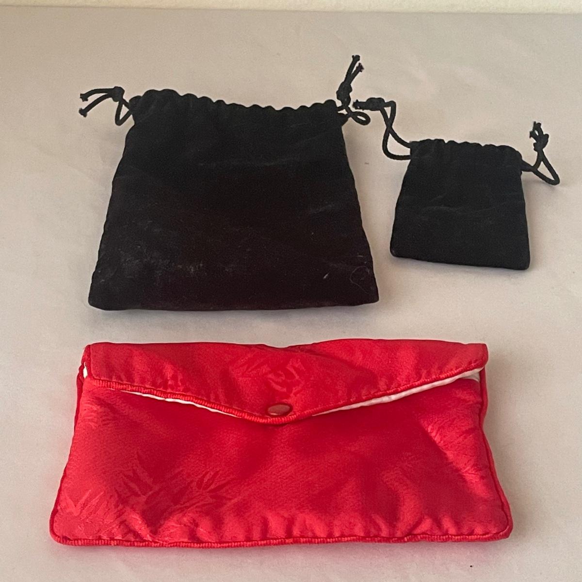 The double strand Pearl necklace is made by Joan Rivers and comes with a black velvet pouch; this necklace has a heart shaped Pearl pendant. Also included is another long Pearl necklace, a pair of clip-on Pearl earrings and 4 pearlescent hearts that have copper backs; we are unsure of their purpose as they have no attachments. No marks were found on the metal of any items and it appears that all pearls are faux. See images for measurements. A second smaller black velvet pouch and a red jewelry storage bag are included.