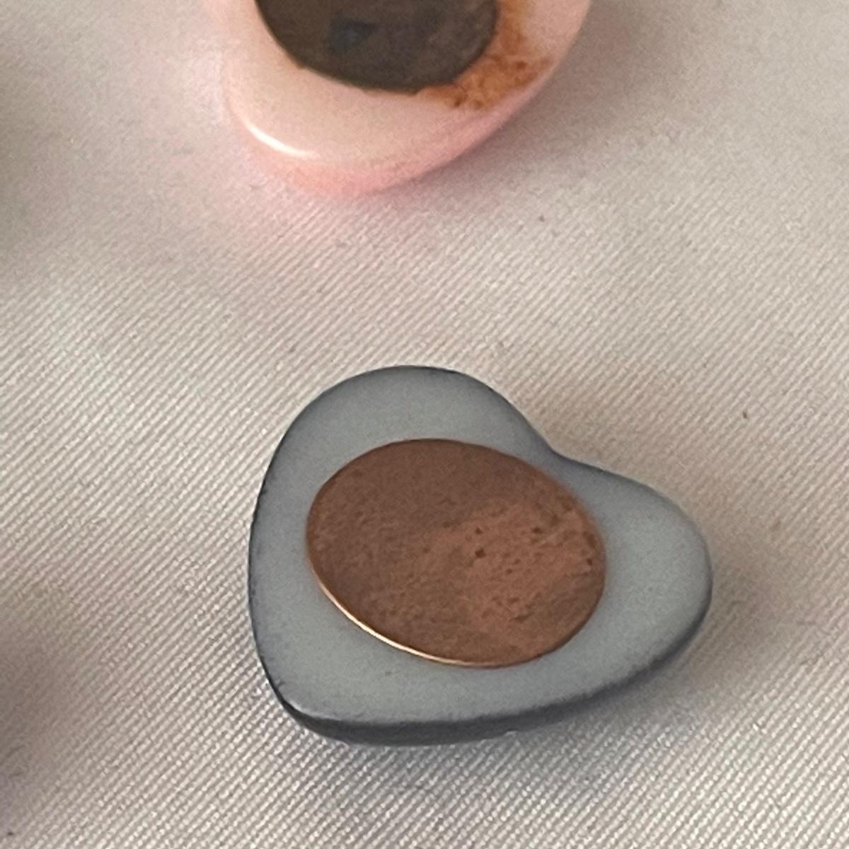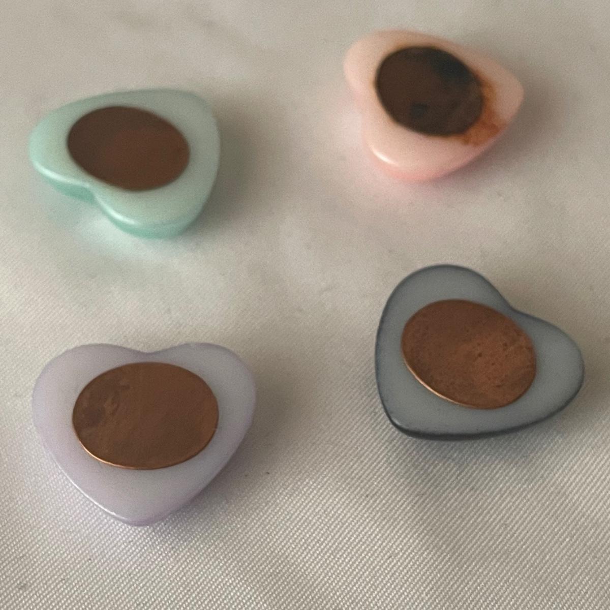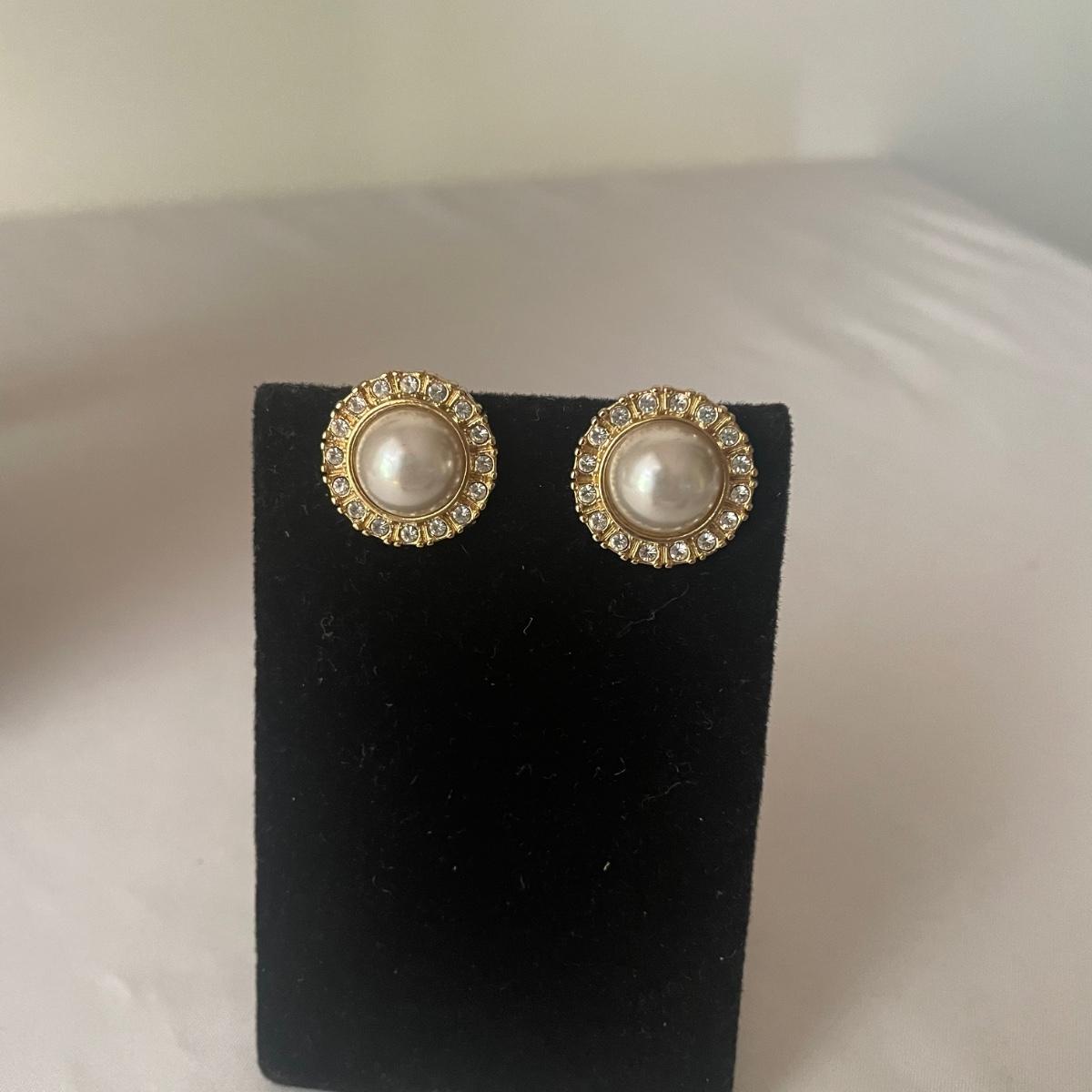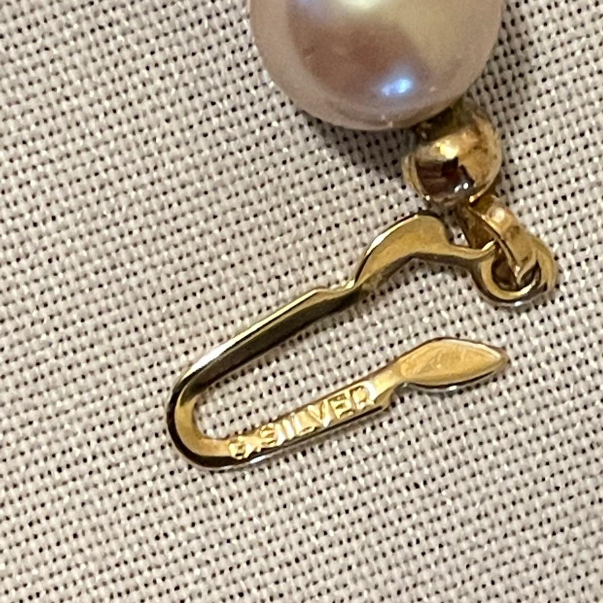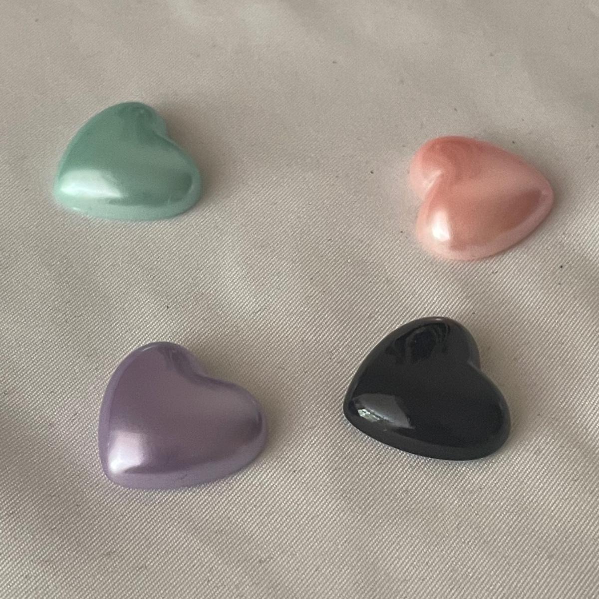 The double strand Pearl necklace is made by Joan Rivers and comes with a black velvet pouch; this necklace has a heart shaped Pearl pendant. Also included is another long Pearl necklace, a pair of clip-on Pearl earrings and 4 pearlescent hearts that have copper backs; we are unsure of their purpose as they have no attachments. No marks were found on the metal of any items and it appears that all pearls are faux. See images for measurements. A second smaller black velvet pouch and a red jewelry storage bag are included.
