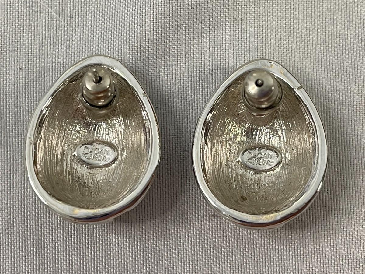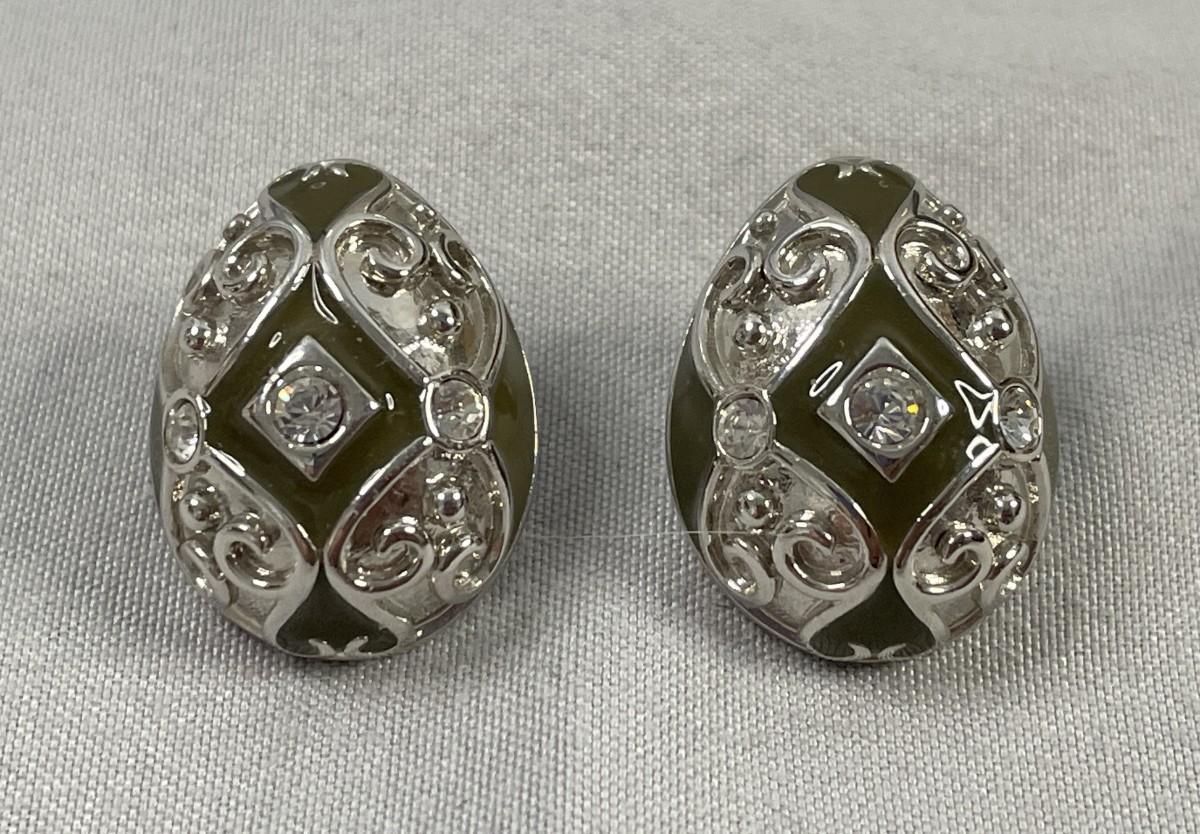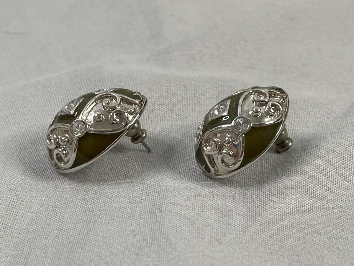 These earrings are marked Joan Rivers and are about 1 inch long. They are embellished with an olive green enamel paint and a crystal in the center. They are designed for pierced ears.