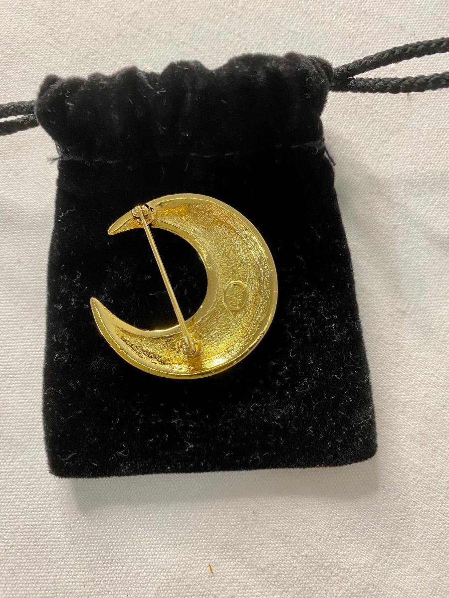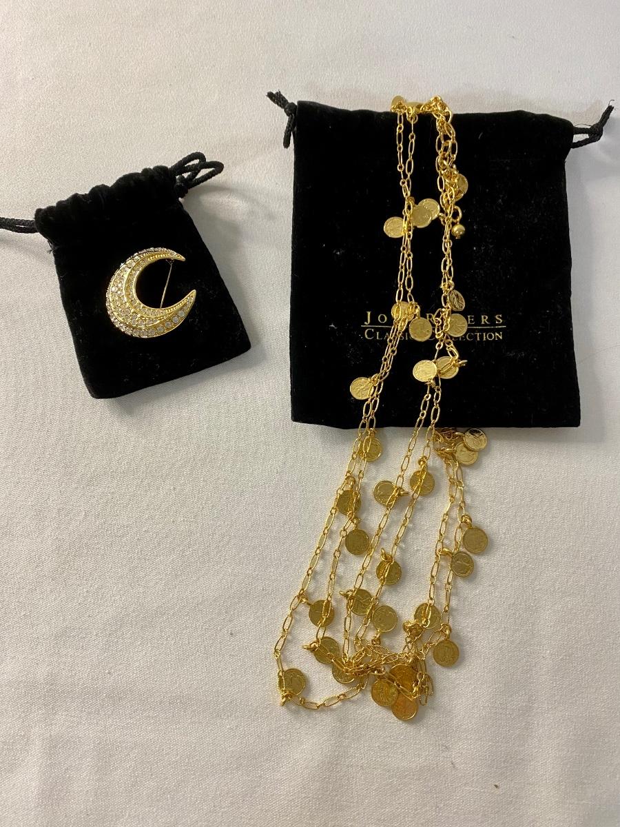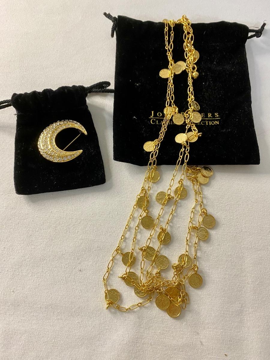 1 crescent rine stone pin and 1 coin necklace gold tone.