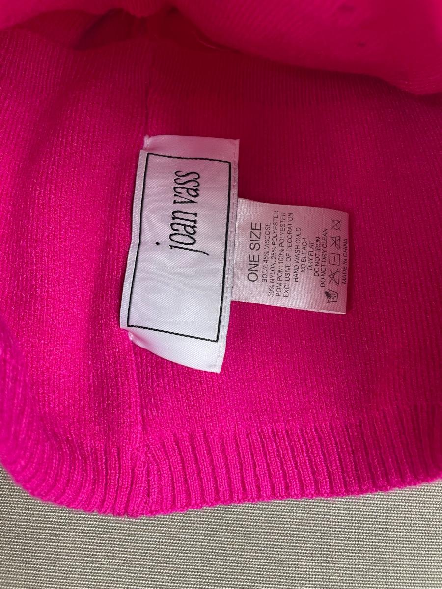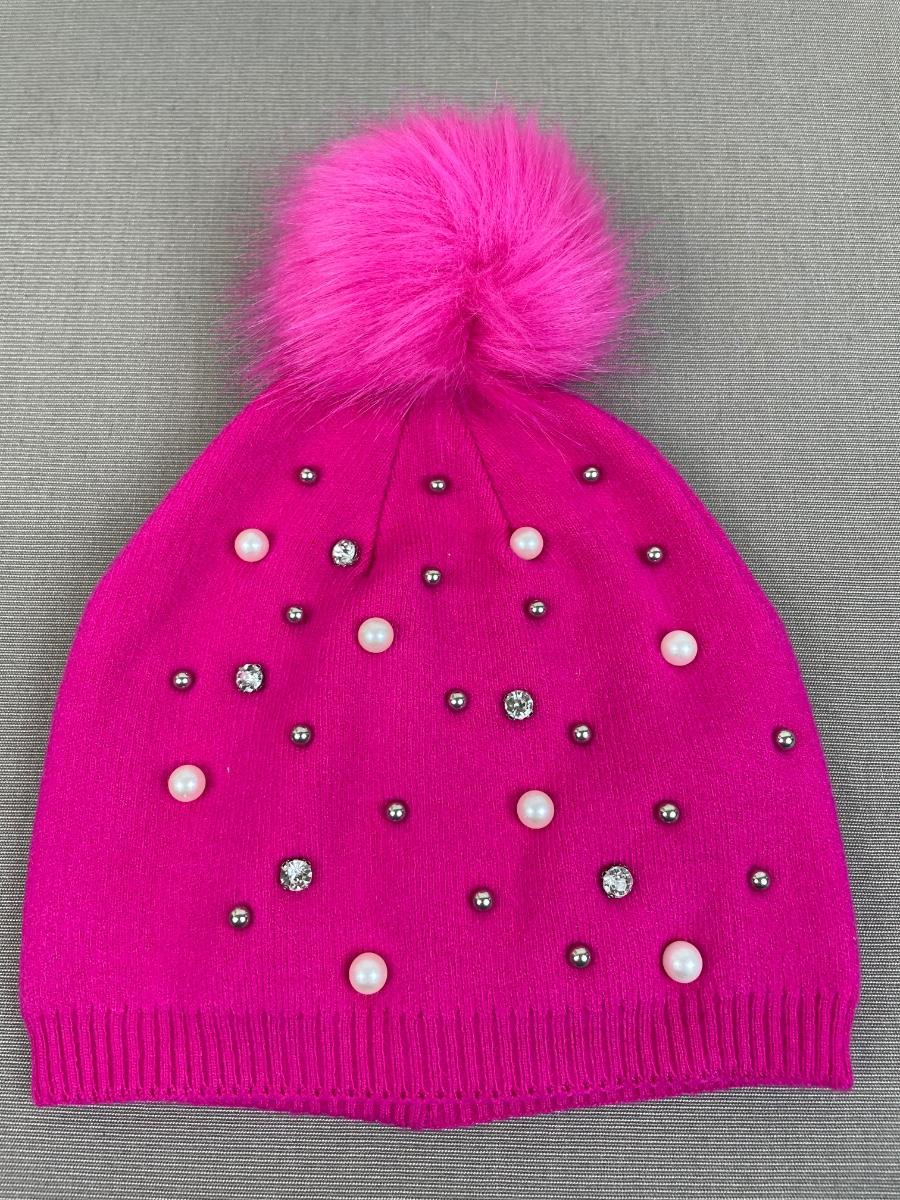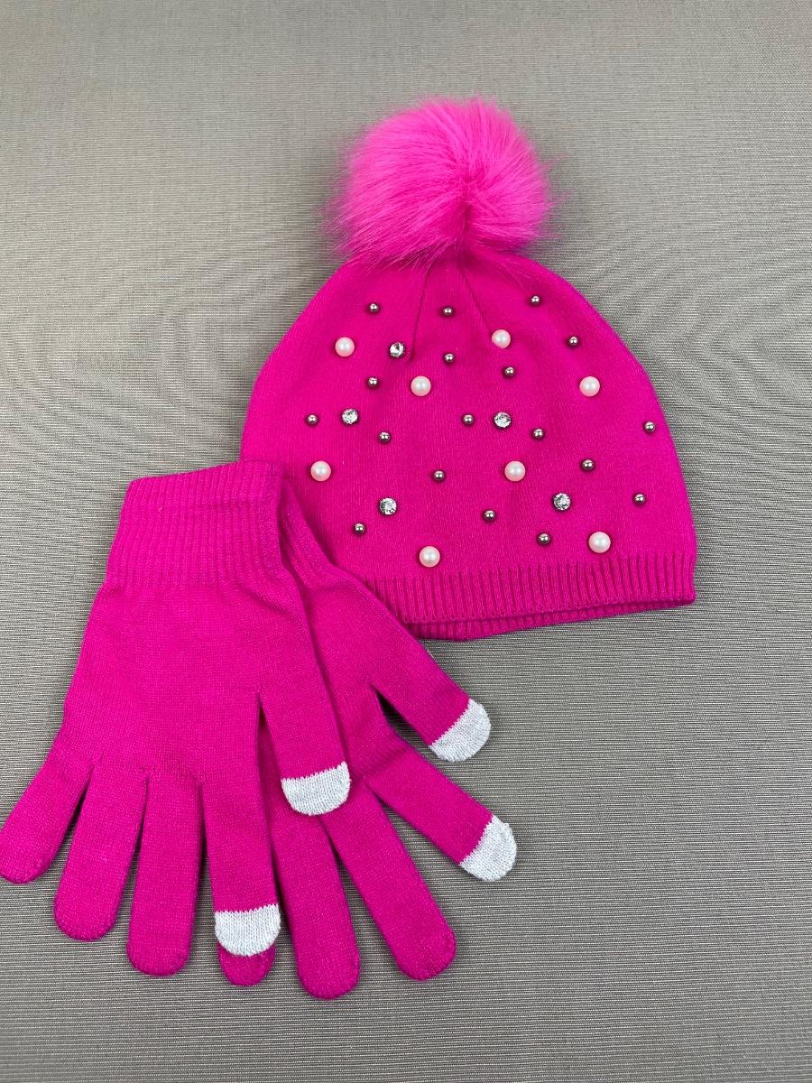 Joan Vass Fuschia Pearls Knit Beanie and Gloves Set