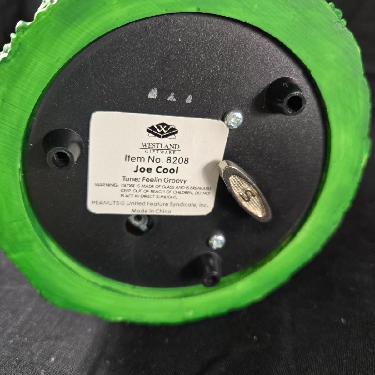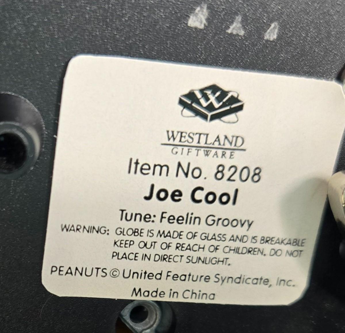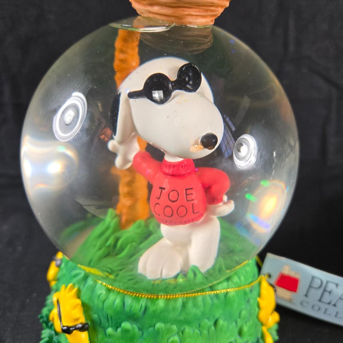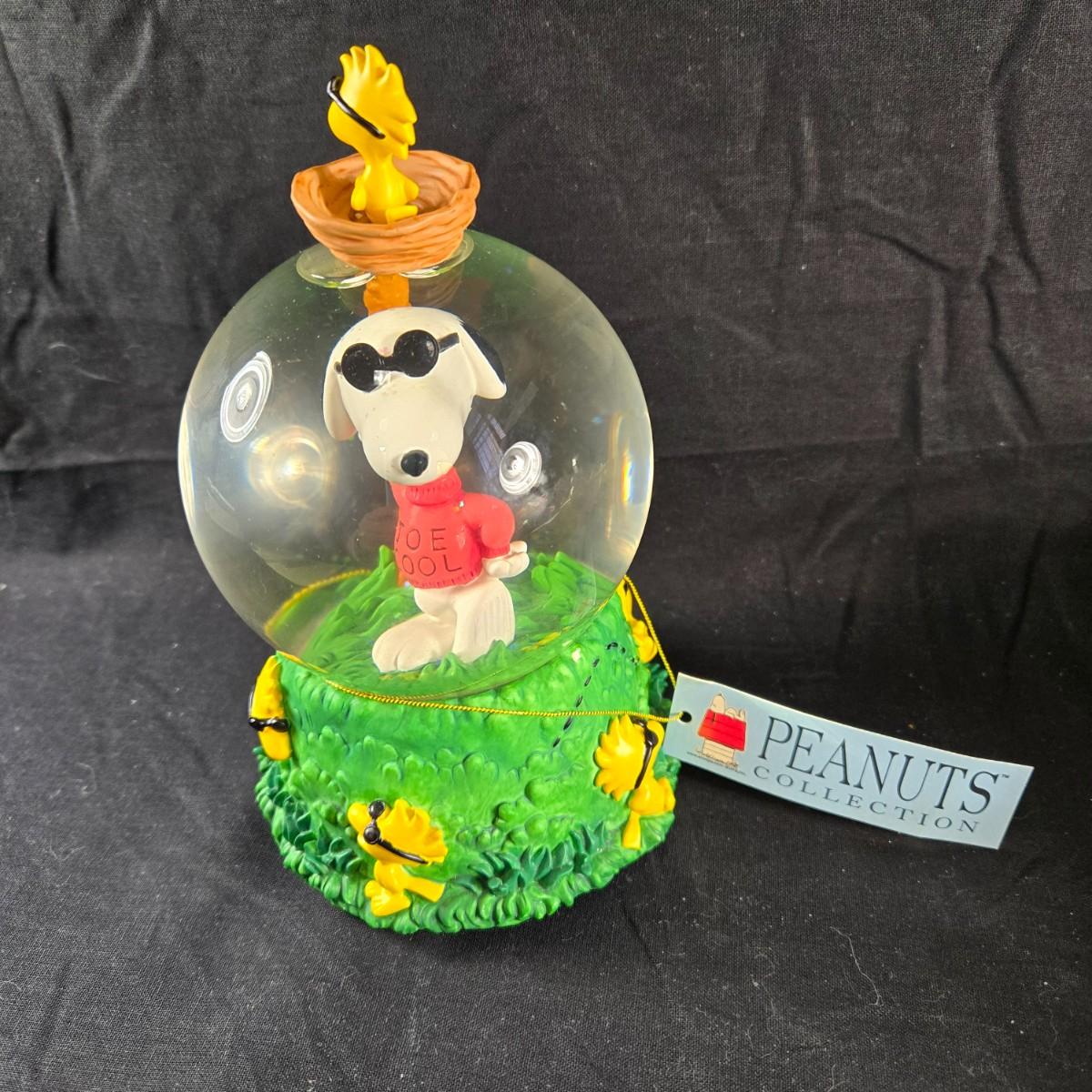 This auction lot is for a "Joe Cool" Snoopy Snow Globe Music Box. This is a vintage Snoopy Collectible. It is the "Joe Cool" Snow Globe Music Box. It plays the song "Feelin' Groovy" . It is about 6.75-inches tall X 4.25-inches in diameter. NOTICE: Be aware if shipping - know that it is heavy and will require lots of packing material.