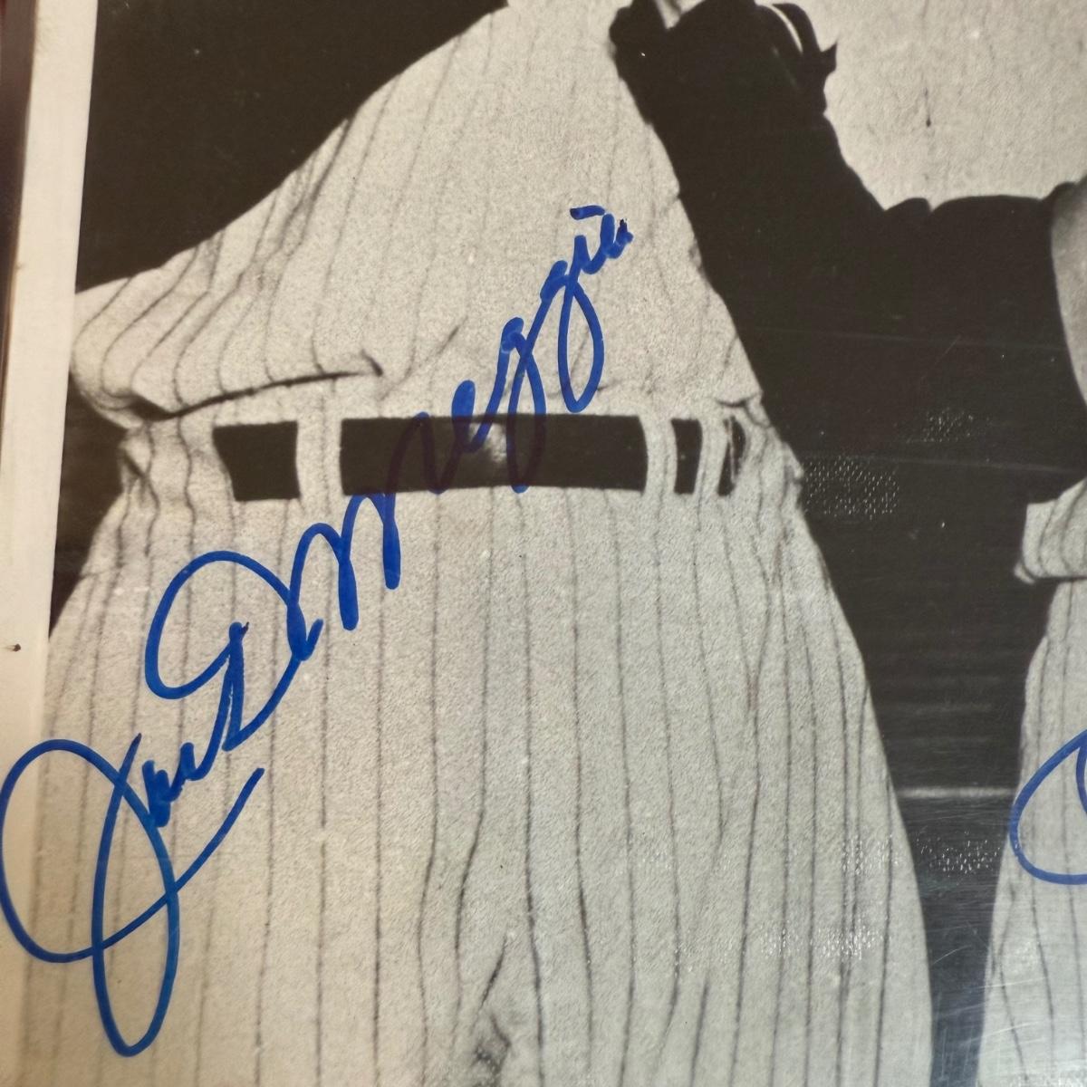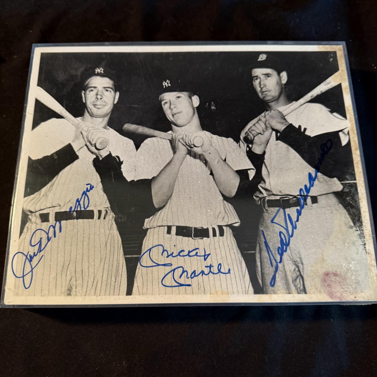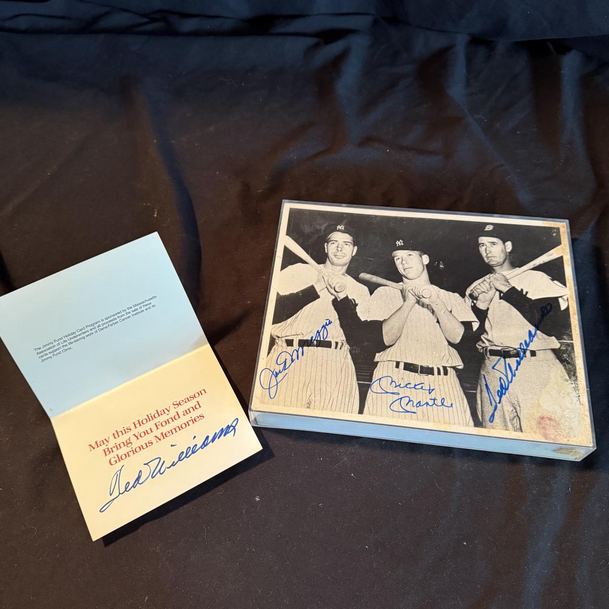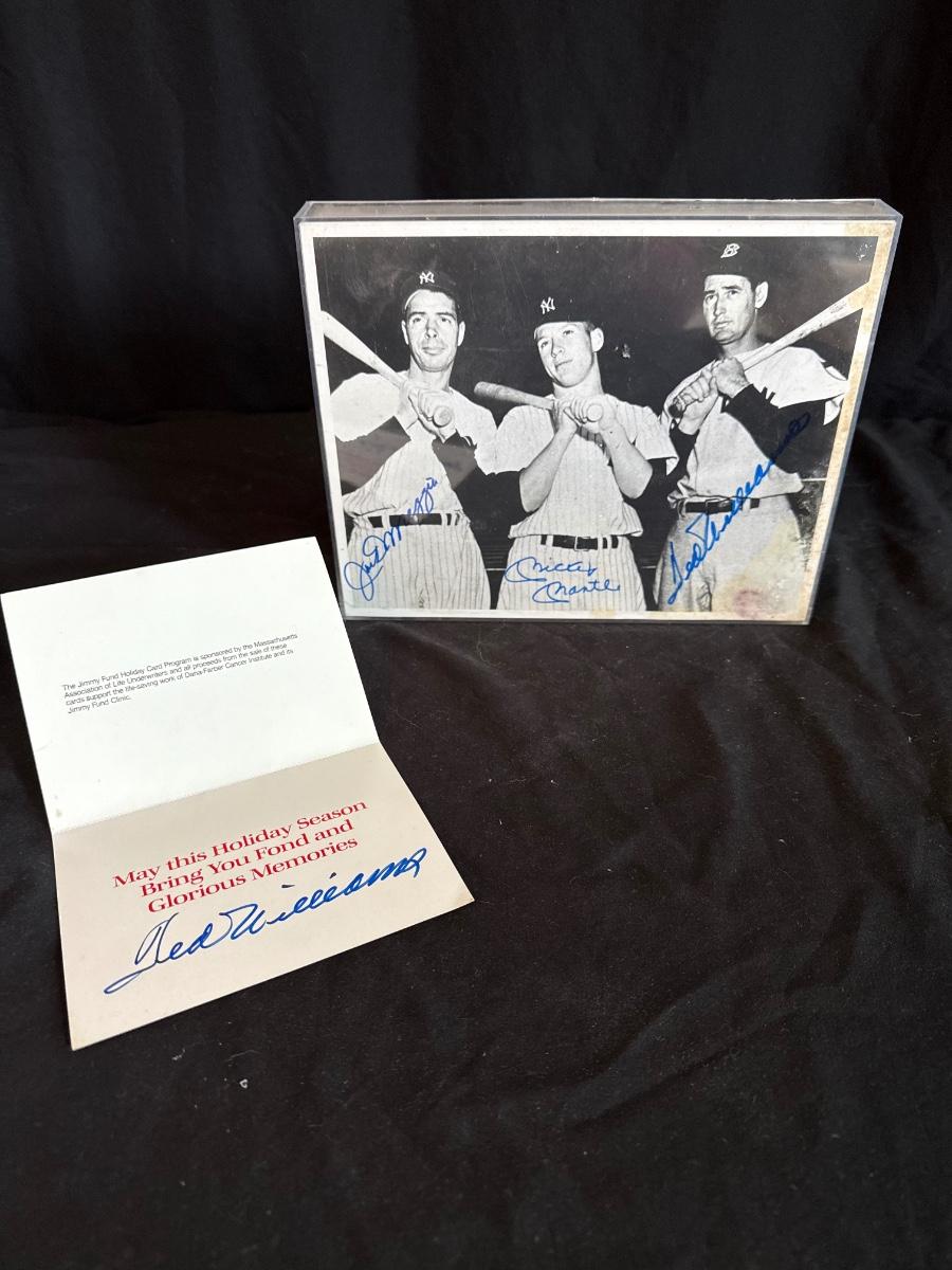 This very special lot contains a print of a photograph with Joe DiMaggio, Mickey Mantle, and Ted Williams along with what appears to be their autographs. It's difficult to determine if they are printed or original signatures. This print is unfortunately damaged and cannot be removed from its current frame without further damaging the print. Also included is a Christmas card with what appears to be Ted Williams signature as well. Please note none of these autographs have been authenticated. Shipping available.
