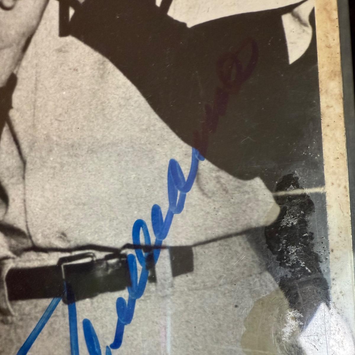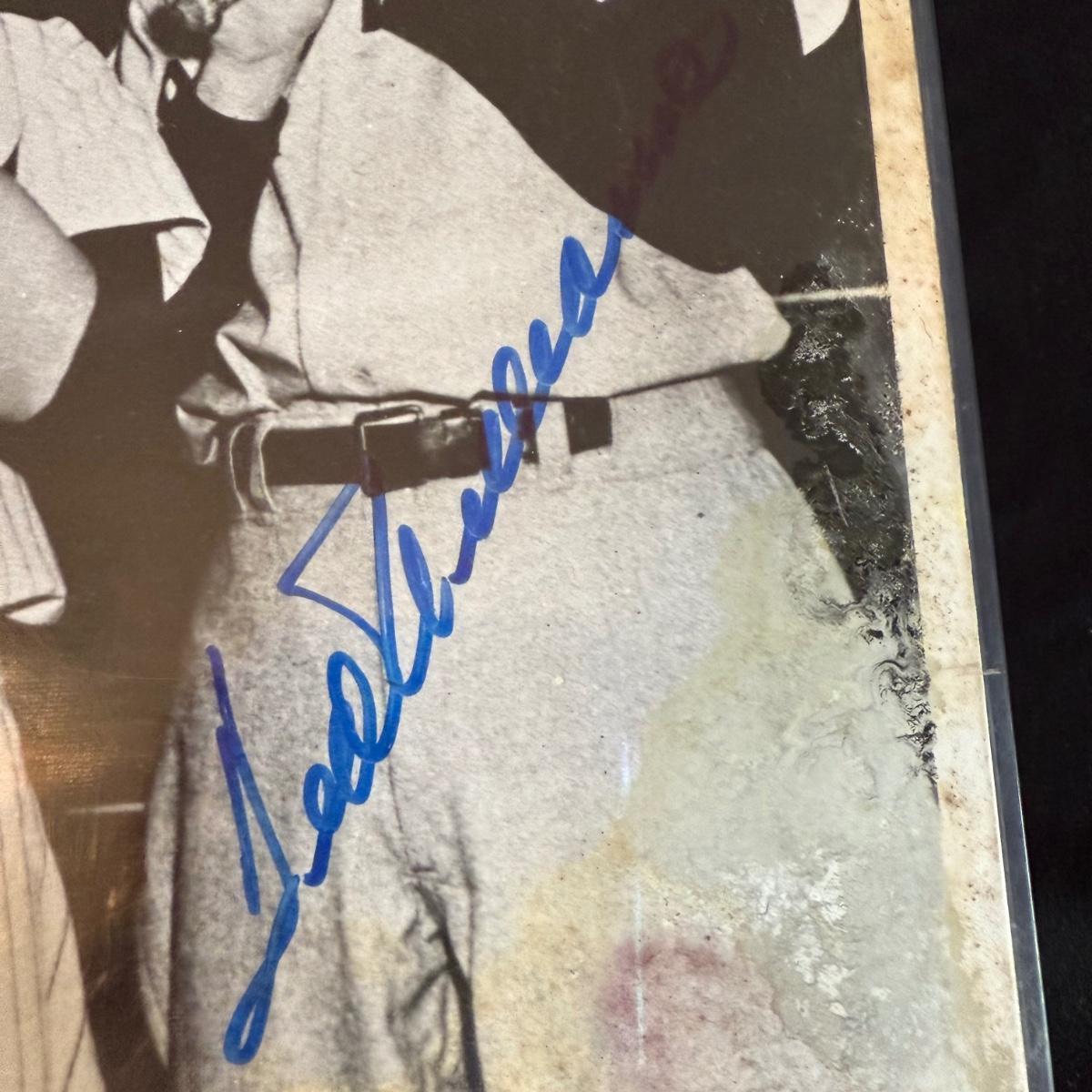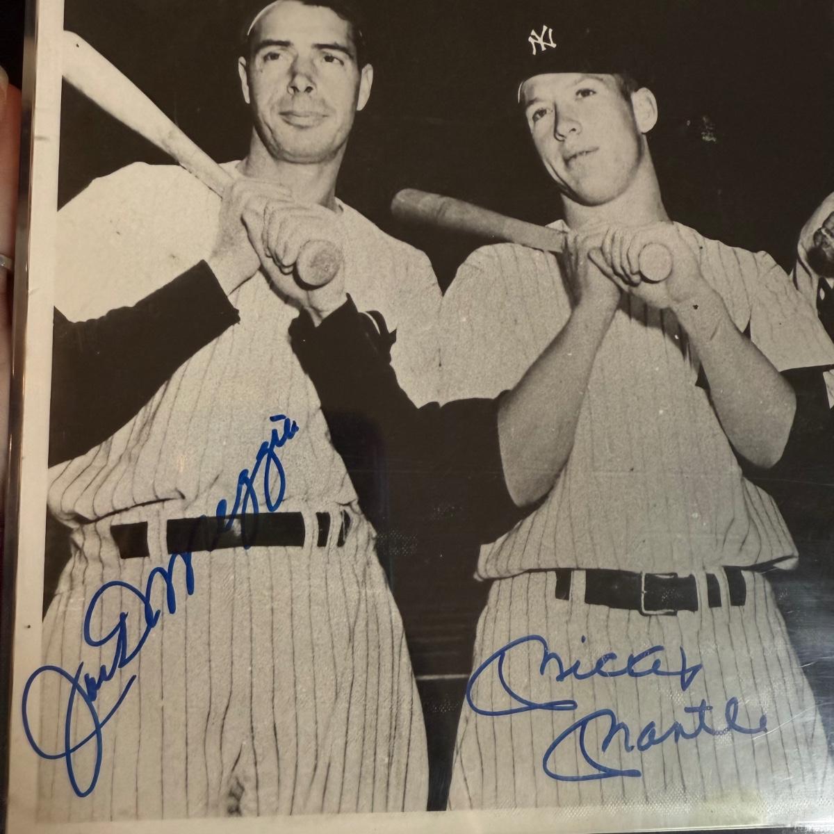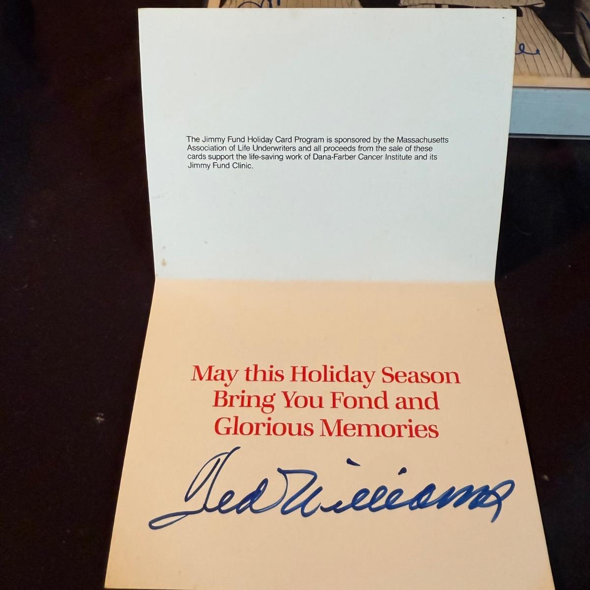 This very special lot contains a print of a photograph with Joe DiMaggio, Mickey Mantle, and Ted Williams along with what appears to be their autographs. It's difficult to determine if they are printed or original signatures. This print is unfortunately damaged and cannot be removed from its current frame without further damaging the print. Also included is a Christmas card with what appears to be Ted Williams signature as well. Please note none of these autographs have been authenticated. Shipping available.