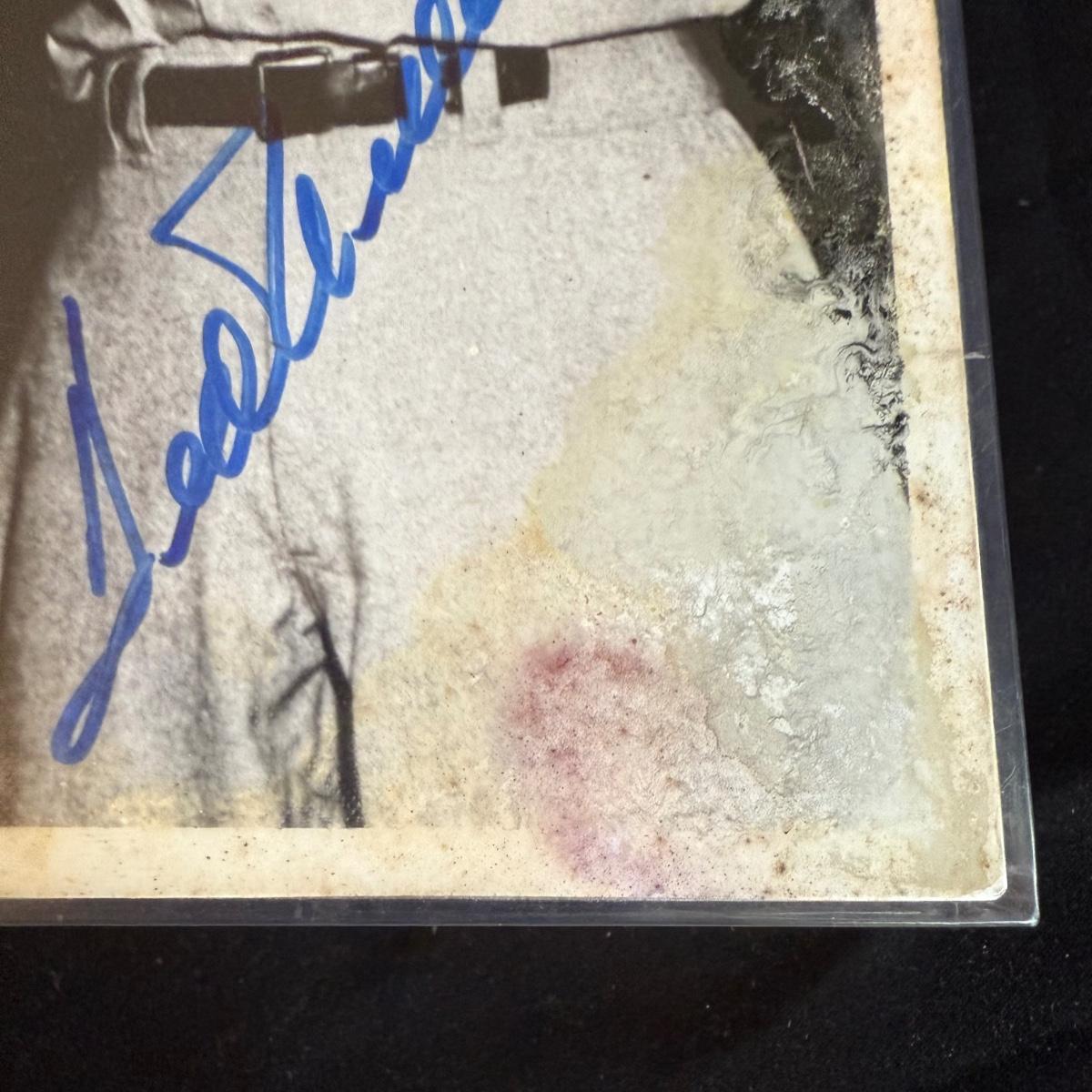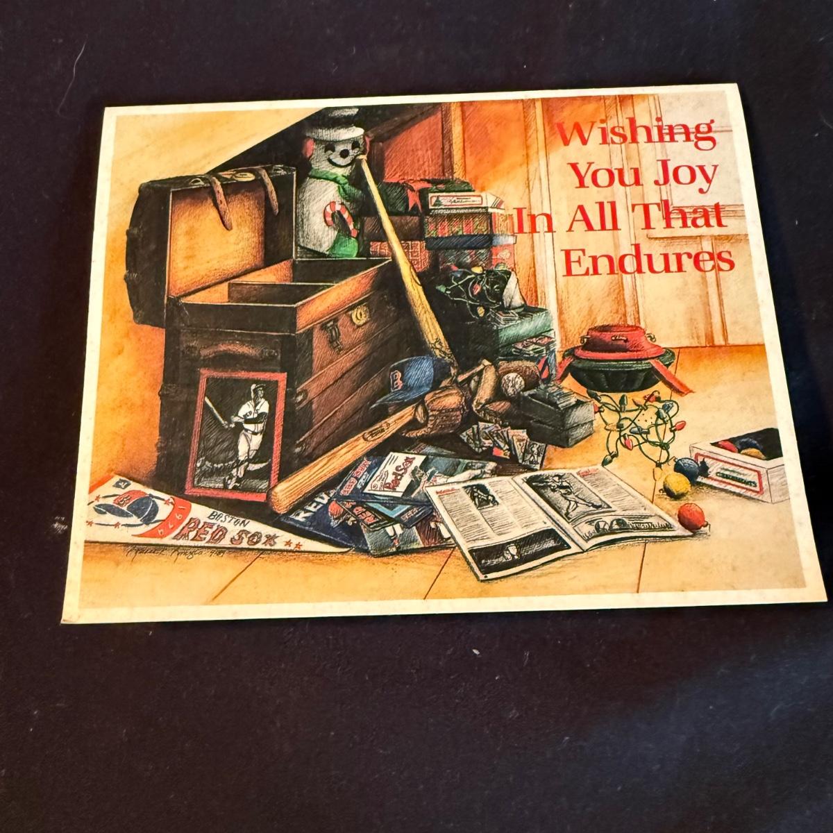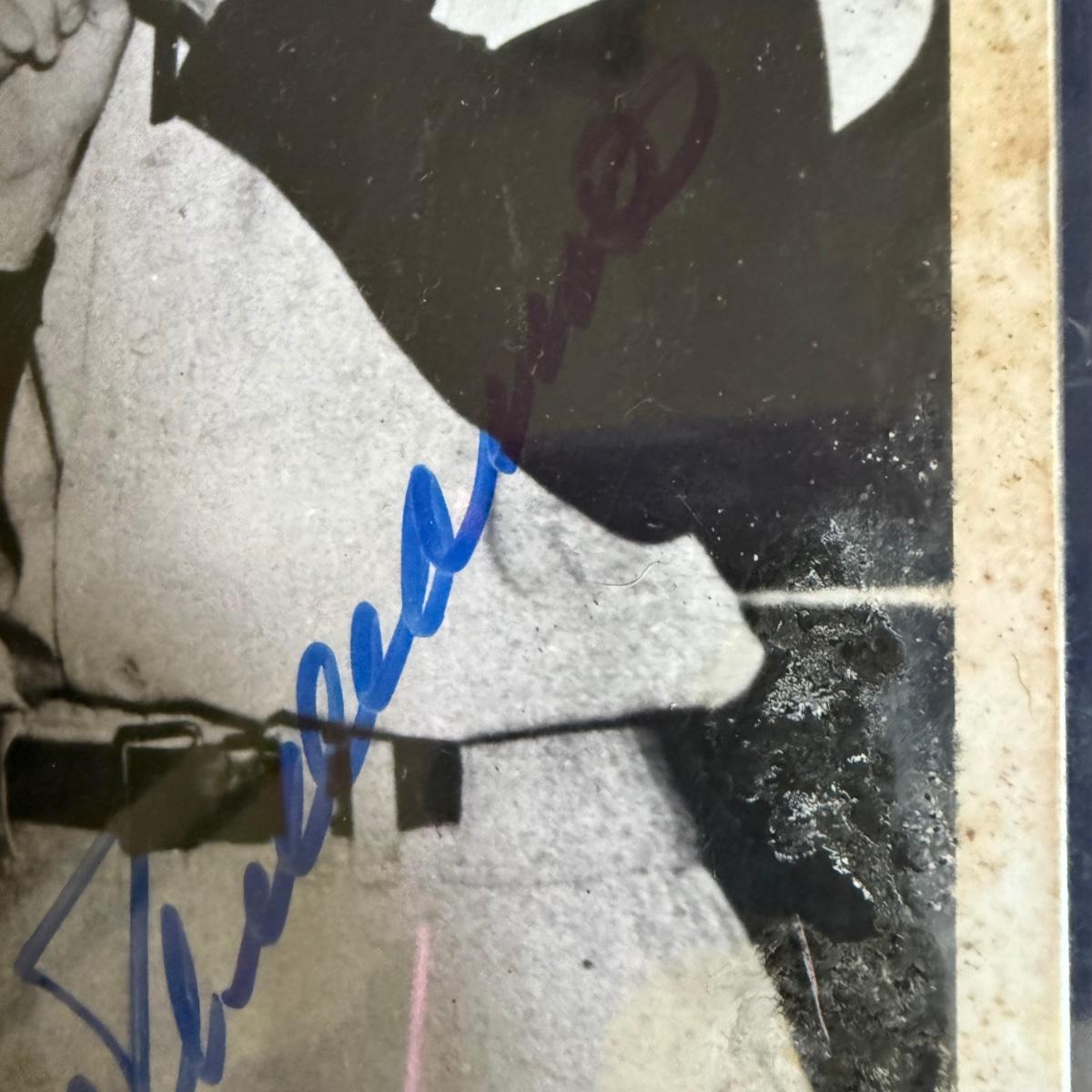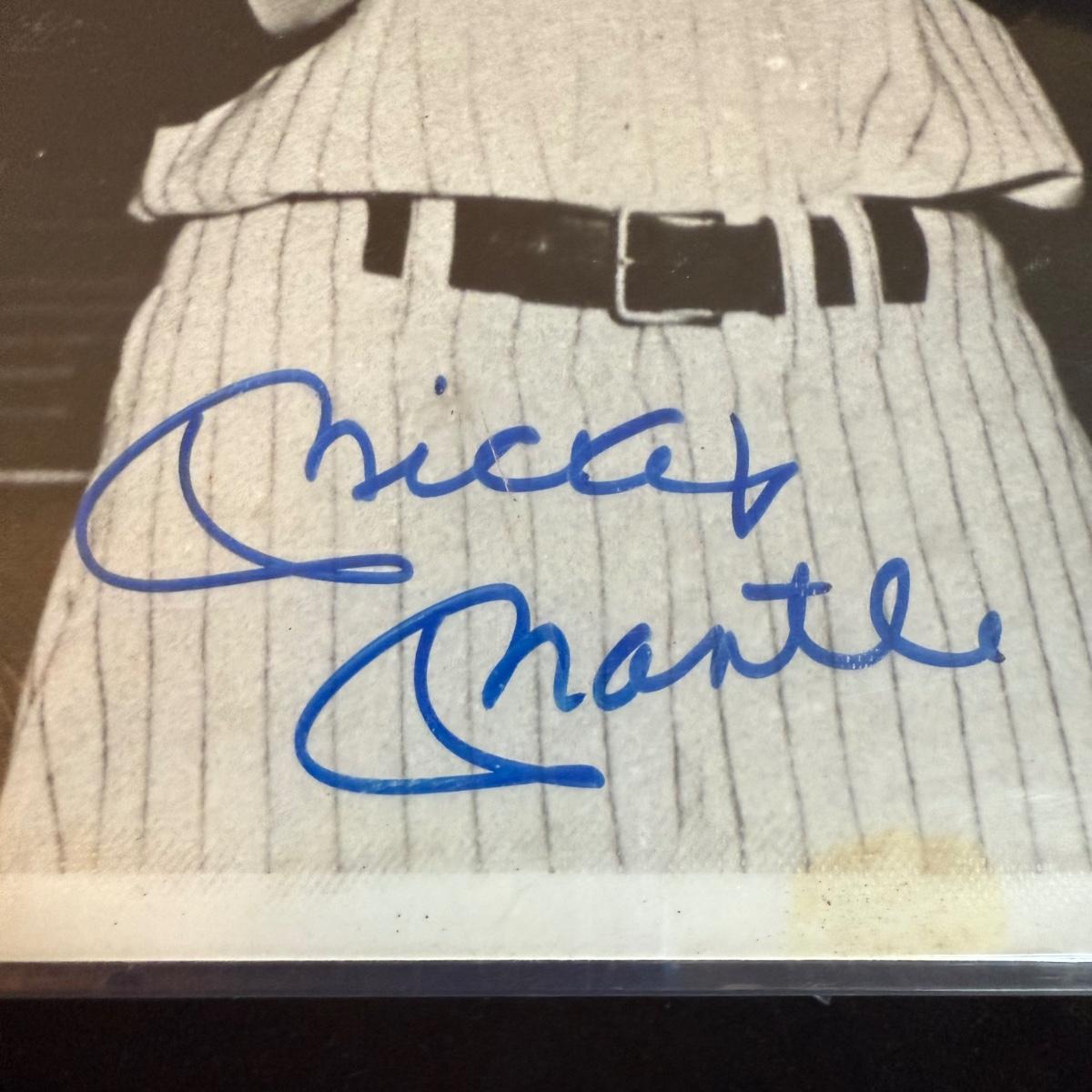 This very special lot contains a print of a photograph with Joe DiMaggio, Mickey Mantle, and Ted Williams along with what appears to be their autographs. It's difficult to determine if they are printed or original signatures. This print is unfortunately damaged and cannot be removed from its current frame without further damaging the print. Also included is a Christmas card with what appears to be Ted Williams signature as well. Please note none of these autographs have been authenticated. Shipping available.