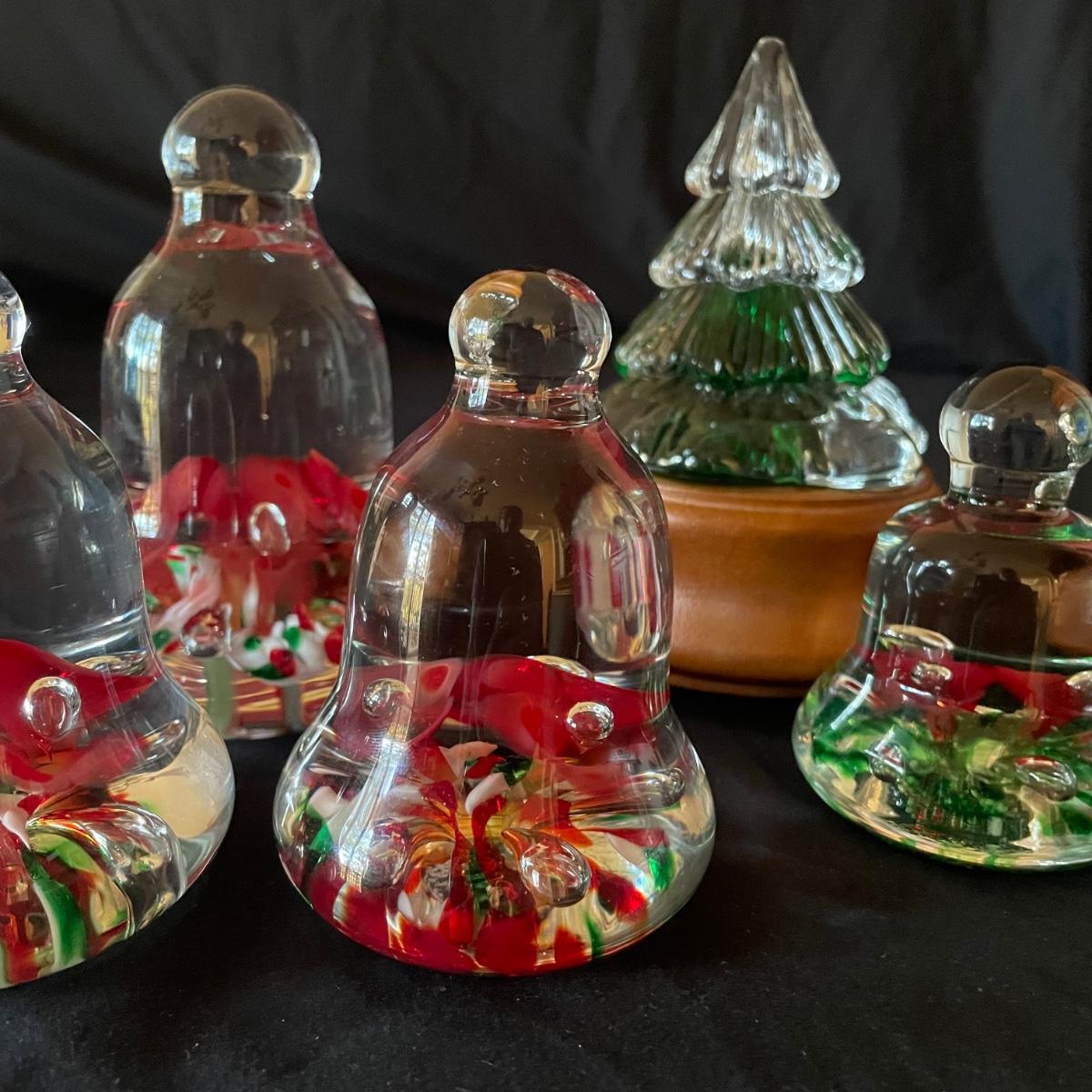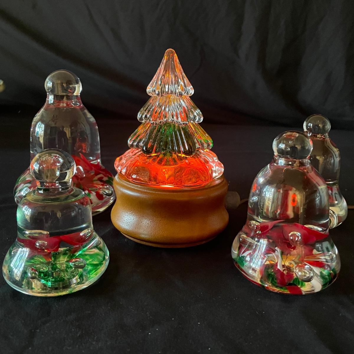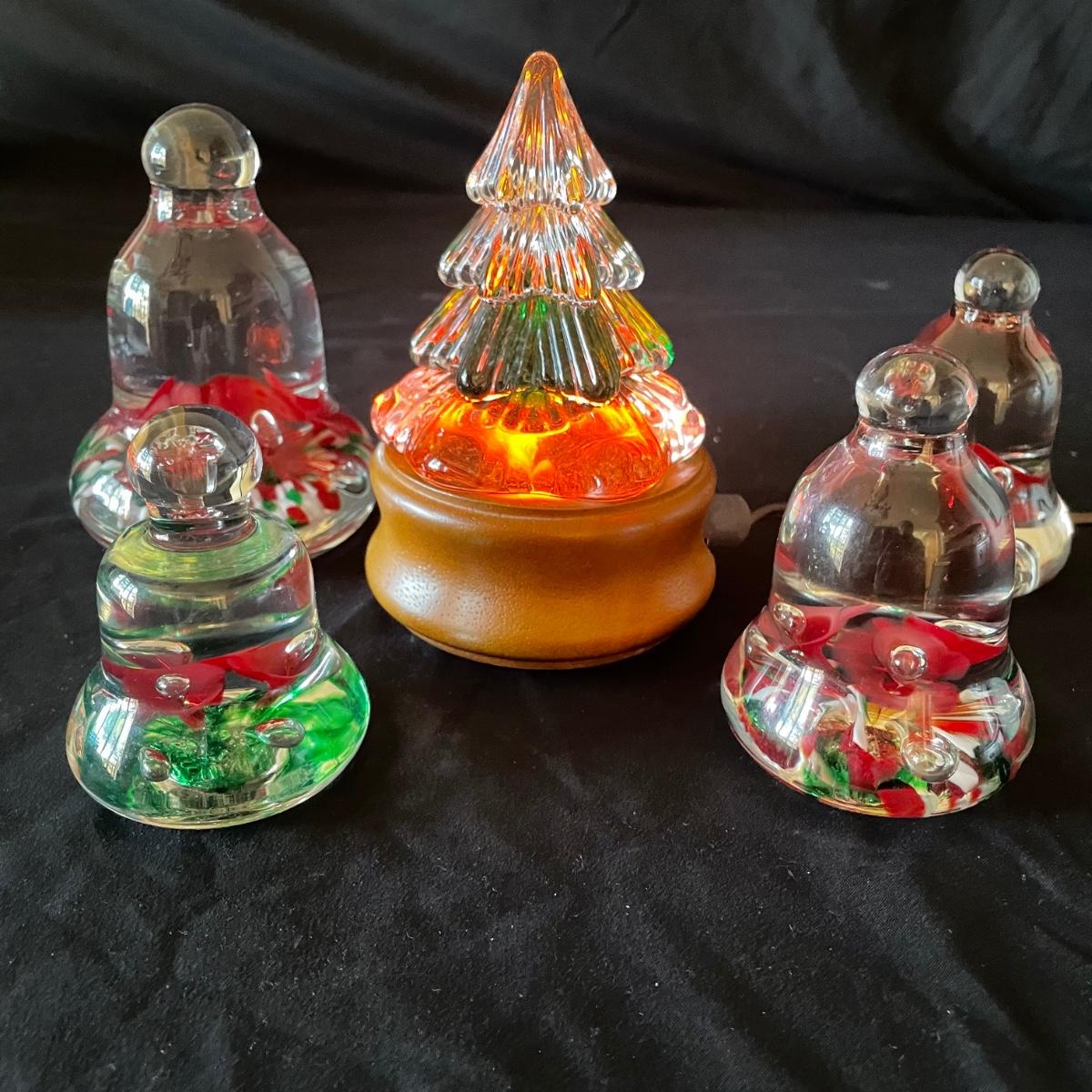 All five pieces are by Joe Rice, Three of these bell shaped glass paperweights are a set, the fourth piece is very similar in size and colors and the lot includes a fifth piece that has a wood base with orange bulb that illuminates (in-line switch) the fir tree shaped glass top piece; tree with stand measures 4” d x 6”.