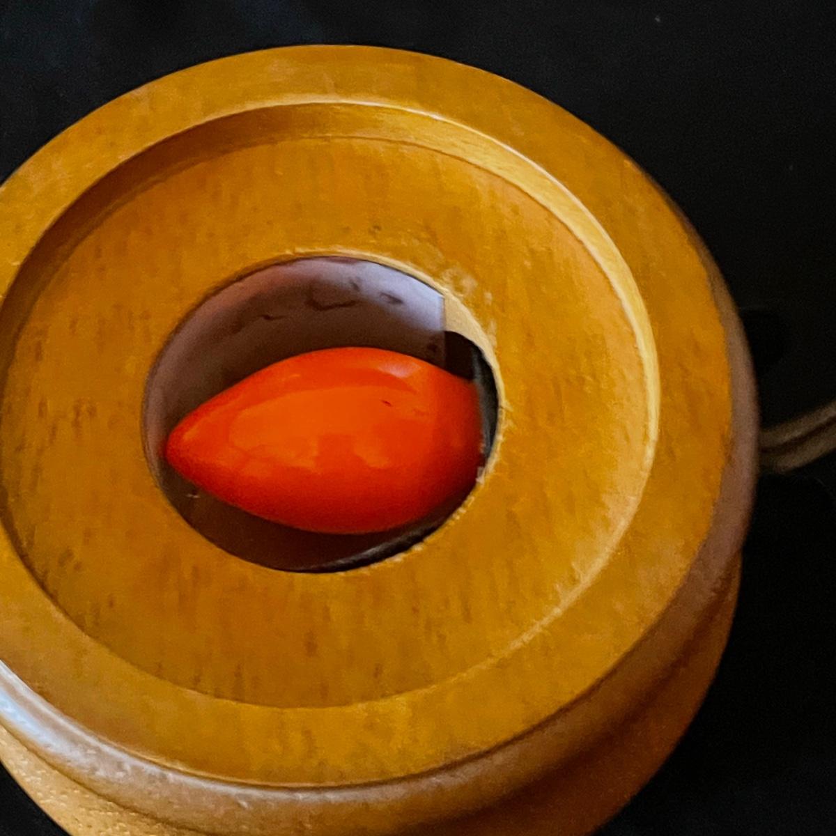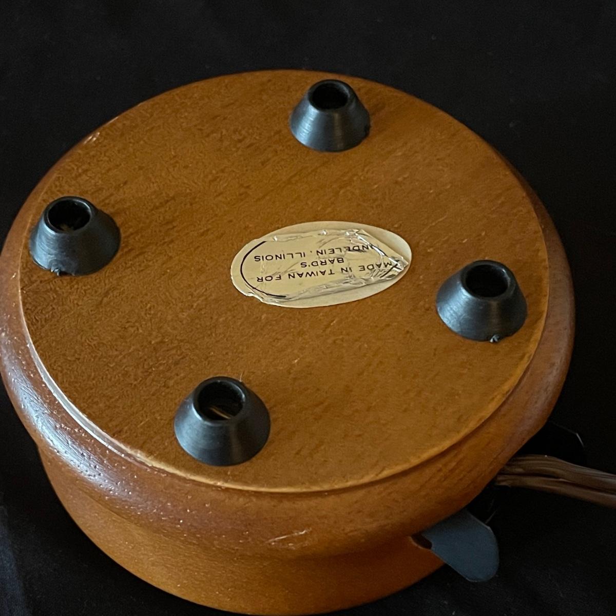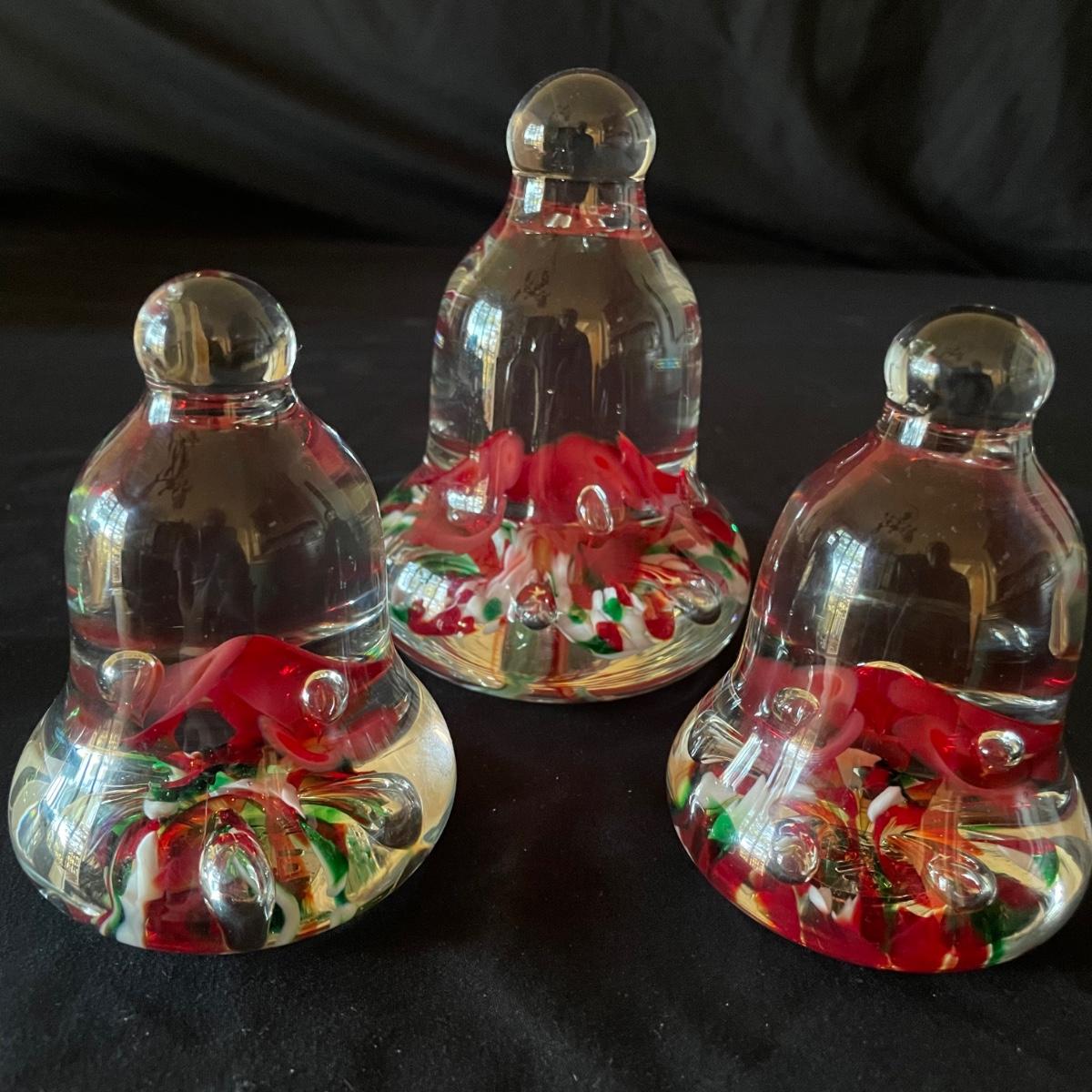 All five pieces are by Joe Rice, Three of these bell shaped glass paperweights are a set, the fourth piece is very similar in size and colors and the lot includes a fifth piece that has a wood base with orange bulb that illuminates (in-line switch) the fir tree shaped glass top piece; tree with stand measures 4” d x 6”.