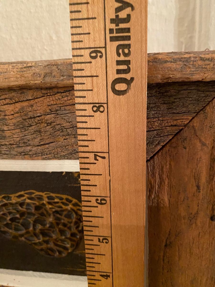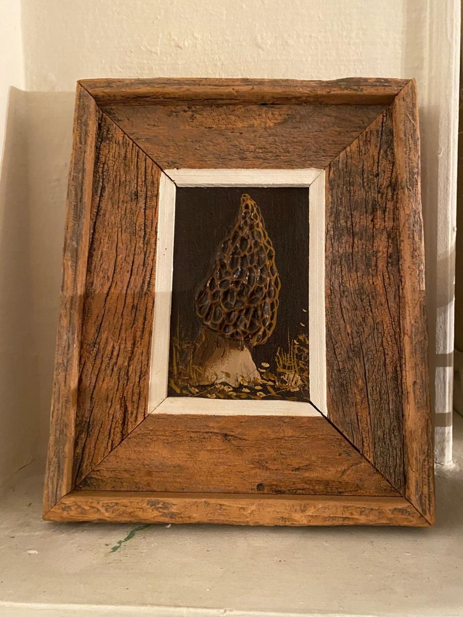 Joe Shell Morel vintage mushroom artwork, textured 3D style. Story of the artist on the back. Wood frame. Piece evokes the country setting in which it was created. Great for any mushroom forager or lover