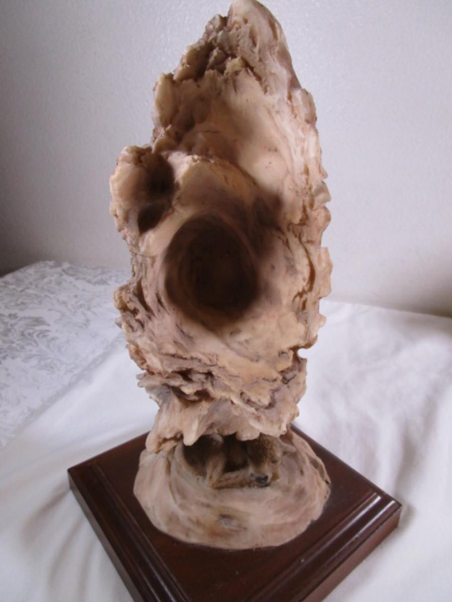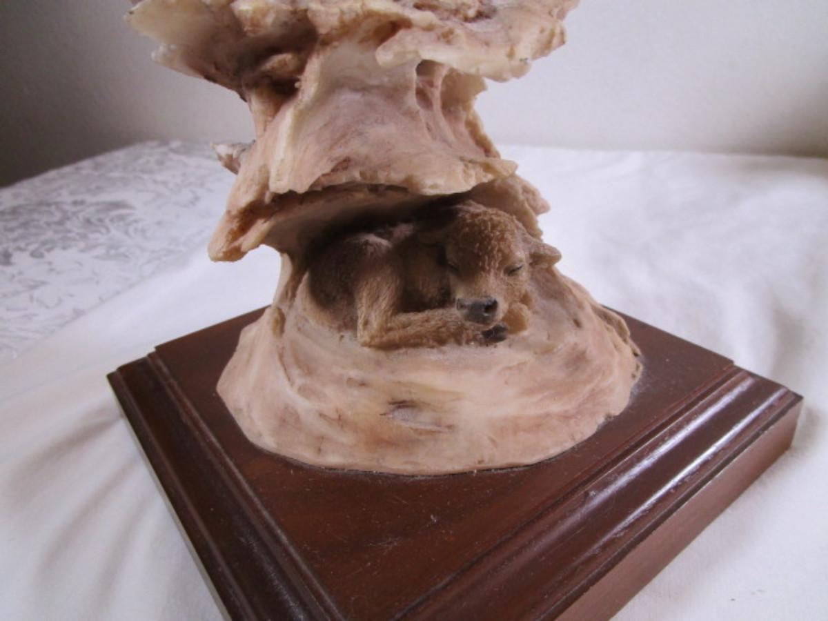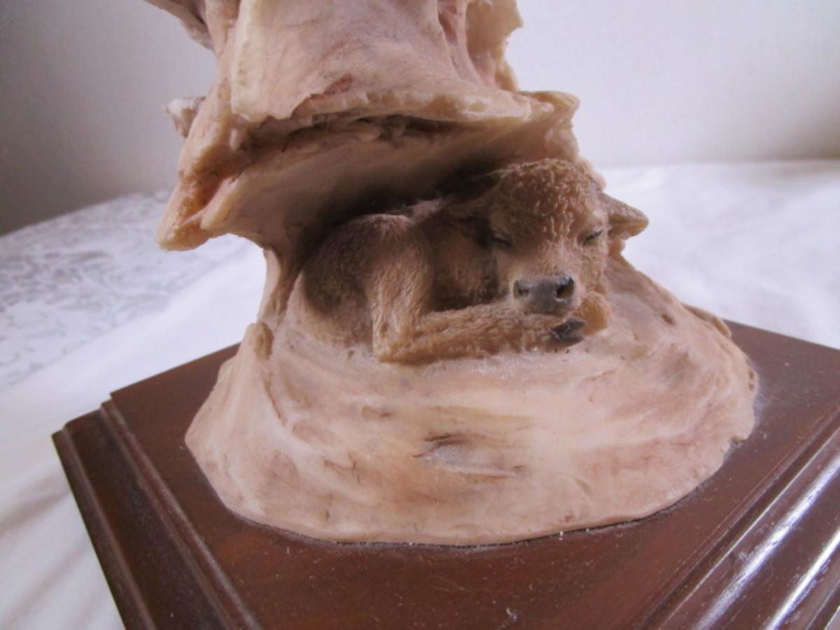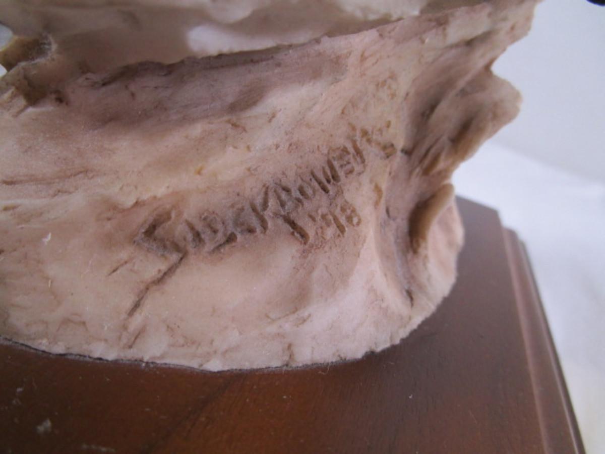 without stand 11" tall x 7-1/2" deep, wood stand is 1-1/4", autographed by sculptor. Each piece is expertly cast using porcelain/alabaster powders and fine resin and then hand-painted with the finest acrylics.