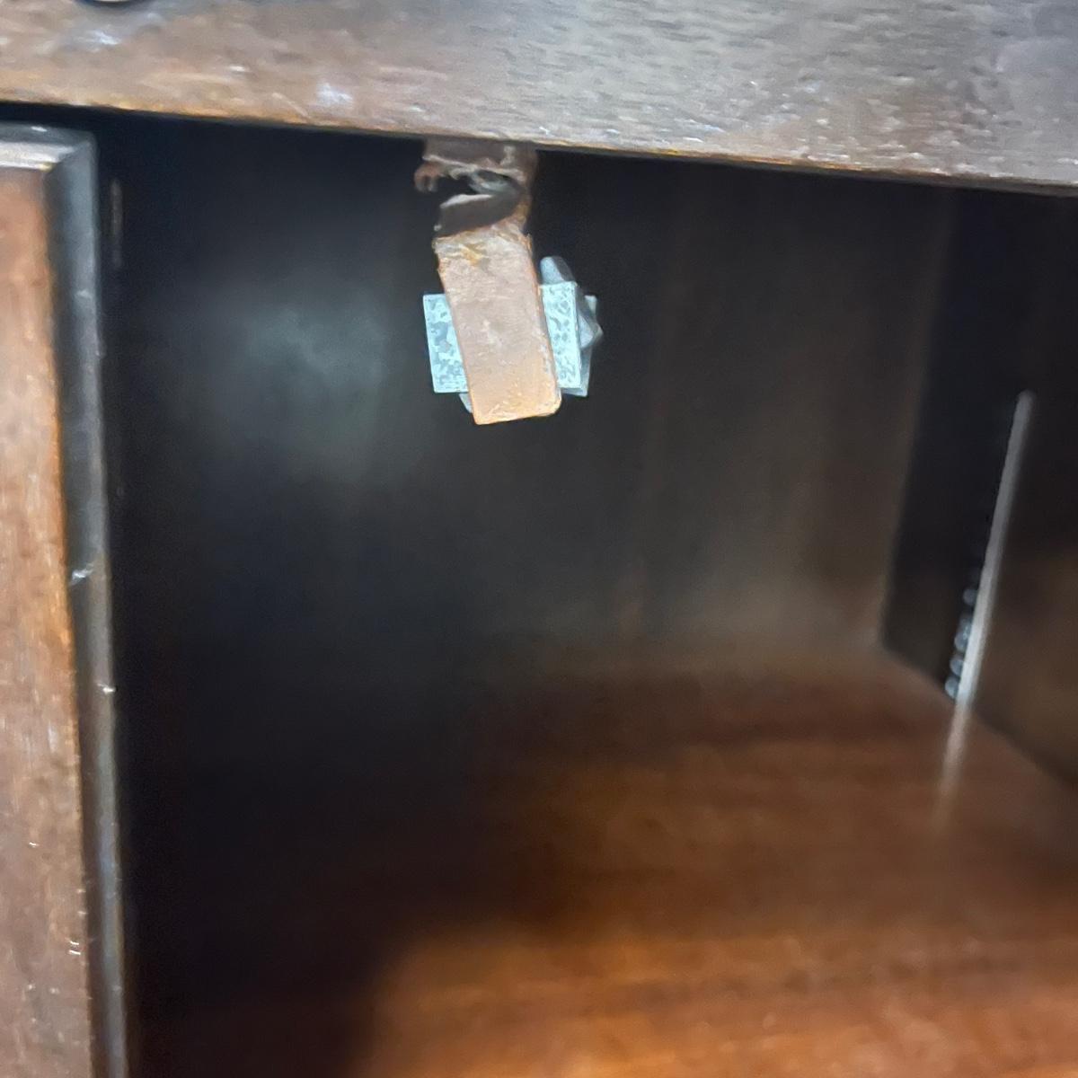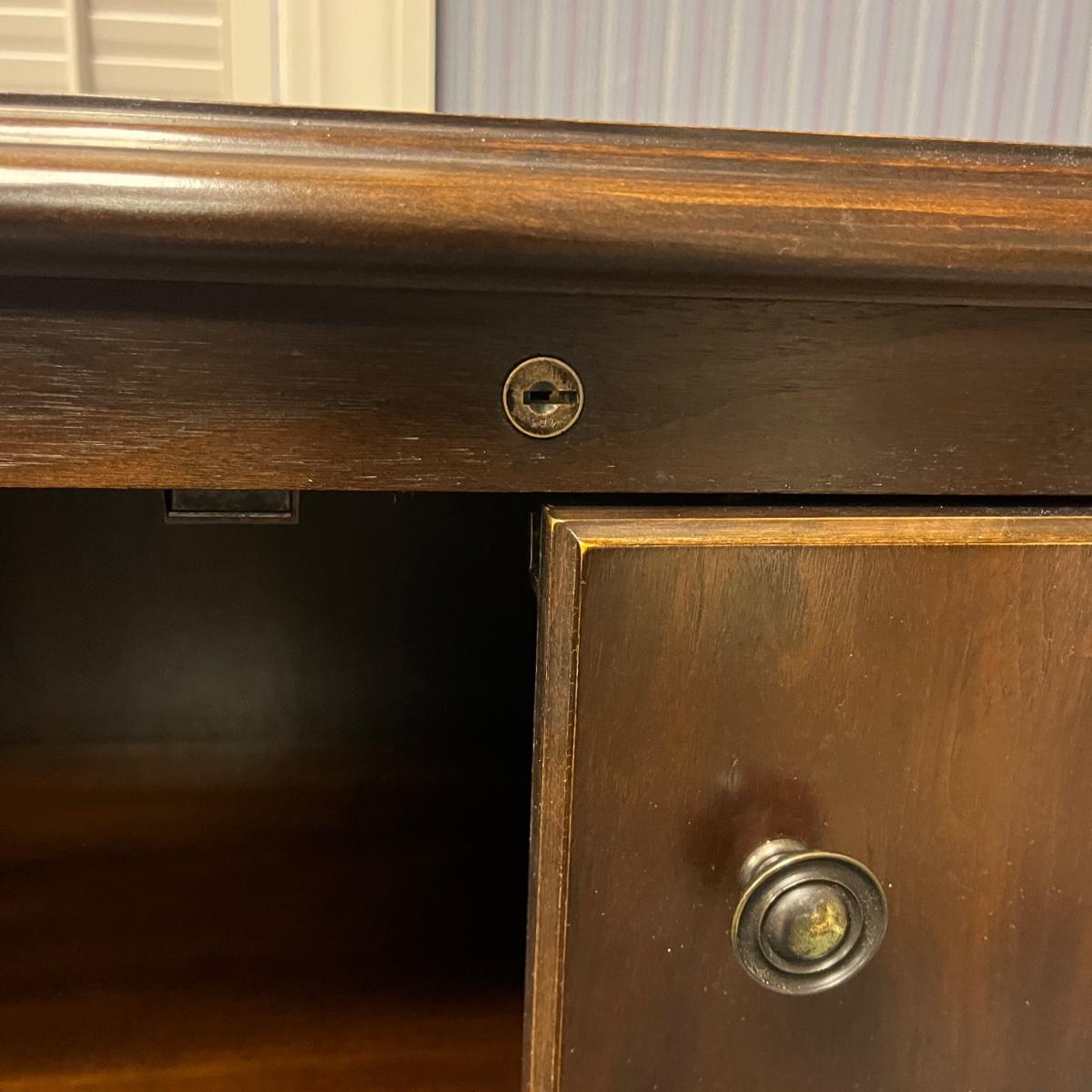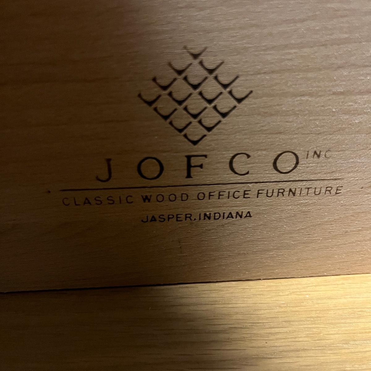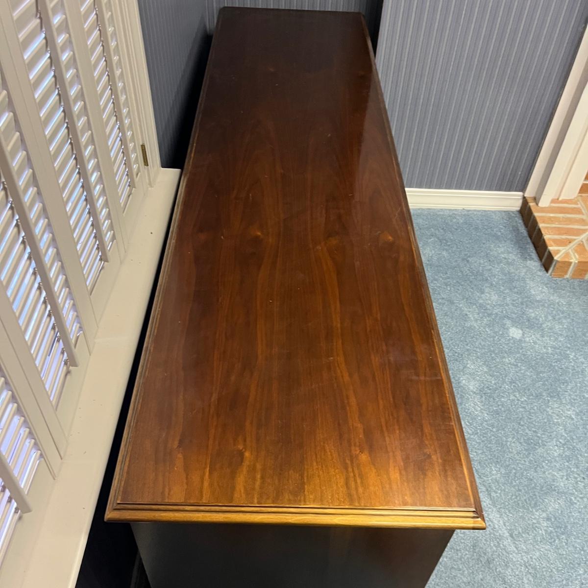 This solid wood Jofco credenza has four dovetailed drawers with a cabinet in the middle with one adjustable shelf. Credenza measures 71” x 20” x 29.5”H. This item matches a desk in auction. No key is included and one latch on cabinet door is broken, see pictures.