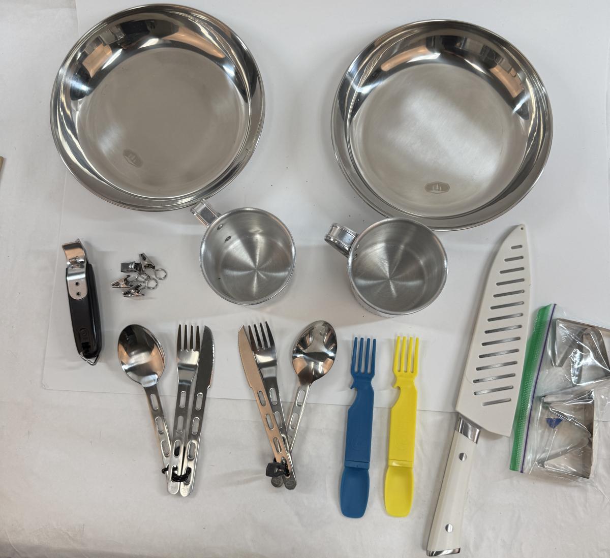 Camping / Picnicking Lot - metal plates, cups, utensils, Plastic utensils, picnic tablecloth anchors, knife, bottle opener