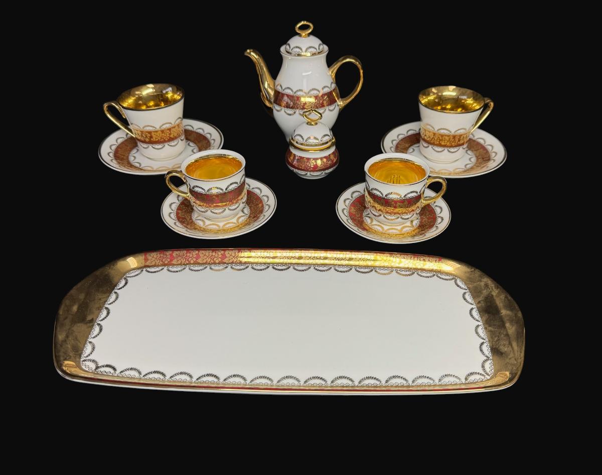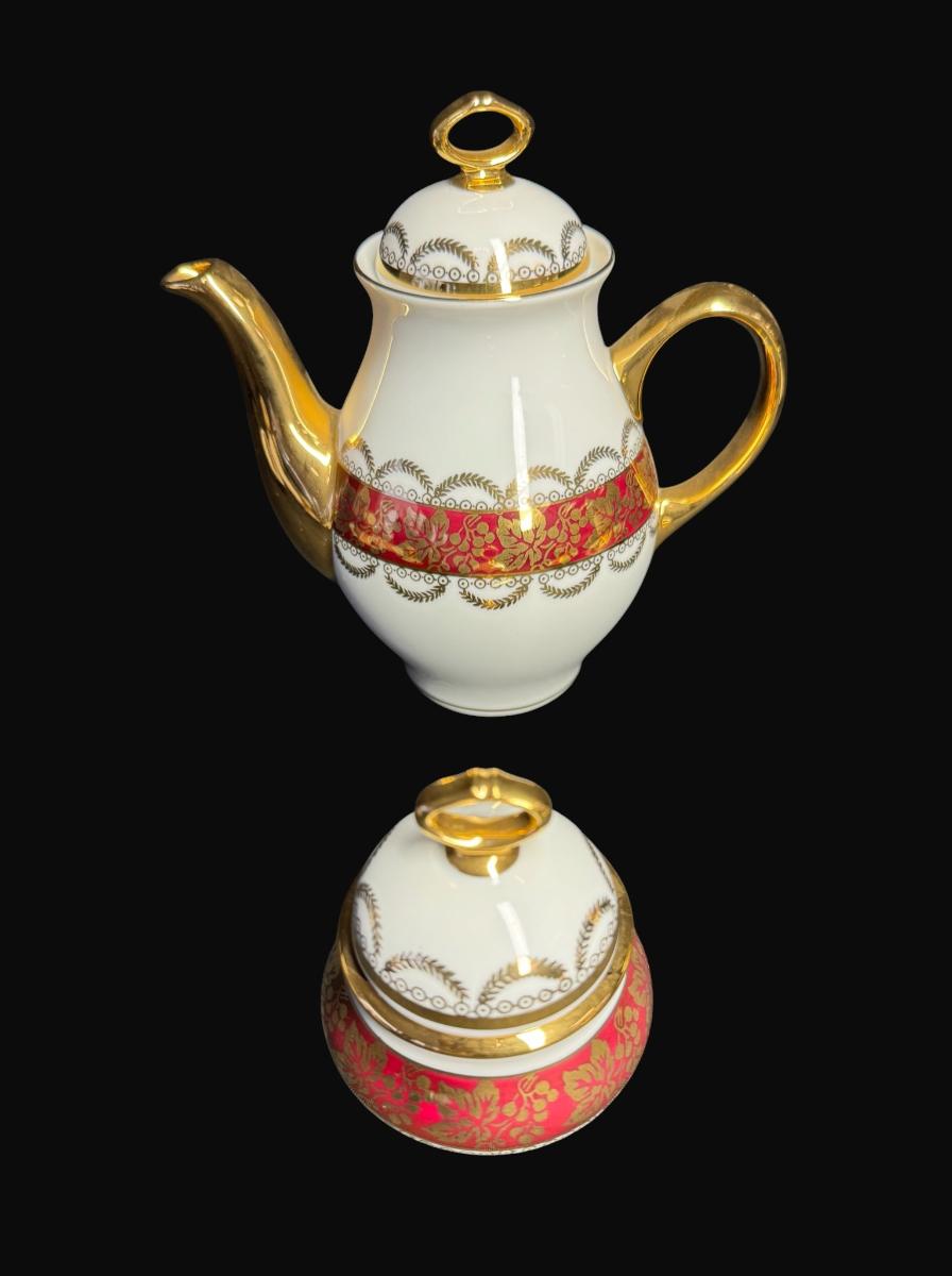 Service for two. Teapot, sugar bowl, tea cups, and saucers. [RE]
