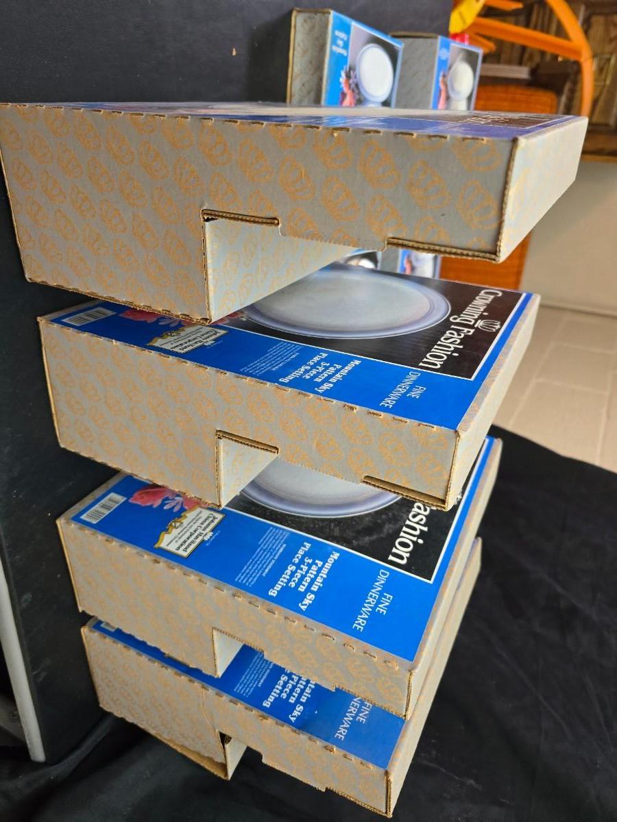 Boxes may have some damage - dinnerware never opened or used (we took it out if the plastic packaging holding the set together)