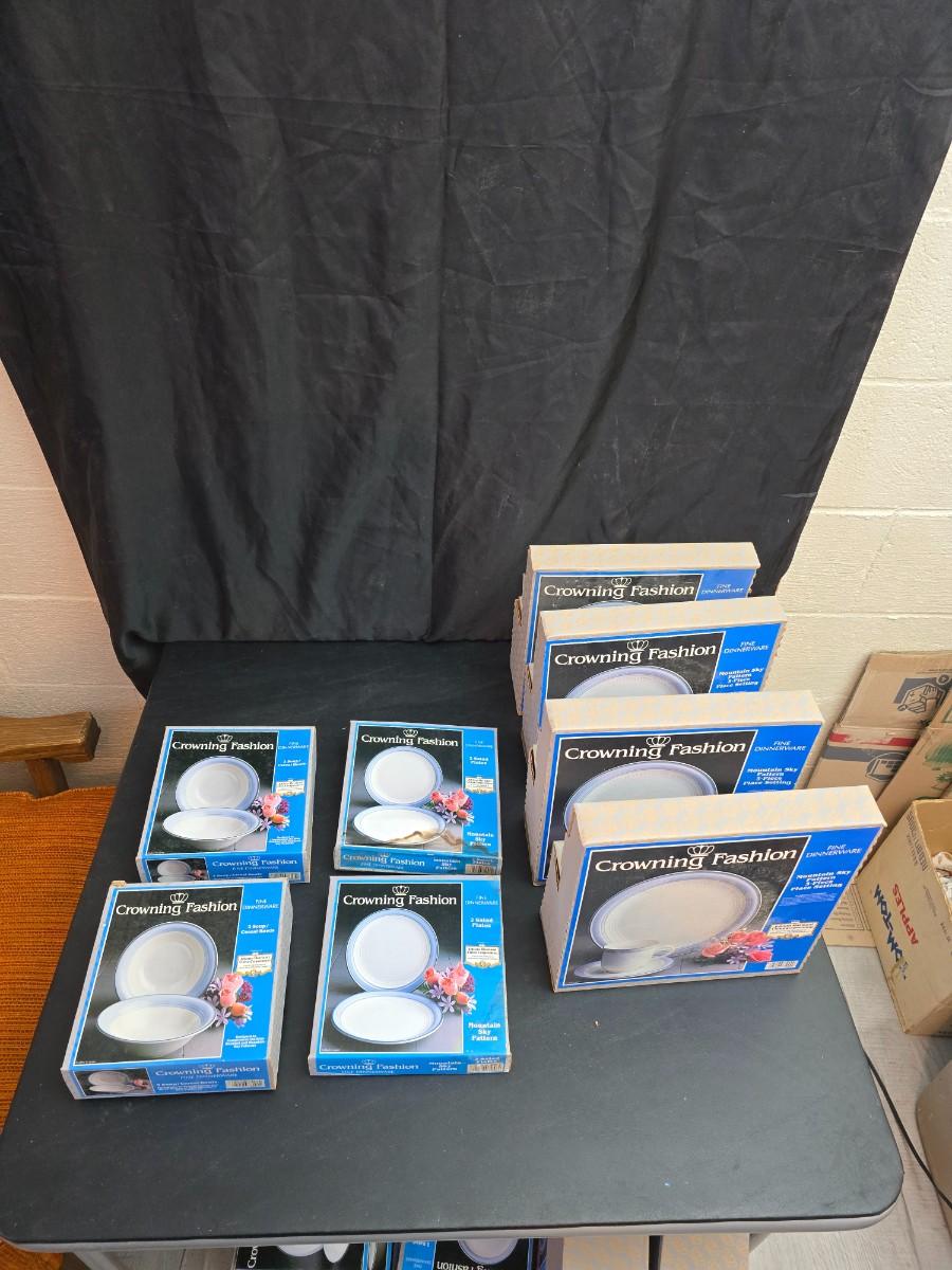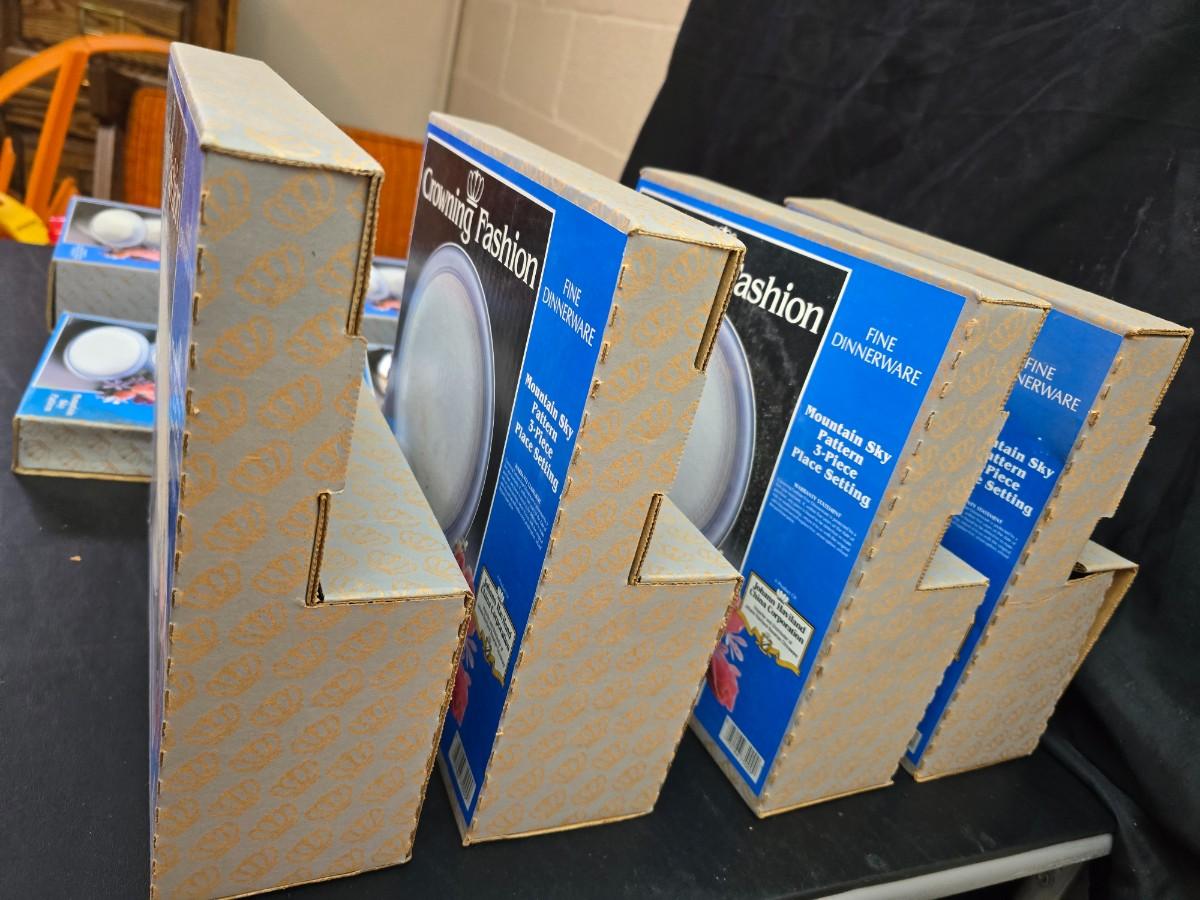 Boxes may have some damage - dinnerware never opened or used (we took it out if the plastic packaging holding the set together)