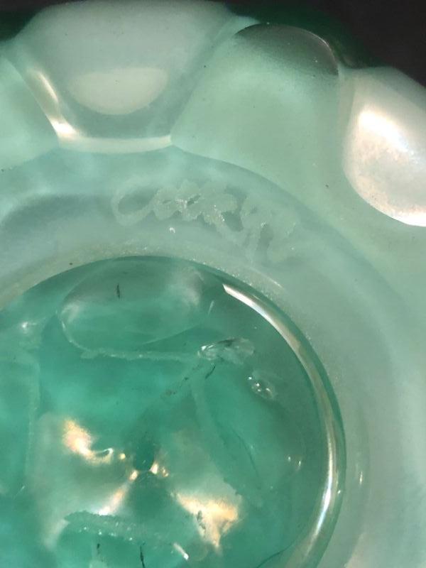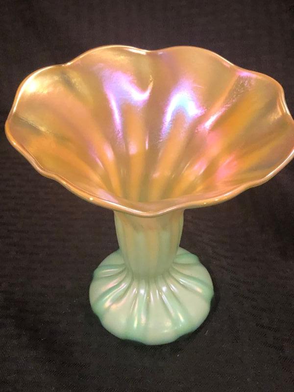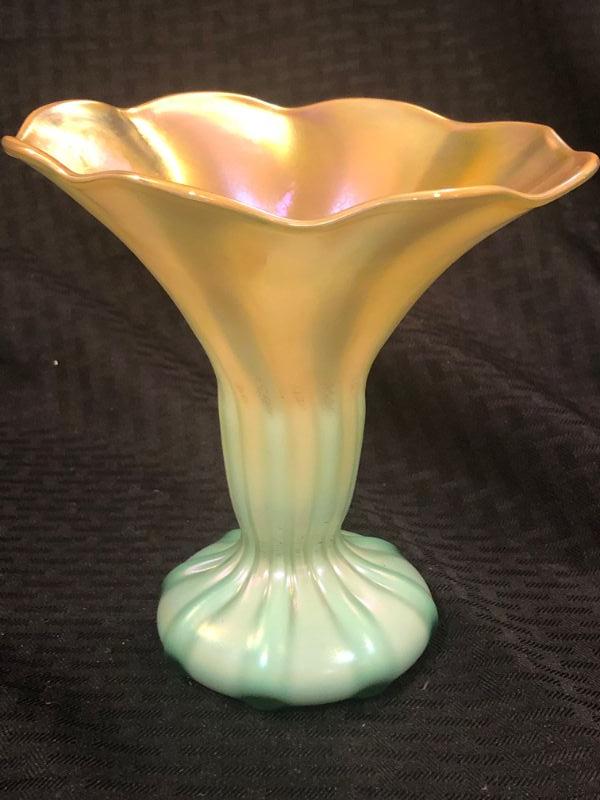 Signed John Cook Art Glass Trumpet Vase. Iridescent Gold Interior, Beautiful Iridescent pale Green Exterior.