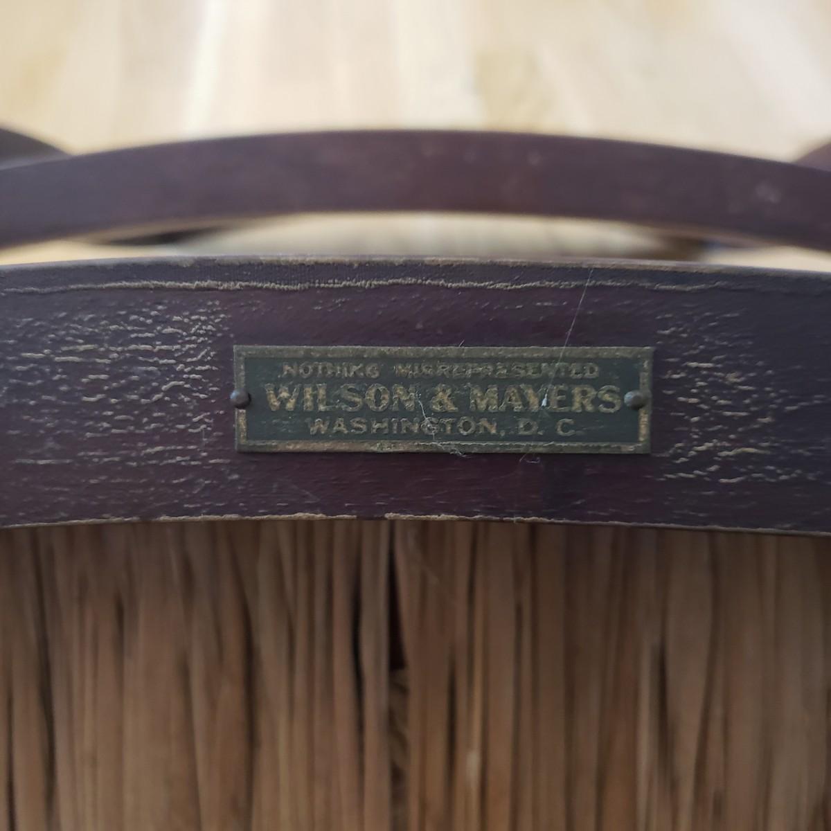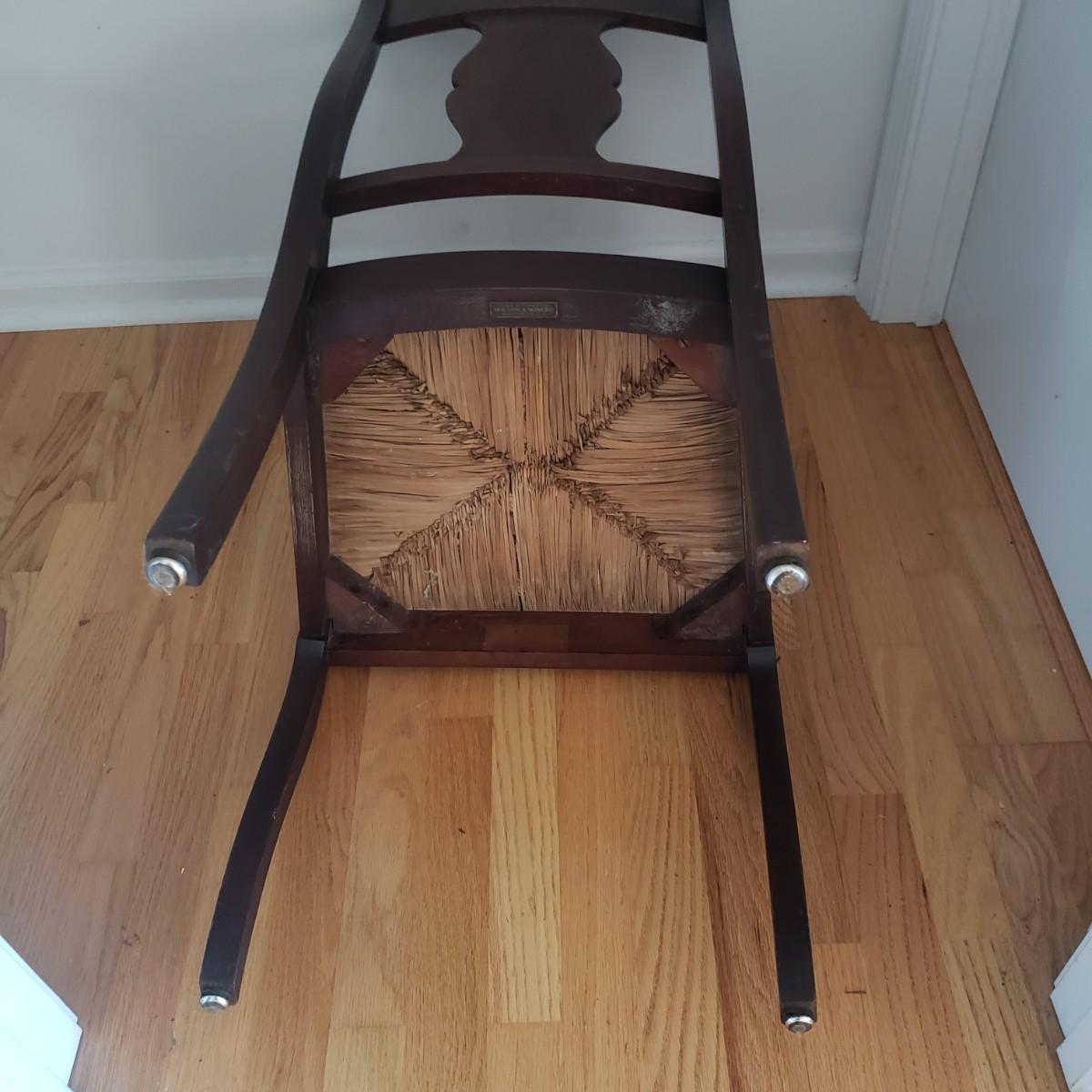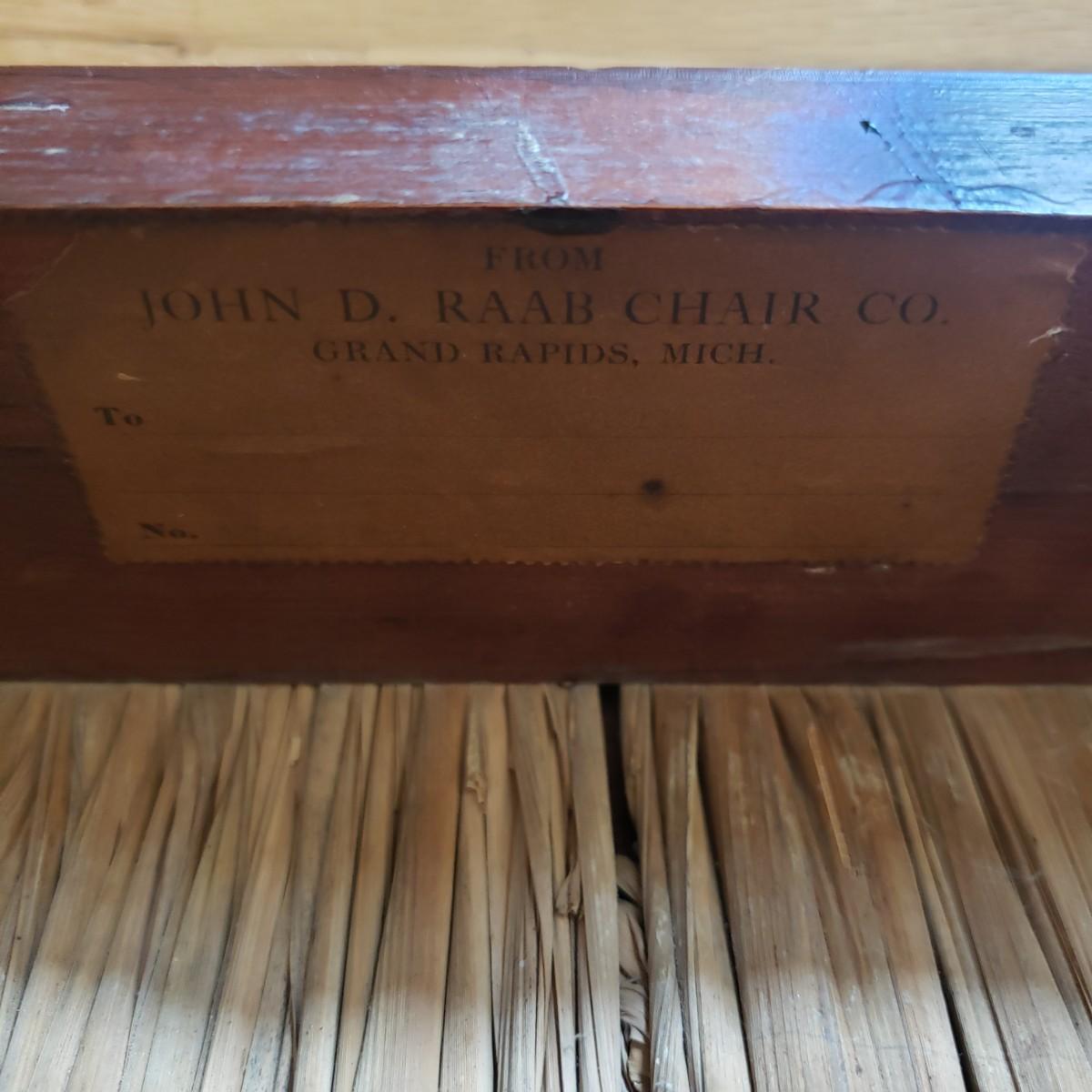 The wooden chair with a woven rush seat measures 16" x 18" x 36"H. The seat height is 17". The sticker says John D. Rabb, yet there is also a metal tag saying Wilson and Mayers from Washington D.C.