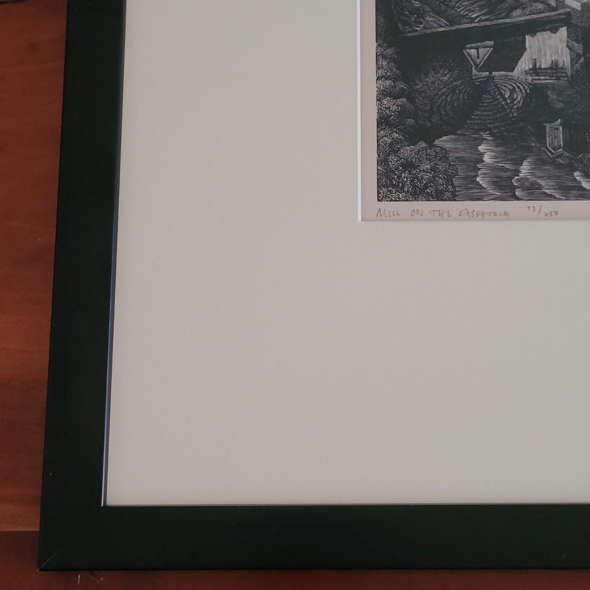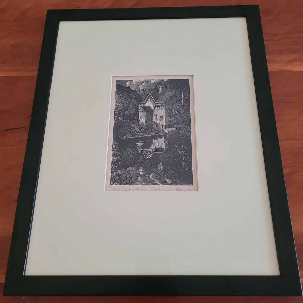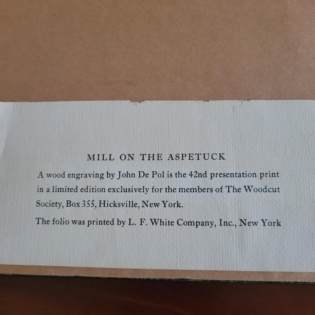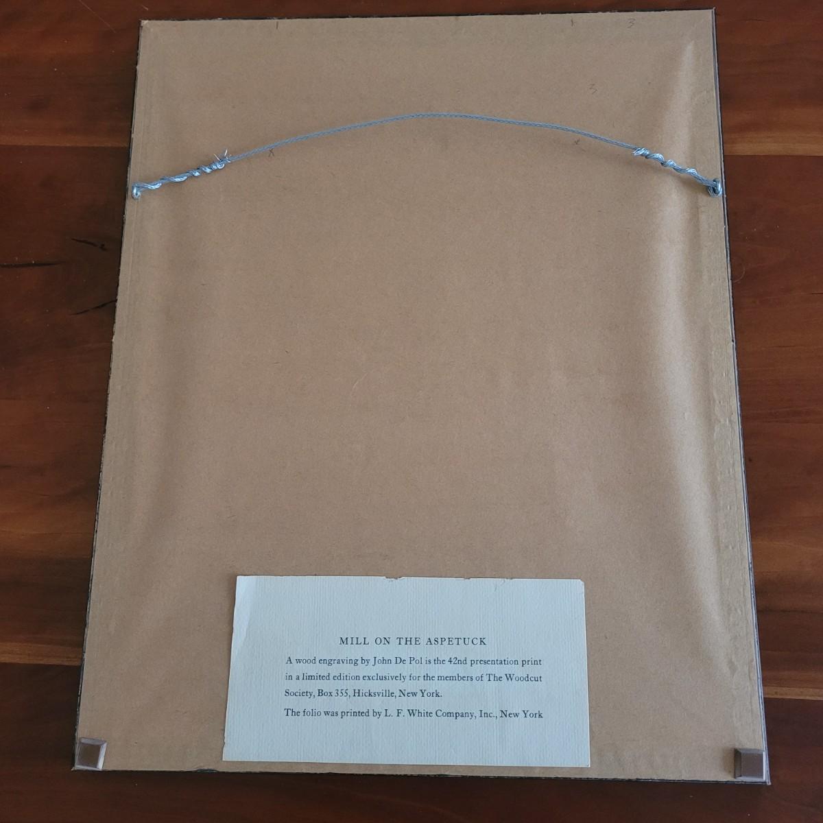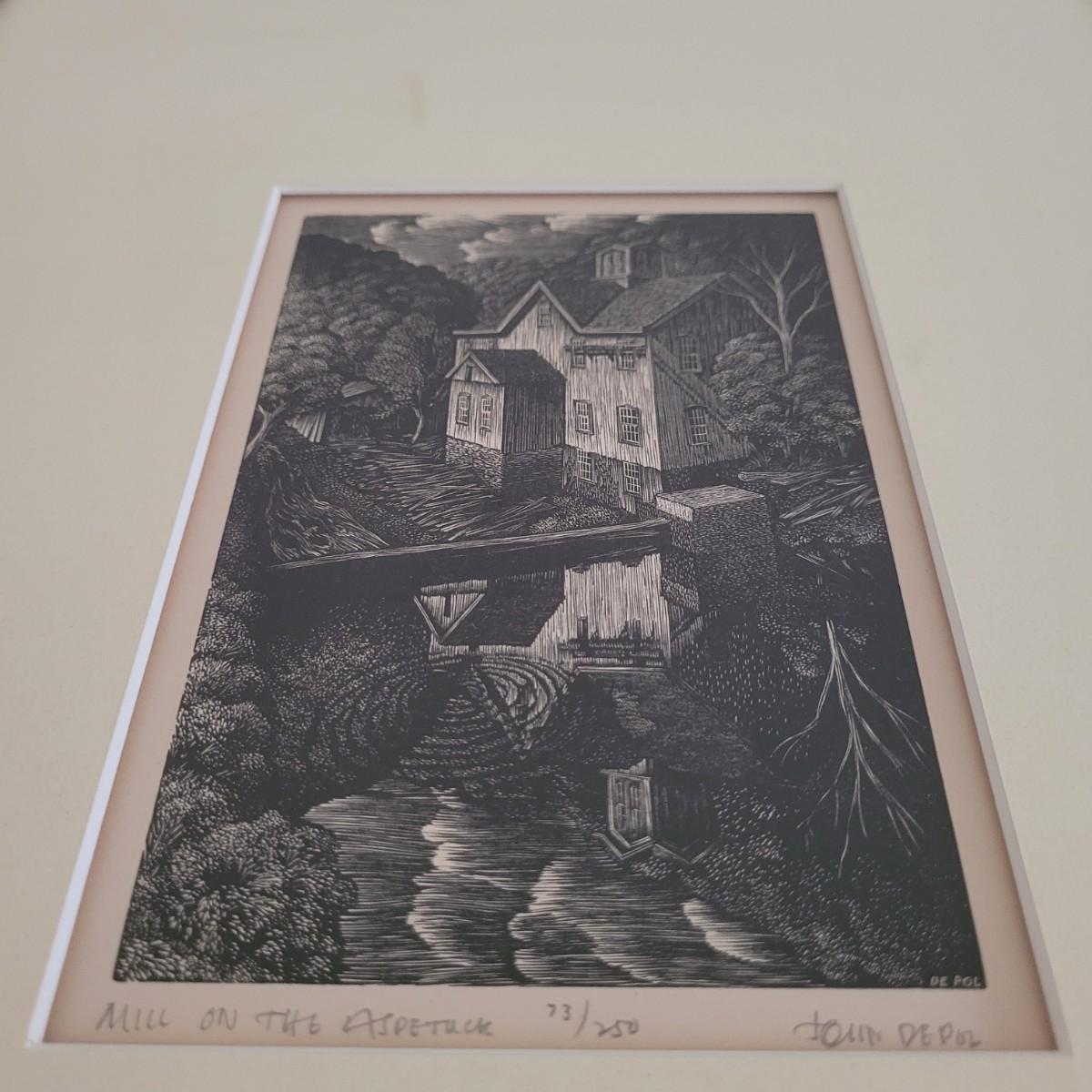 This lot includes an original wood engraving print by artist John De Pol titled "Mill on the Apetuck". It is a limited edition print made exclusively for the members of the Woodcut Society in Hicksville, New York. It is titled, signed, and numbered (77/250) in pencil. Piece is matted and framed under glass. The wood frame measures 12" x 15"H.