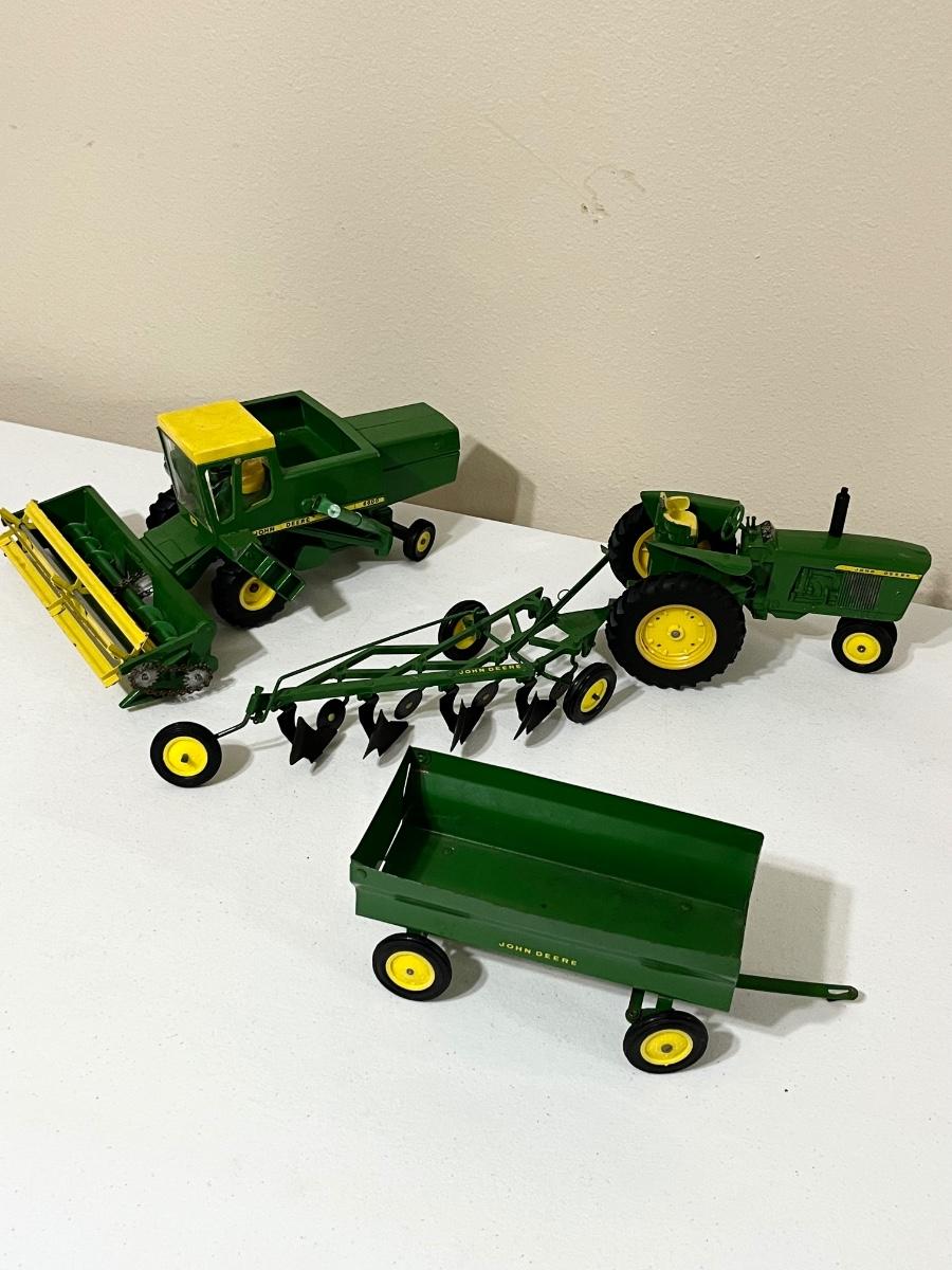 JOHN DEER ~ Vtg . Die Cast Metal Combine & Tractor With Two (2) Attachments