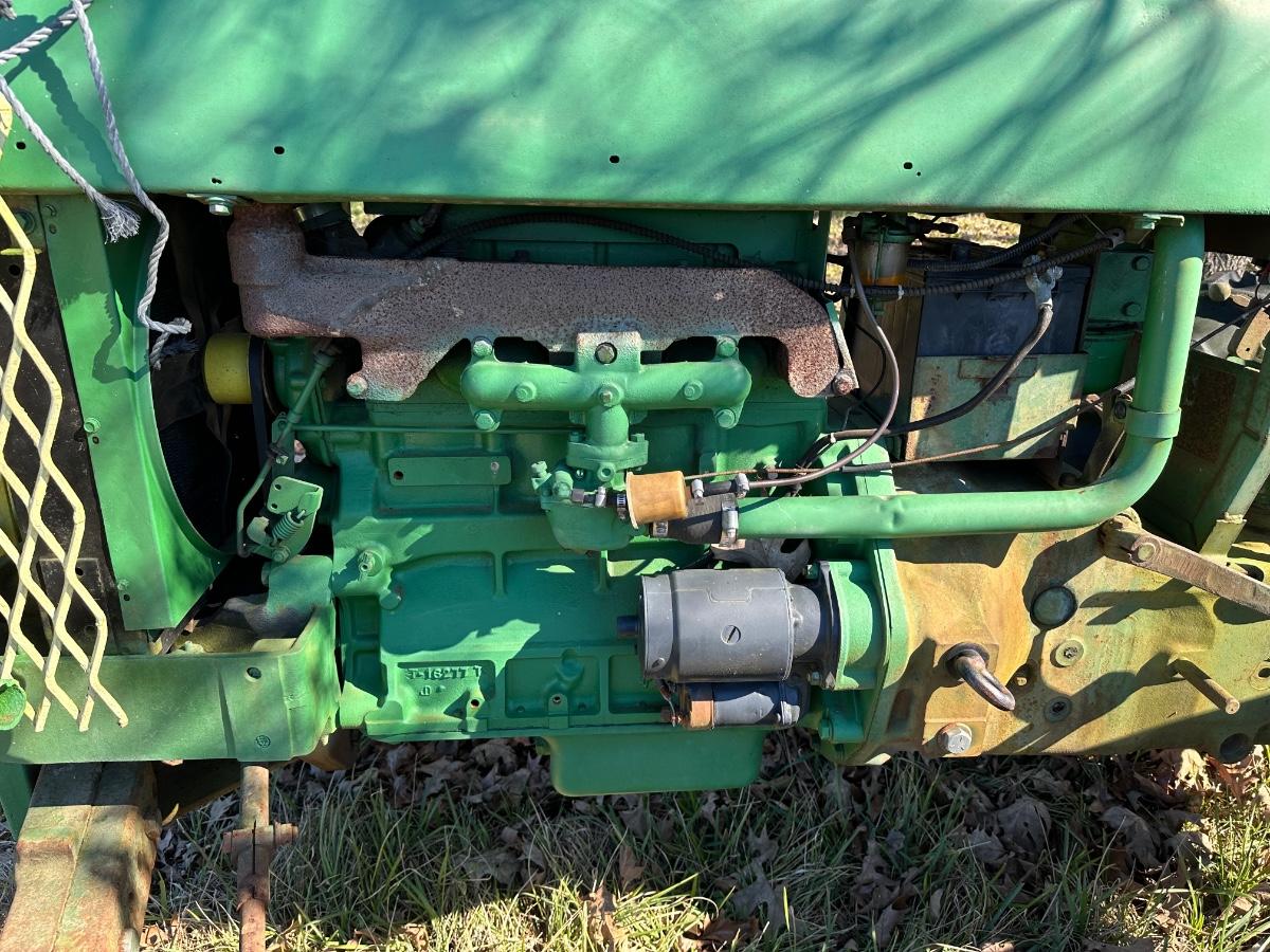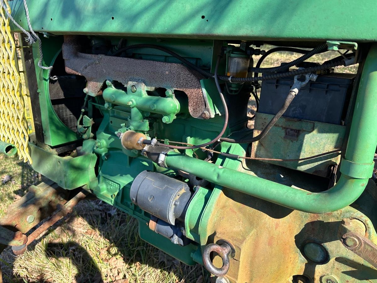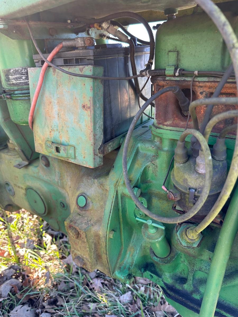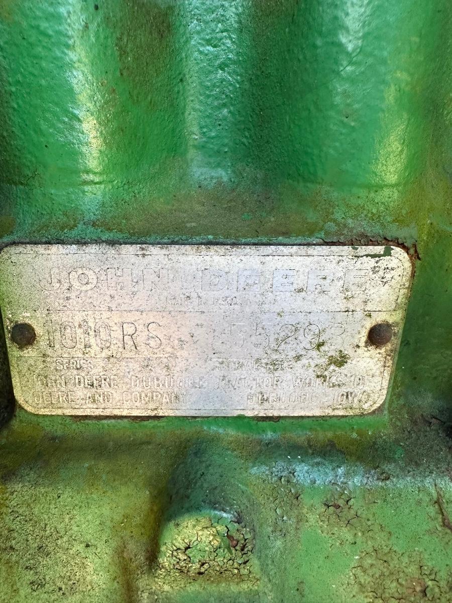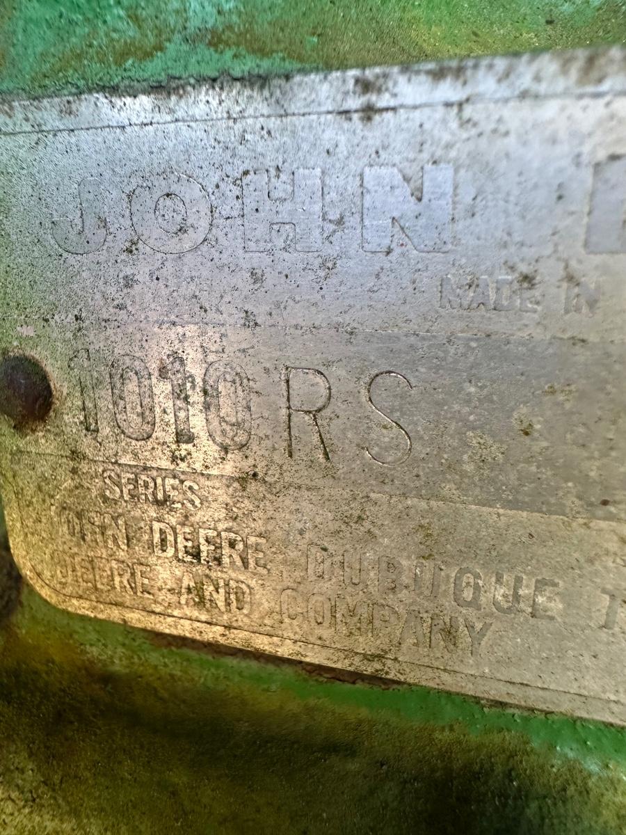 John Deere 1010 RS row-crop gasoline tractor. Engine turns over freely with a jump box. Based on condition, this tractor would most likely run with a carburetor rebuild, if that, and basic fuel system service. Complete tractor with original components, showing normal age, wear, and surface rust. Solid candidate for restoration, light farm use, or collector project.
