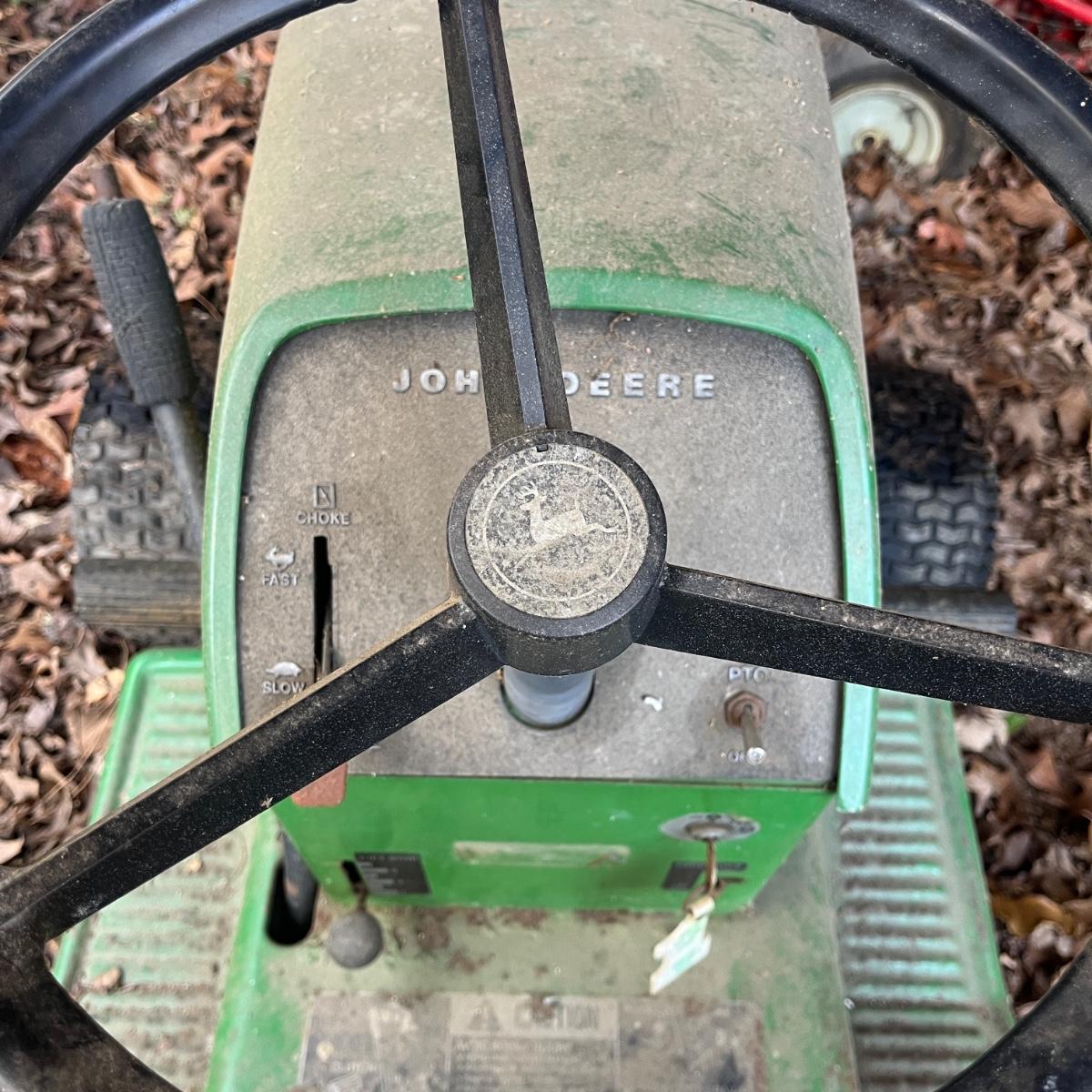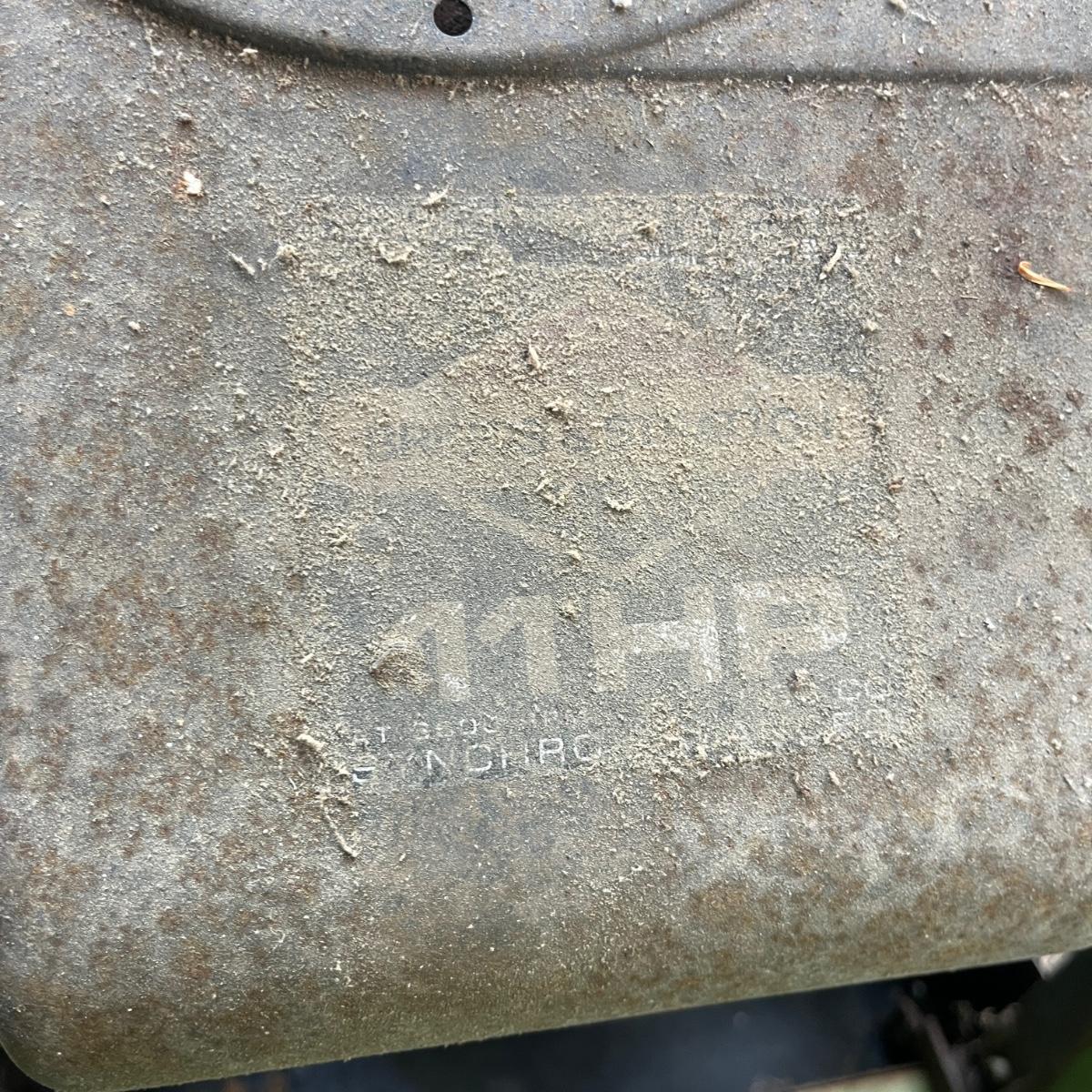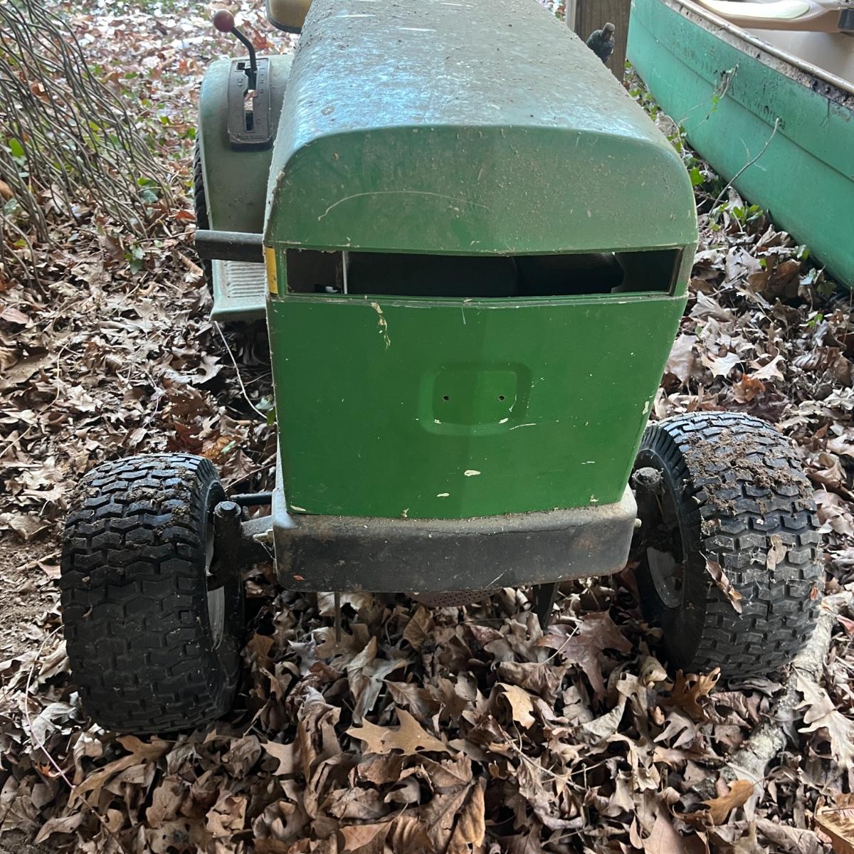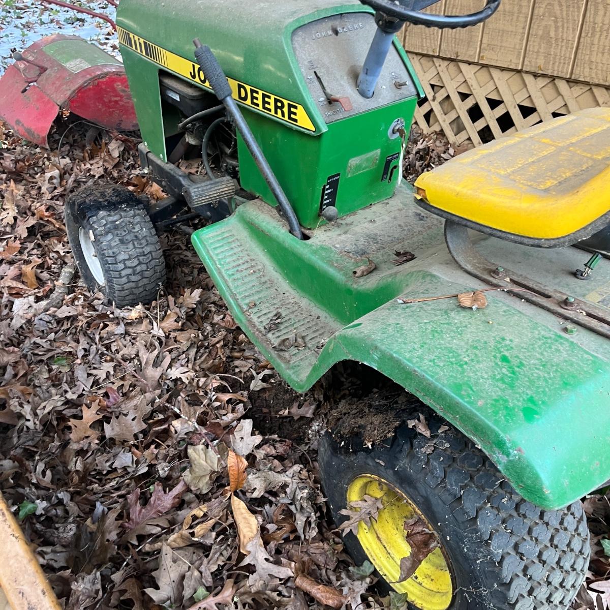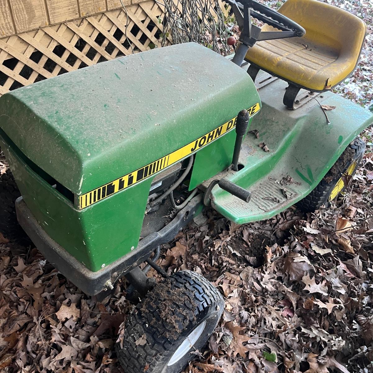 Lot includes a John Deere 111 riding mower with a Briggs & Stratton 11HP motor. Battery is dead so motor was not tested. There is no mower deck included. Tires are low on air.