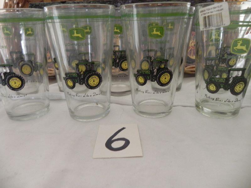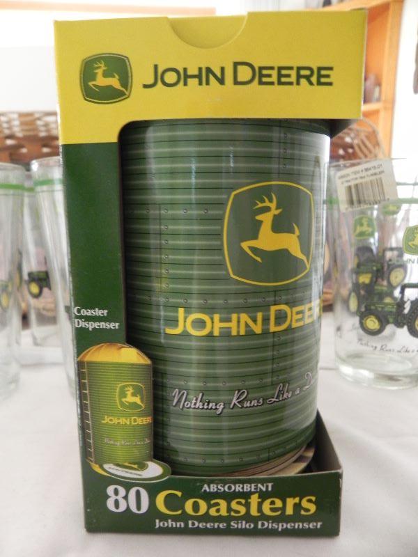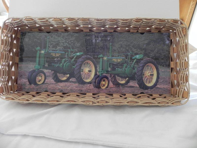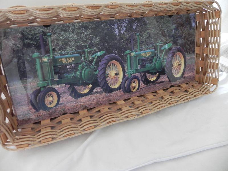 John Deere drinking glasses, Coasters (NIB), wicker framed tray or can be used as a wall hanging