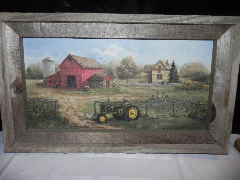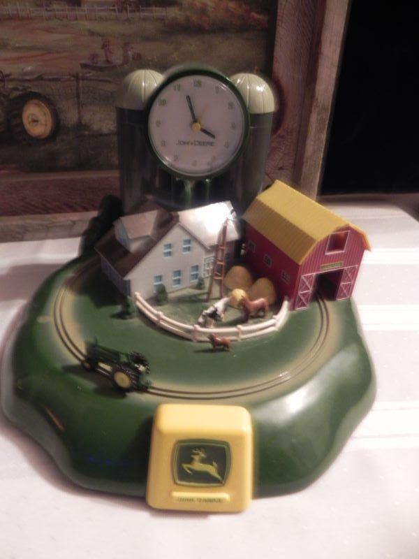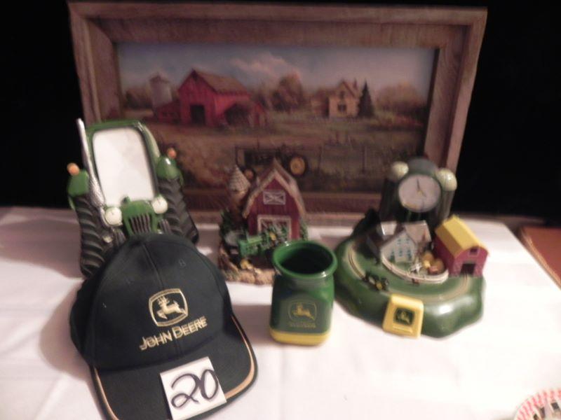 John Deere clock w/moving tractor, wood framed picture 25"Wx15"H, pencil holder, and more
