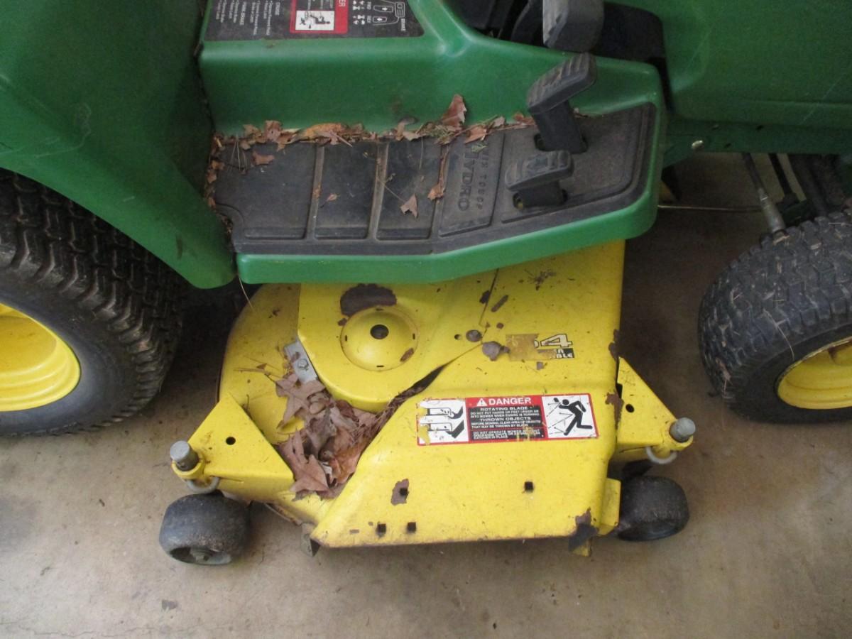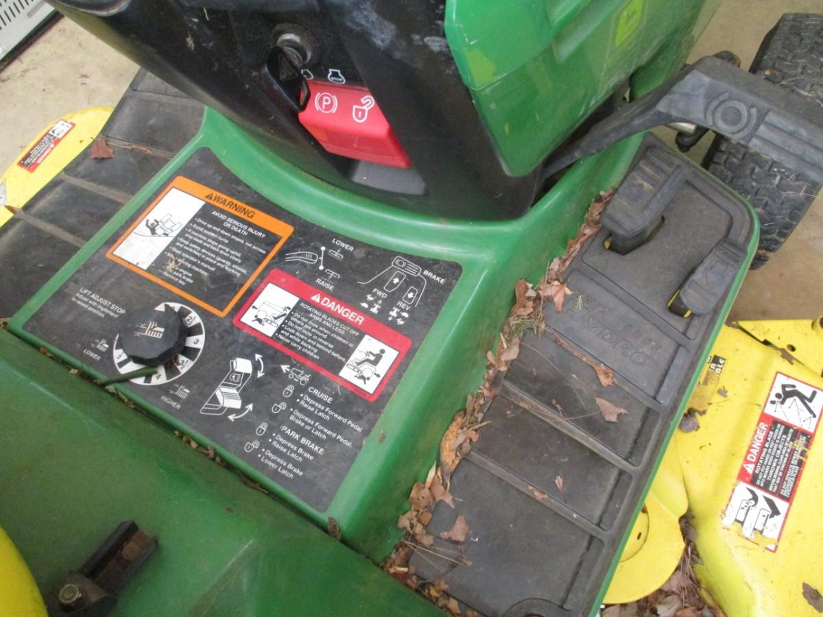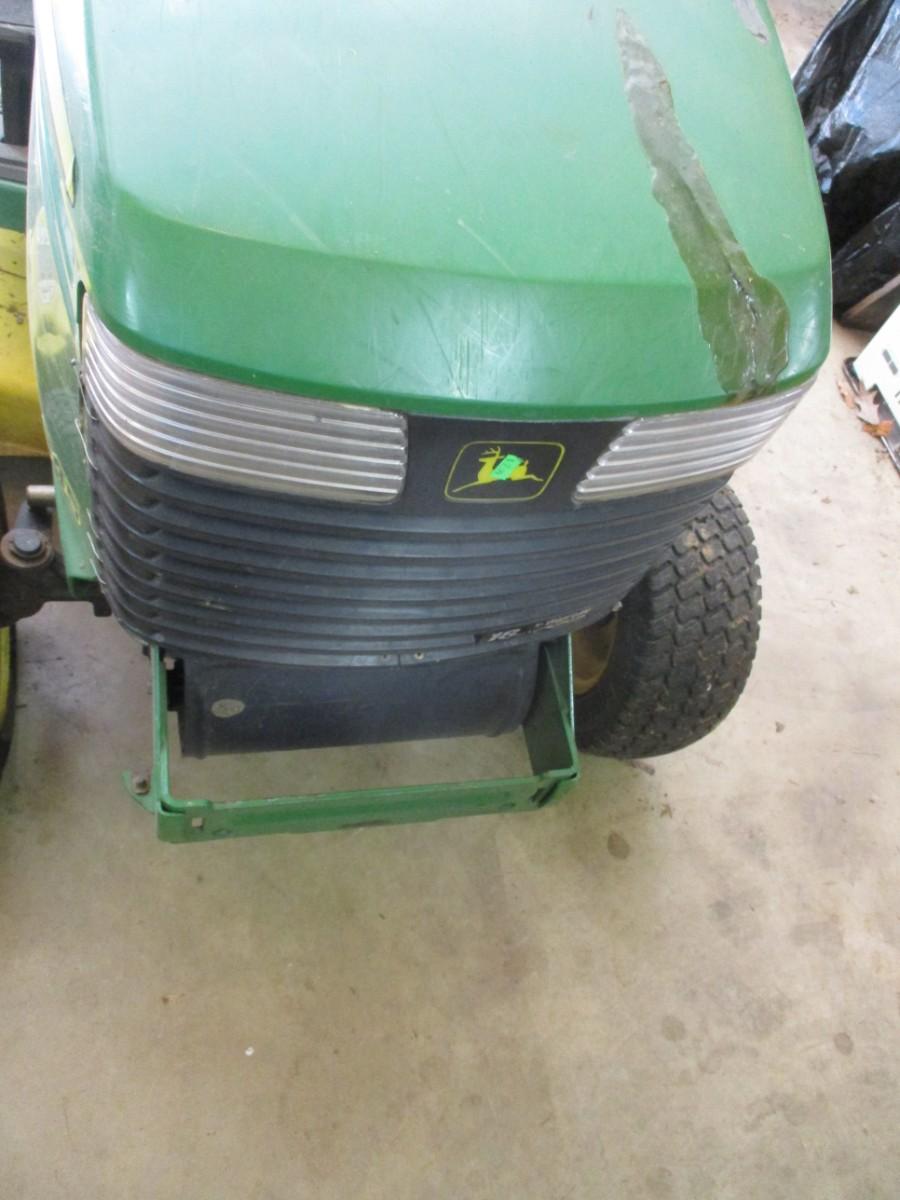 John Deere Lawn Mower Tractor was recently used to mow the estate lawn. Turned over on June 1, 2023. Bring assistance to load, however, in case it does not start on day of pick up. Hood has repair due to break as shown. Mower has approx 1315 hours.