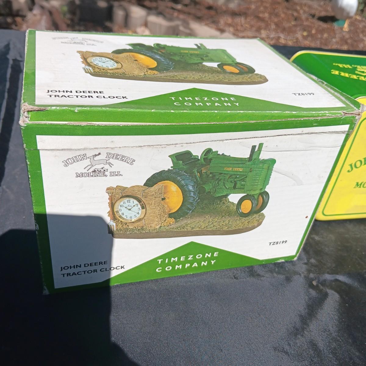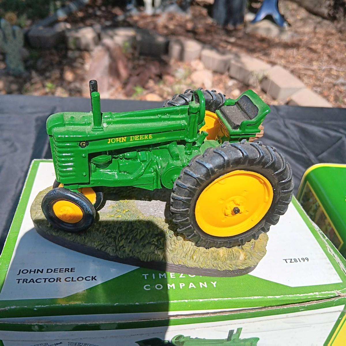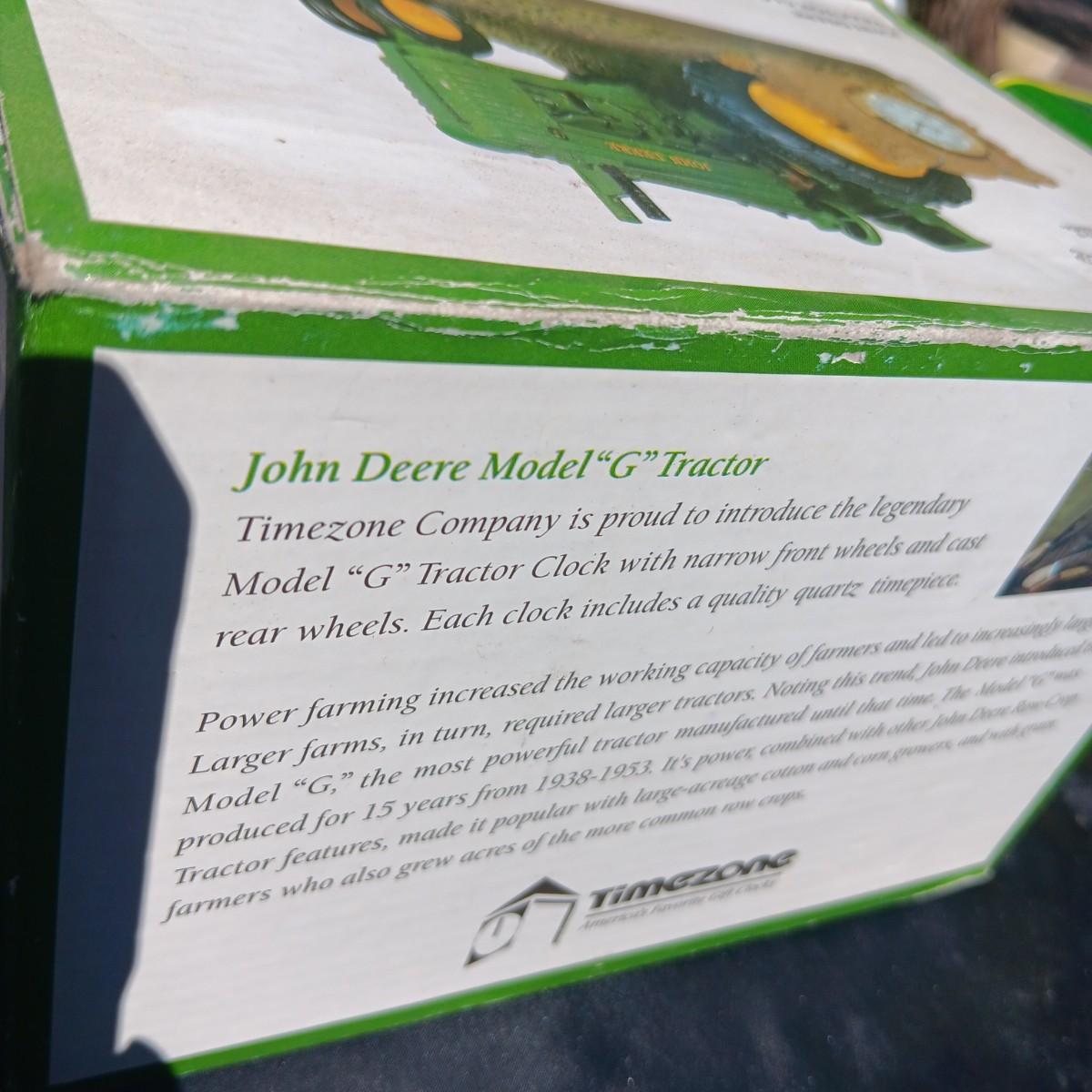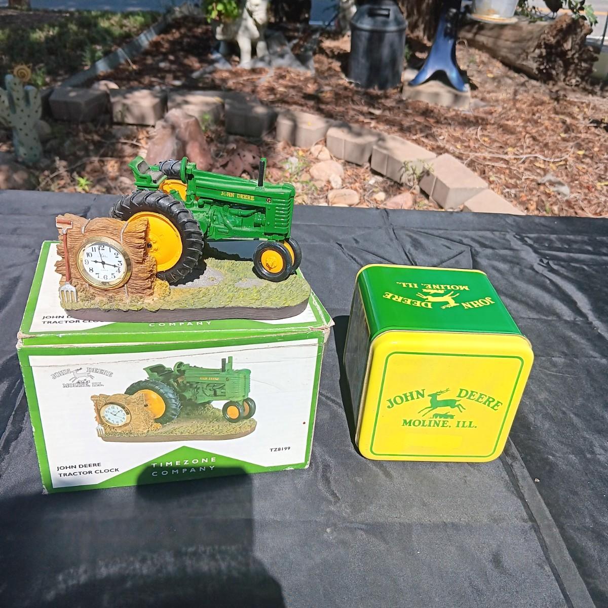 JOHN DEERE MODEL G TRACTOR CLOCK AND A TIN