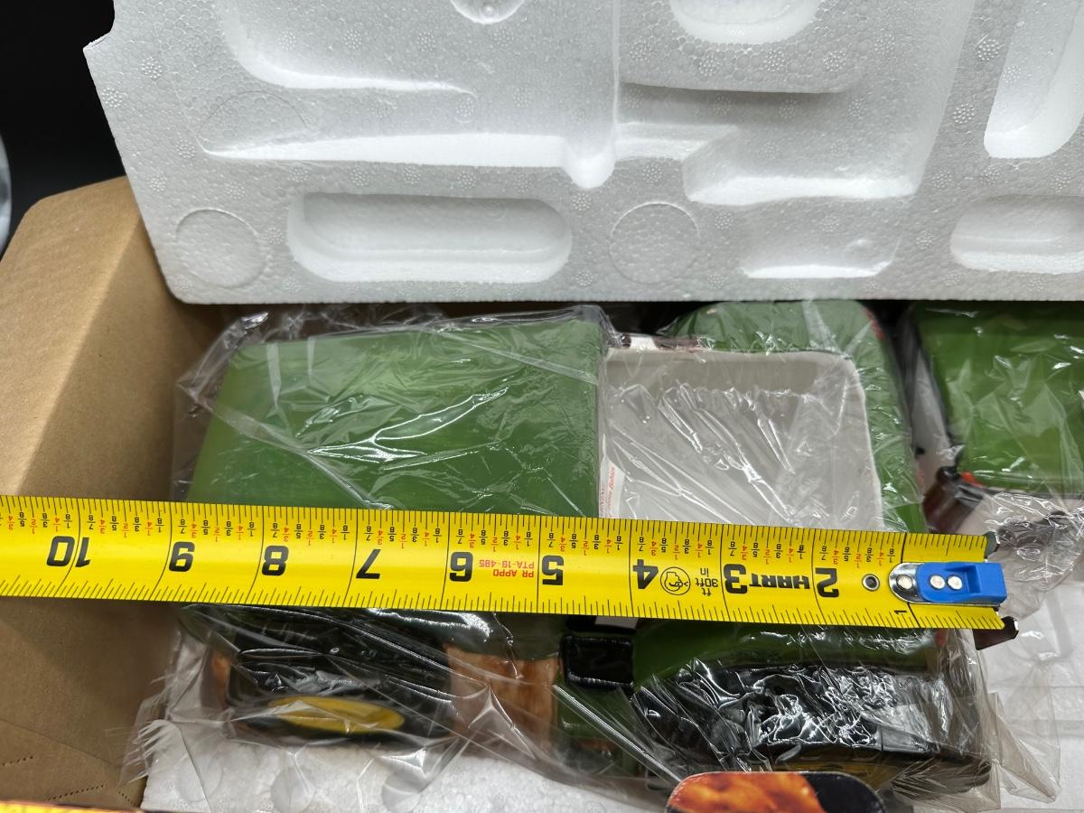 Officially licensed John Deere ceramic cookie jar shaped like a classic green tractor. Produced by Gibson (Everyday Gibson). Bright John Deere green and yellow with great detail—perfect for farmhouse kitchens, tractor collectors, or John Deere fans.