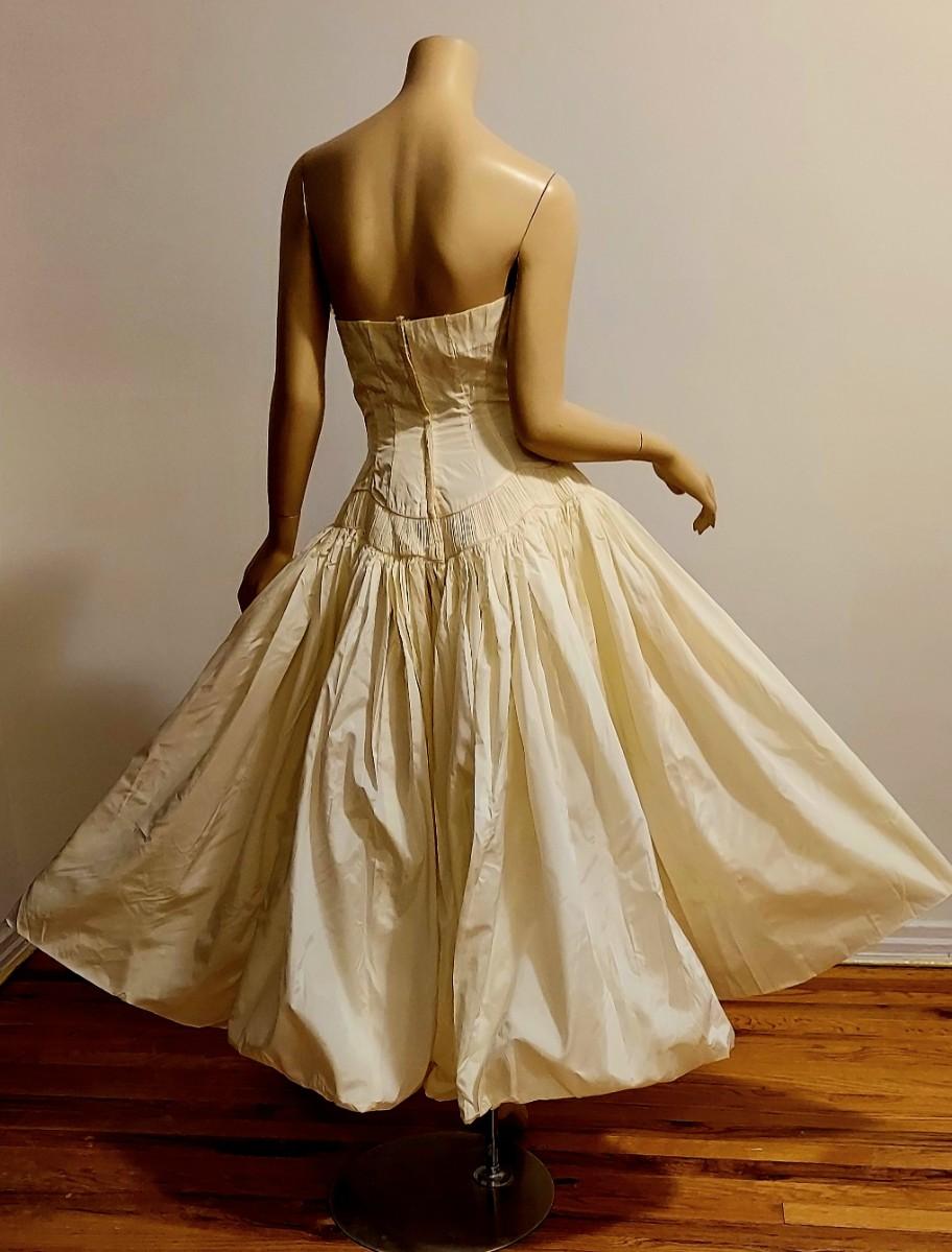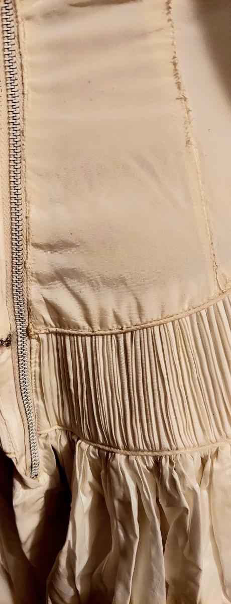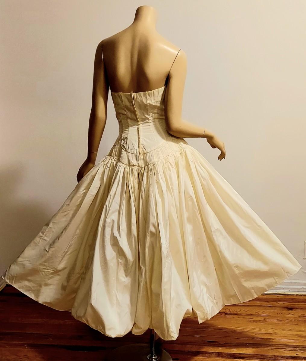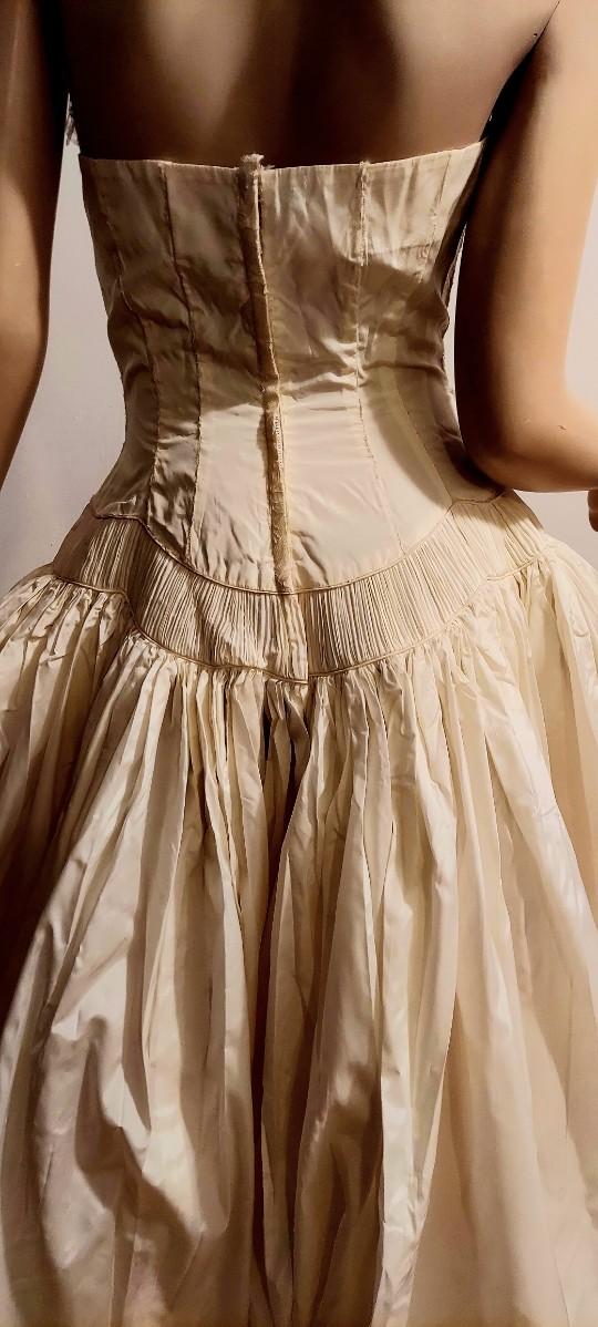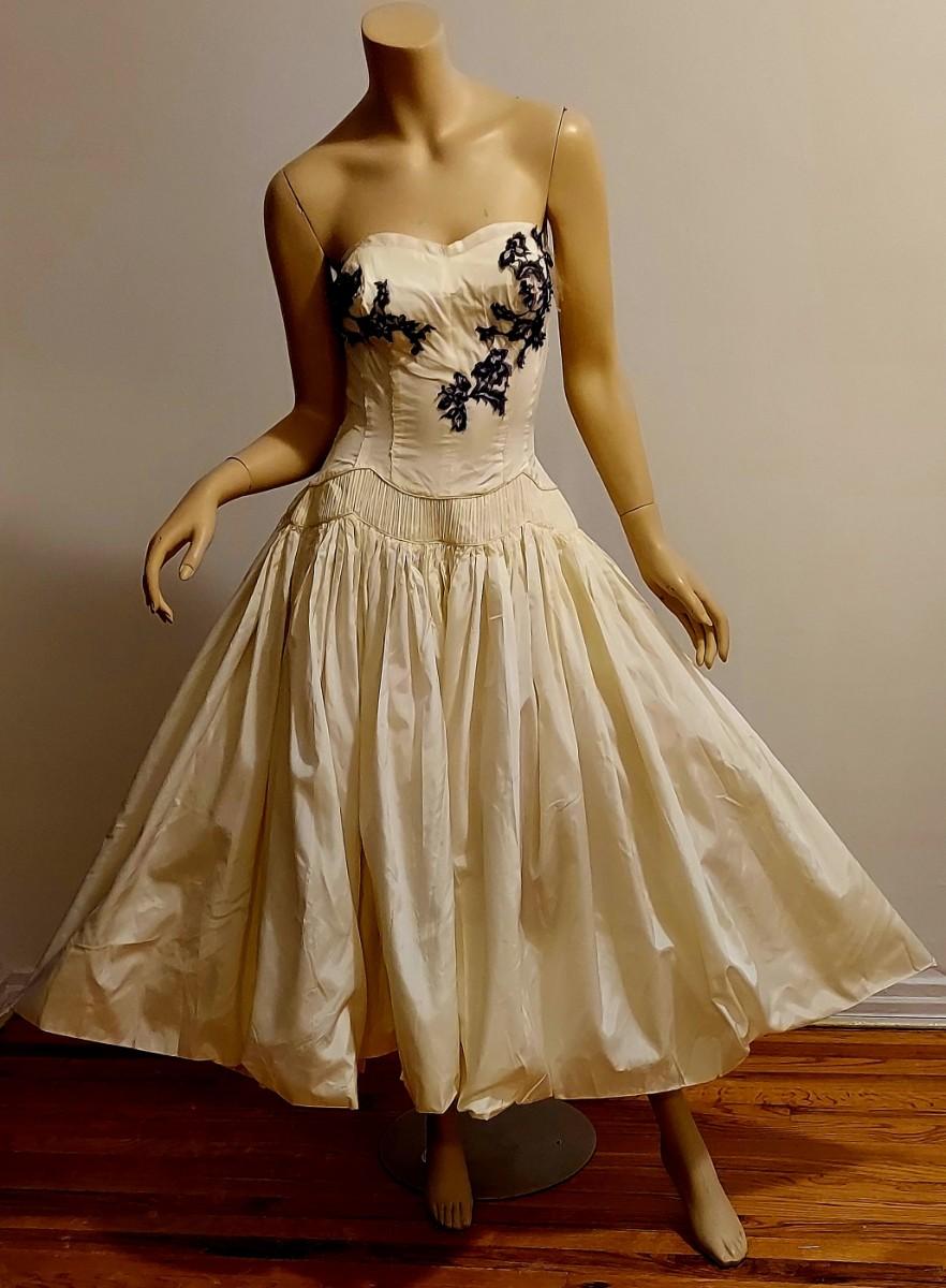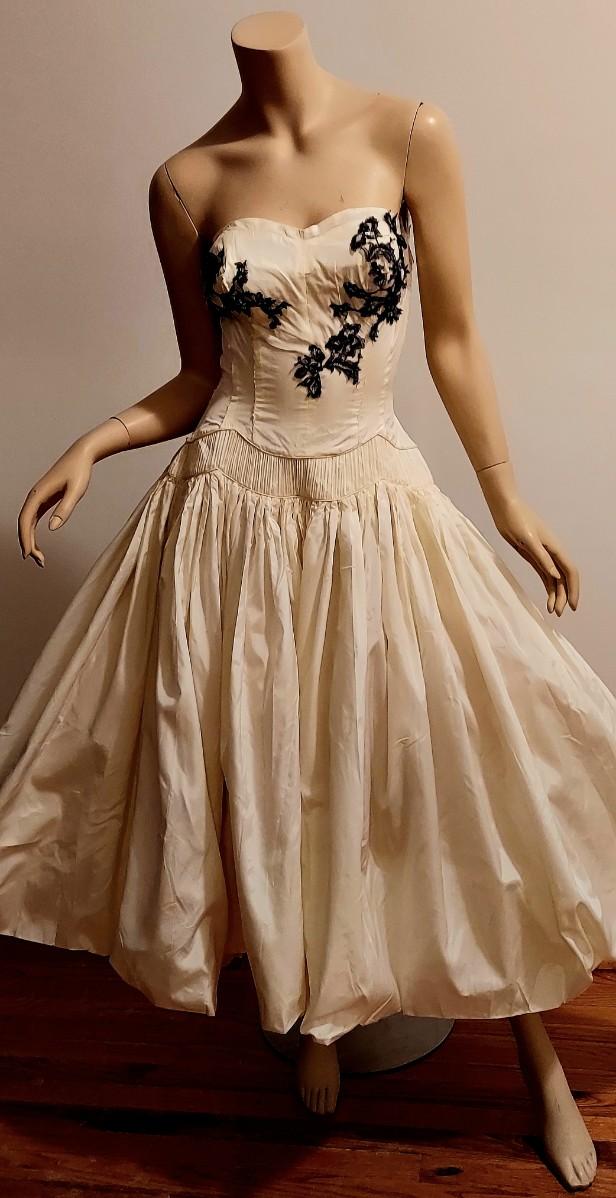 This one is truly amazing in beauty and Style. Strapless with French black lace applique at the Bodice. Bones at Bodice and back metal Zipper. It has Tulle Crinoline and Bouffant layer with Horse hair.