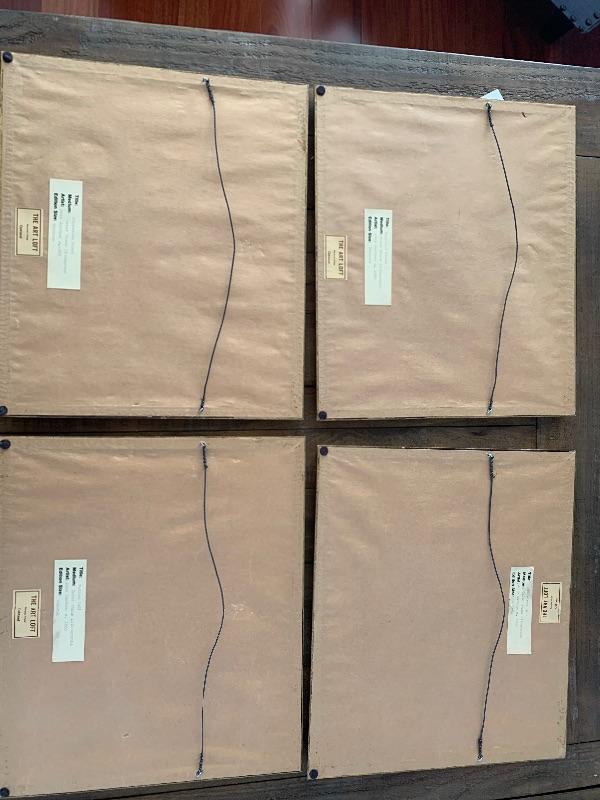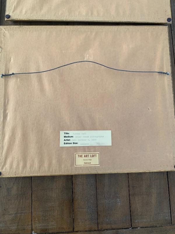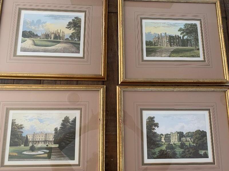 Lot includes rare set of four 24x36 John Gardner color stone lithographs (circa 1885) in gold wood frames. Set titles are Drakelowe Hall, Hughenden Manor, Hutton Hall and Eggreird House.