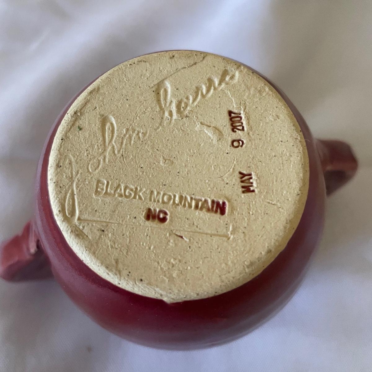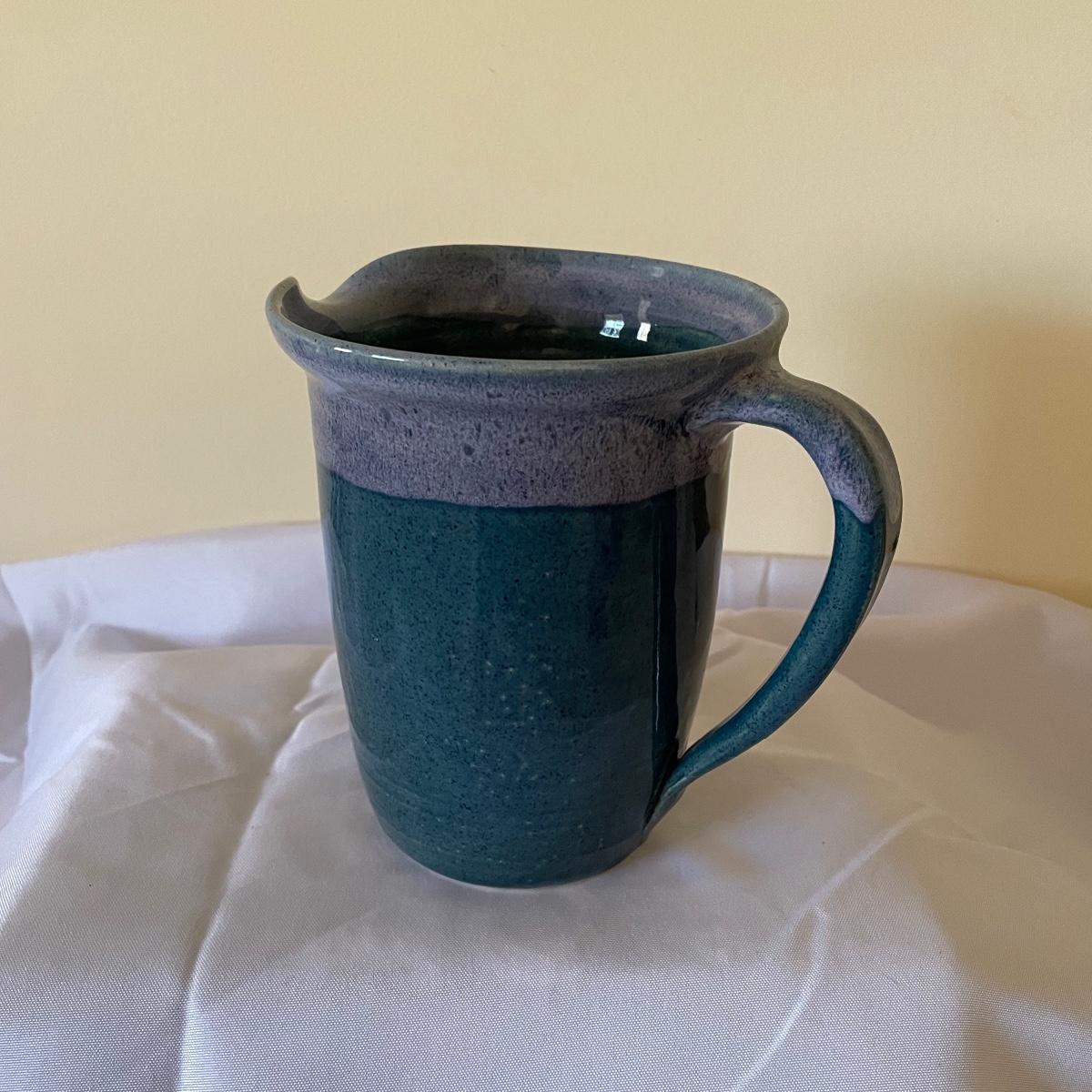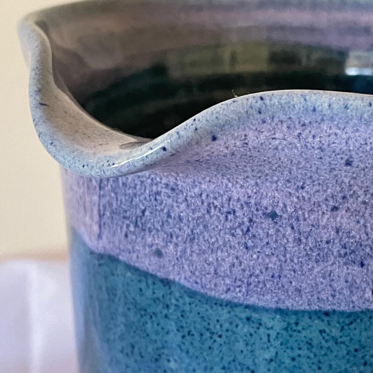 This lot has three beautifully crafted pieces by potter John Garrou of Black Mountain, NC. The larger pitcher is a blue and light purple glaze that measures 5” d x 6” tall. The small creamer and lidded sugar bowl are a match set.