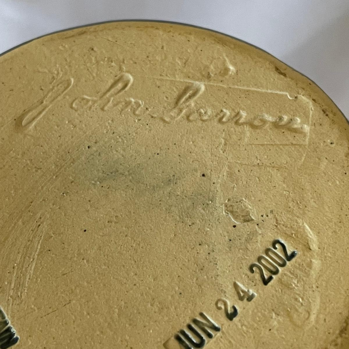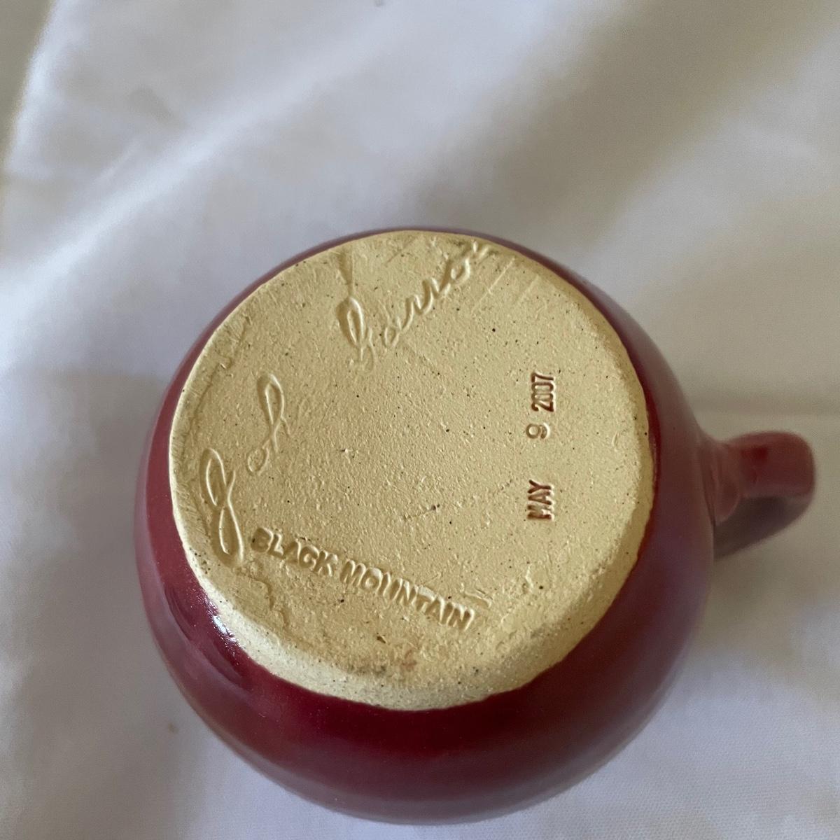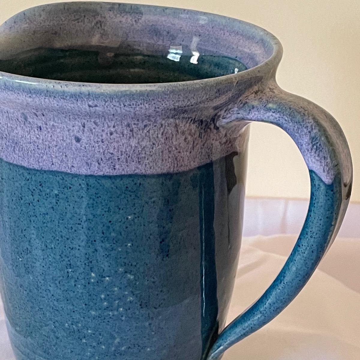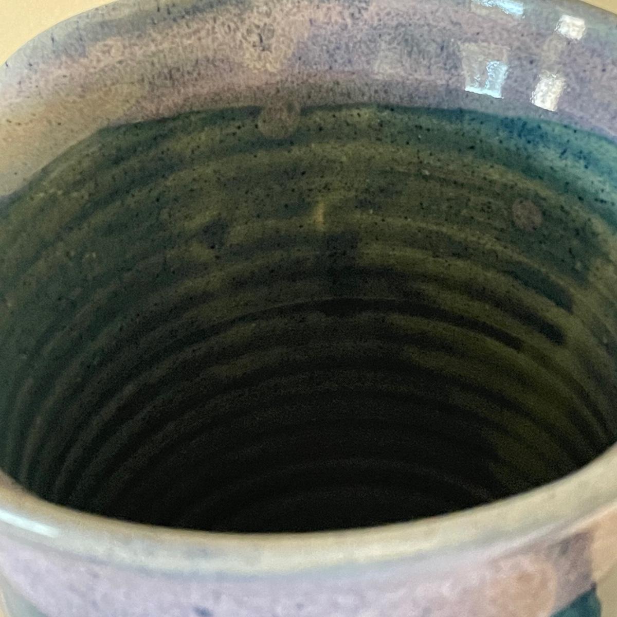 This lot has three beautifully crafted pieces by potter John Garrou of Black Mountain, NC. The larger pitcher is a blue and light purple glaze that measures 5” d x 6” tall. The small creamer and lidded sugar bowl are a match set.